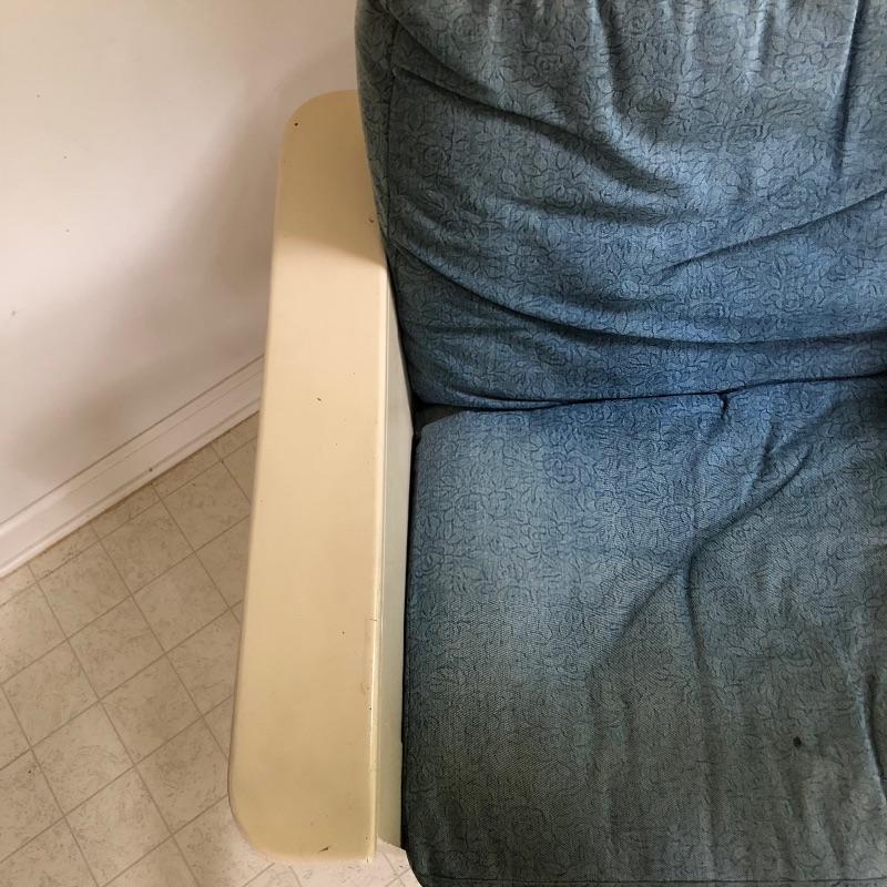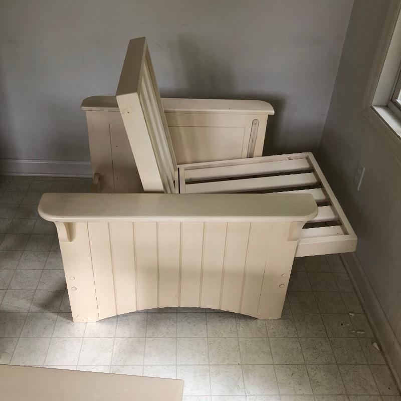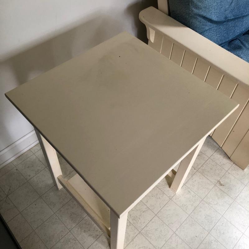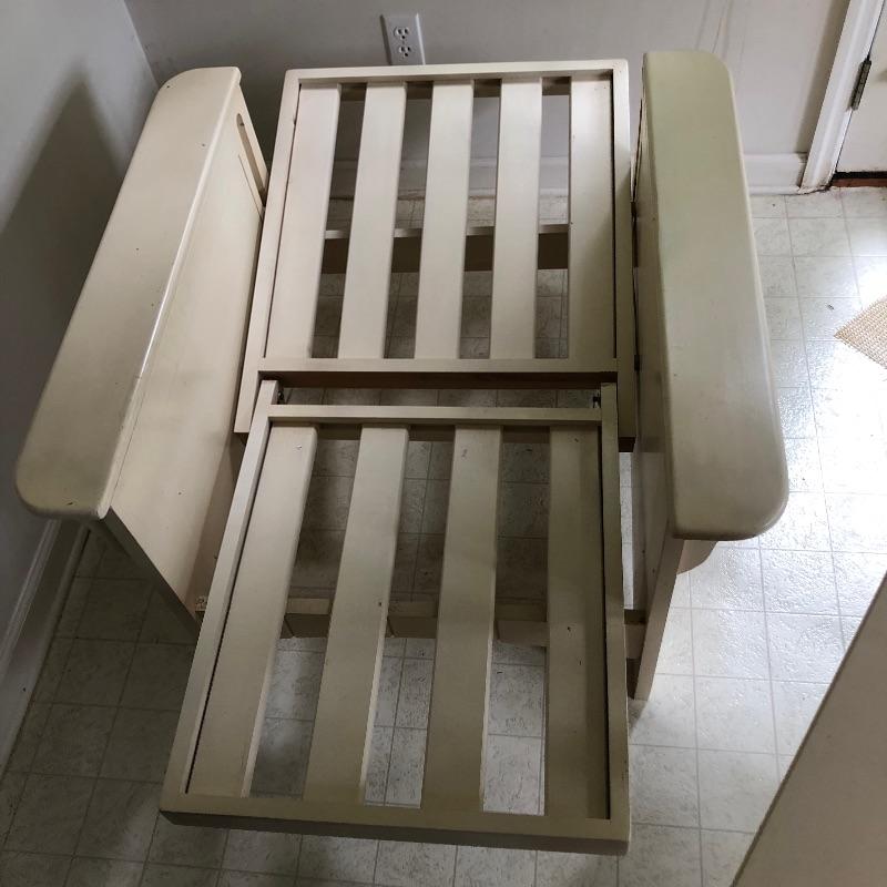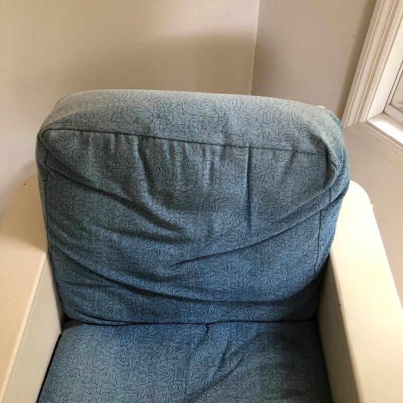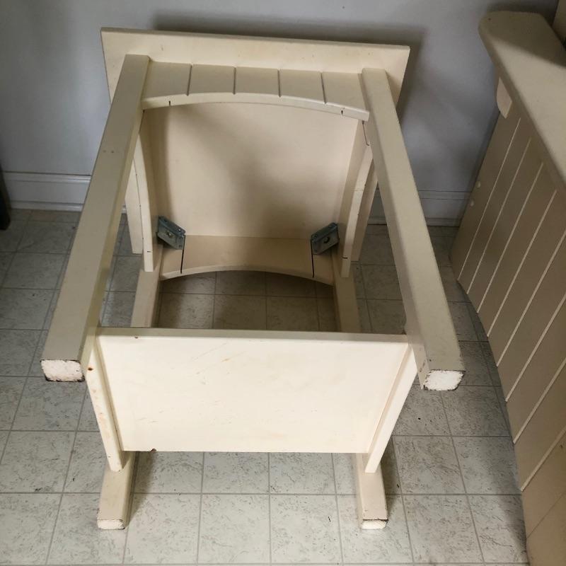 design together. All pieces are a creamy eggshell color. The comfortable chair cushion could do with a new seat cover as the current one has faded from the sun and has a small stain. The cover has a zipper and could be easily removed and replaced. See lots 45 & 135 for matching pieces.