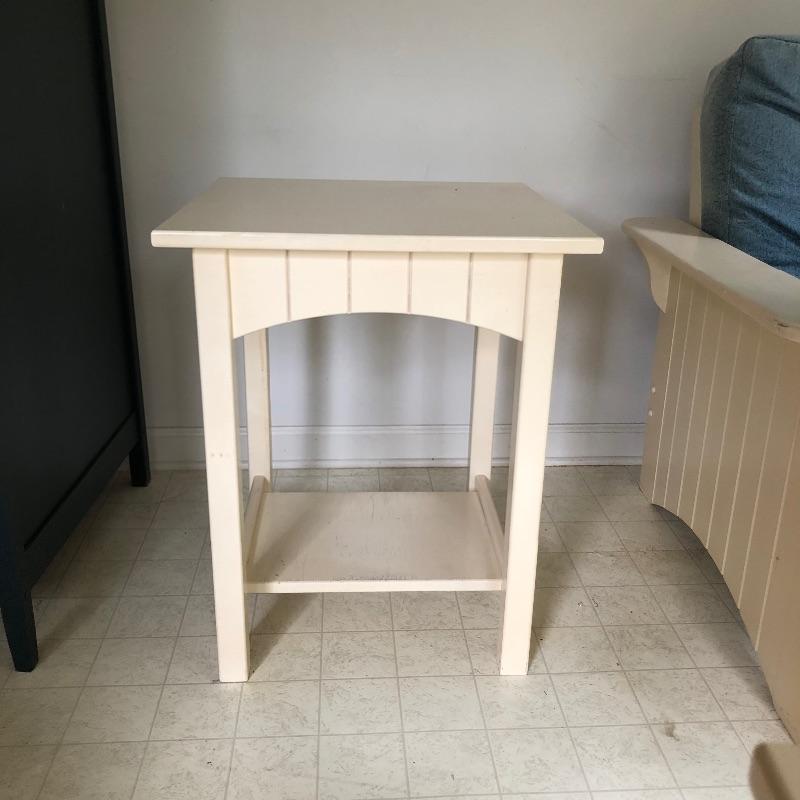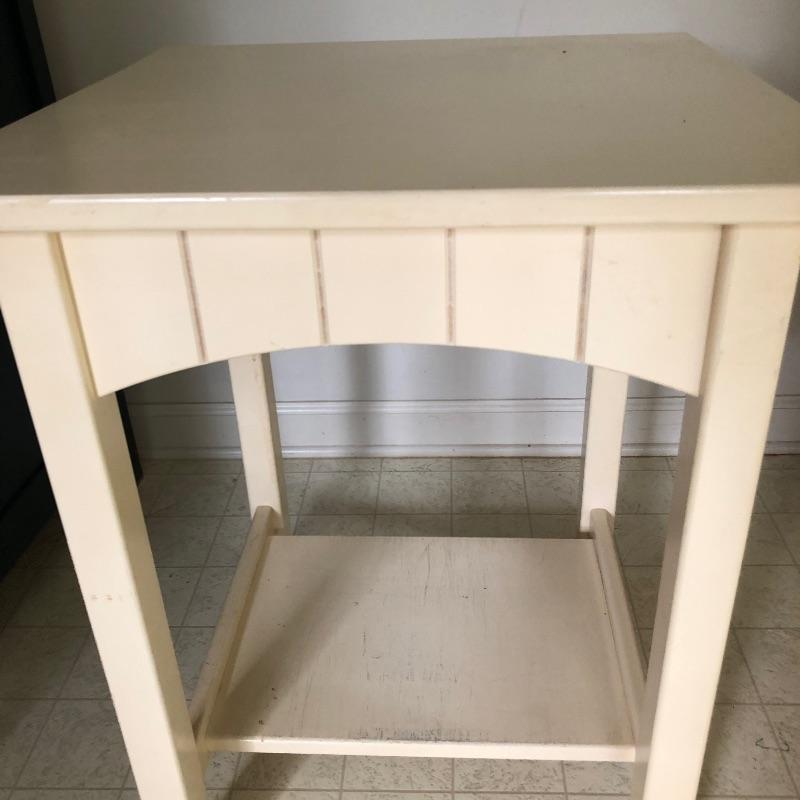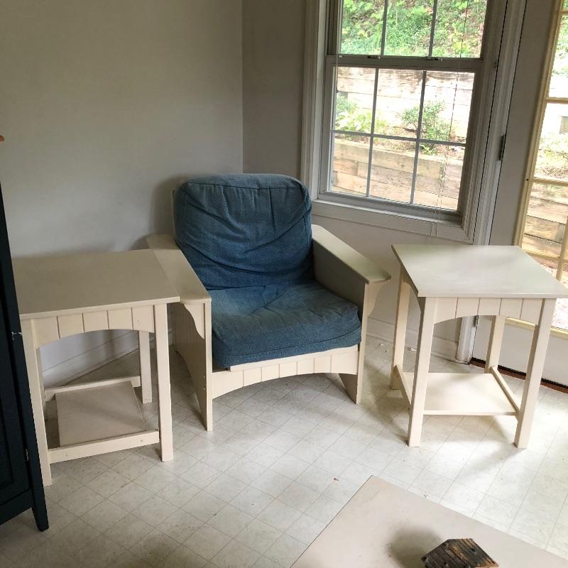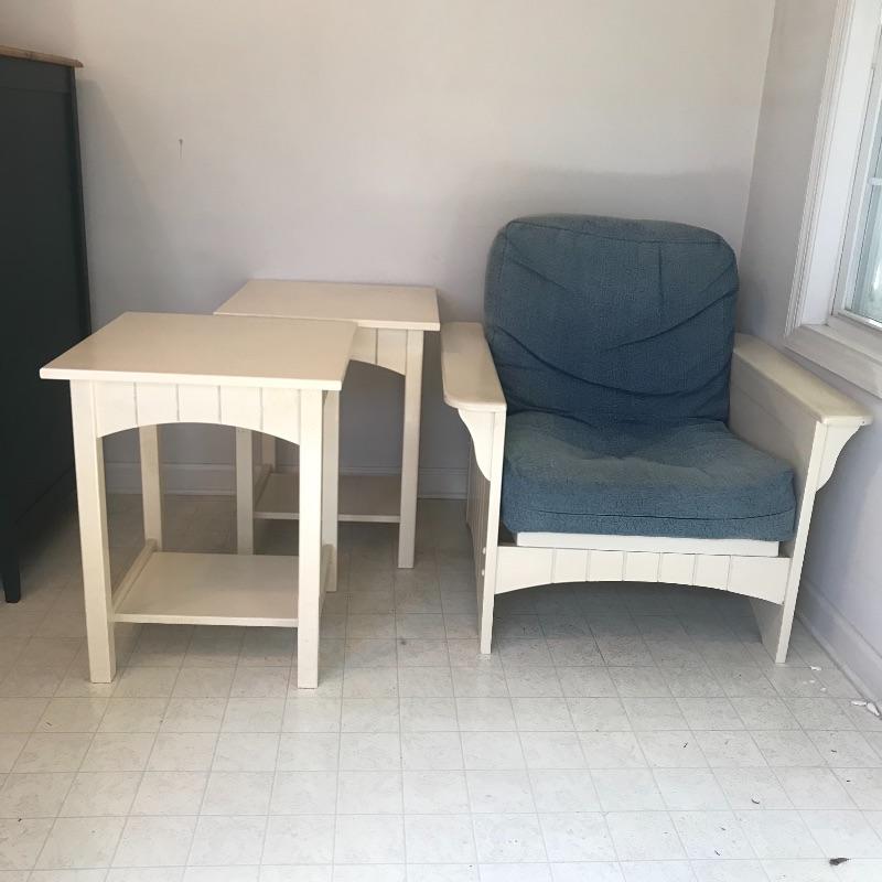 This chair and matching end tables have that New England Coastal feel. The chair features a dual facIng design, so you can always face the sun; it takes all of ten seconds to switch it without scratching your floors! The matching end tables will tie your room