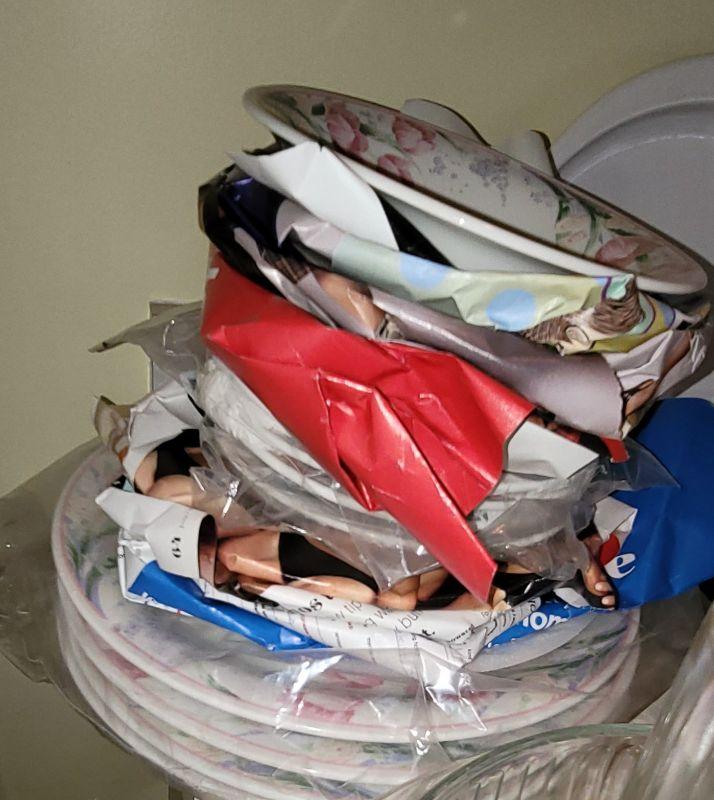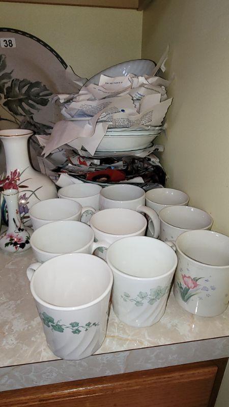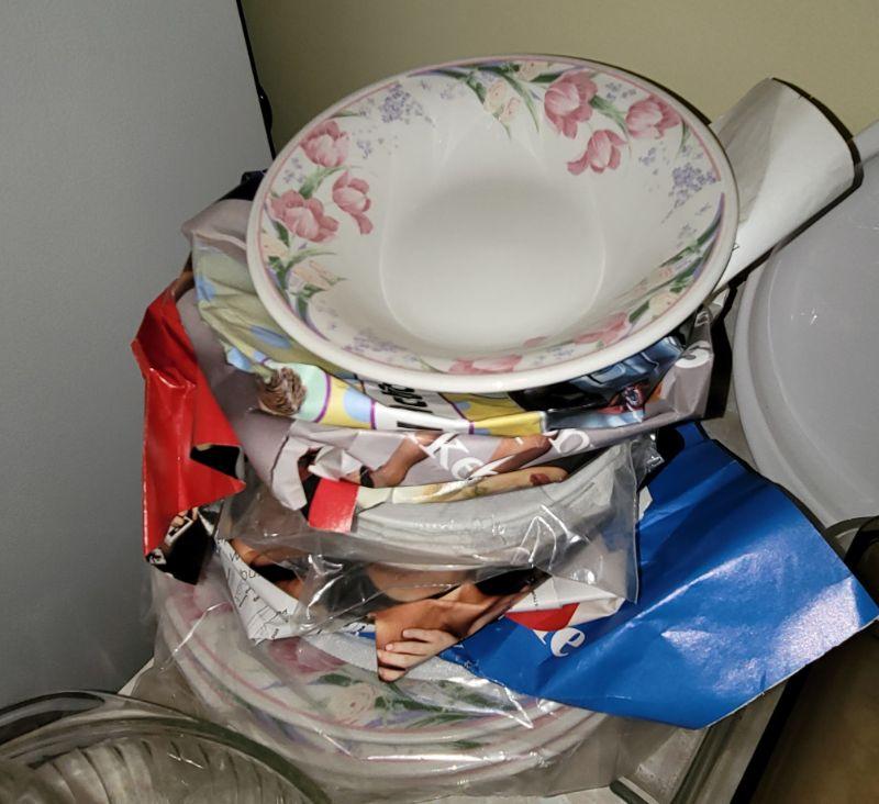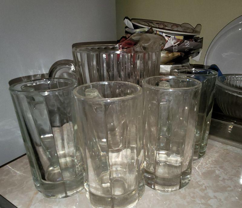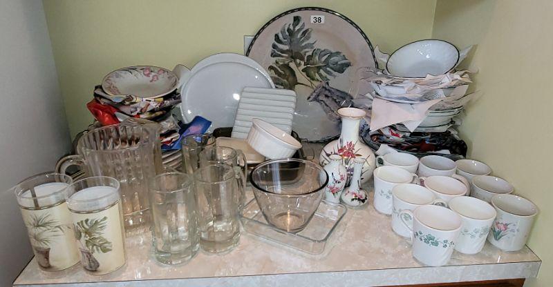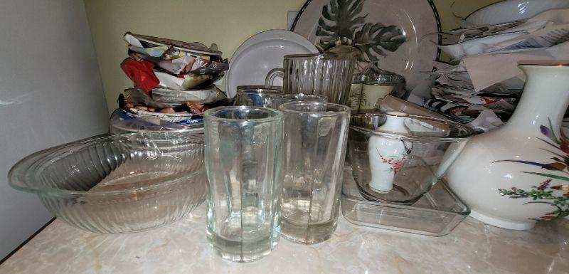 Corningware cookware and dishes, lg. plastic platter with 2 matching cups, glass pitcher and matching mugs, dishes and more
