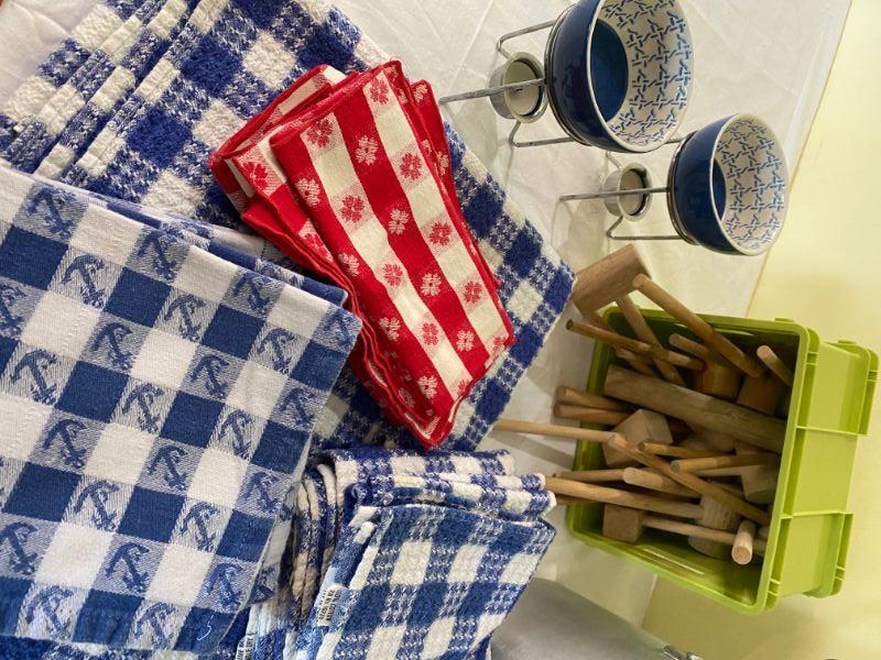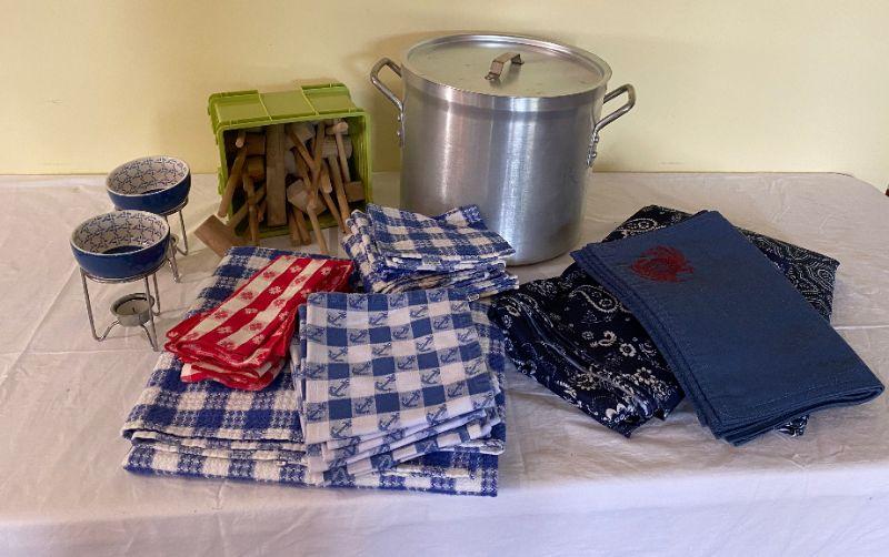 metal stockpot with crab themed cotton napkins , tablecloths , butter warmers and crab mallets