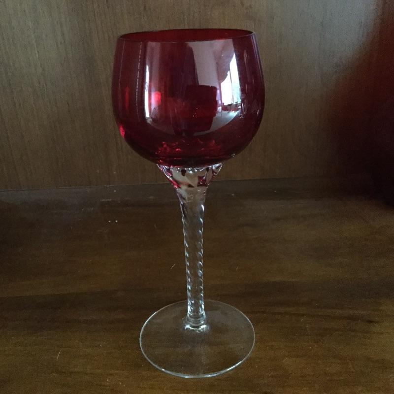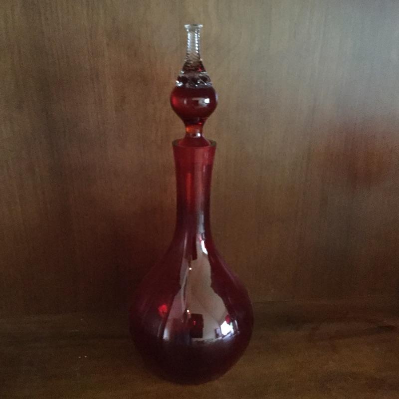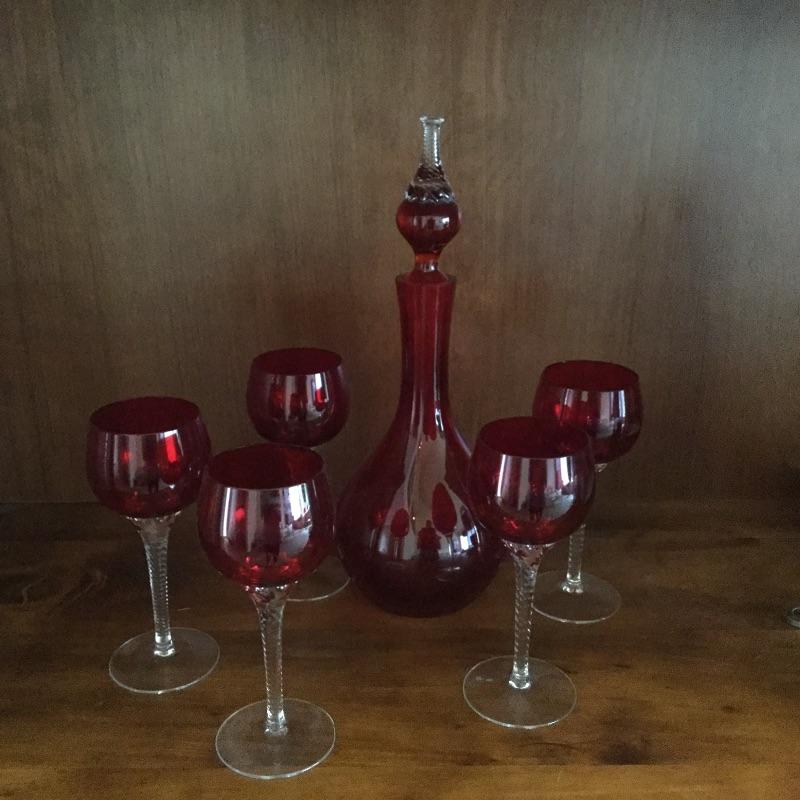 This is a striking set of Red and Clear Blown Glass. Included are Five Wine Glasses and One Decanter with Stopper.