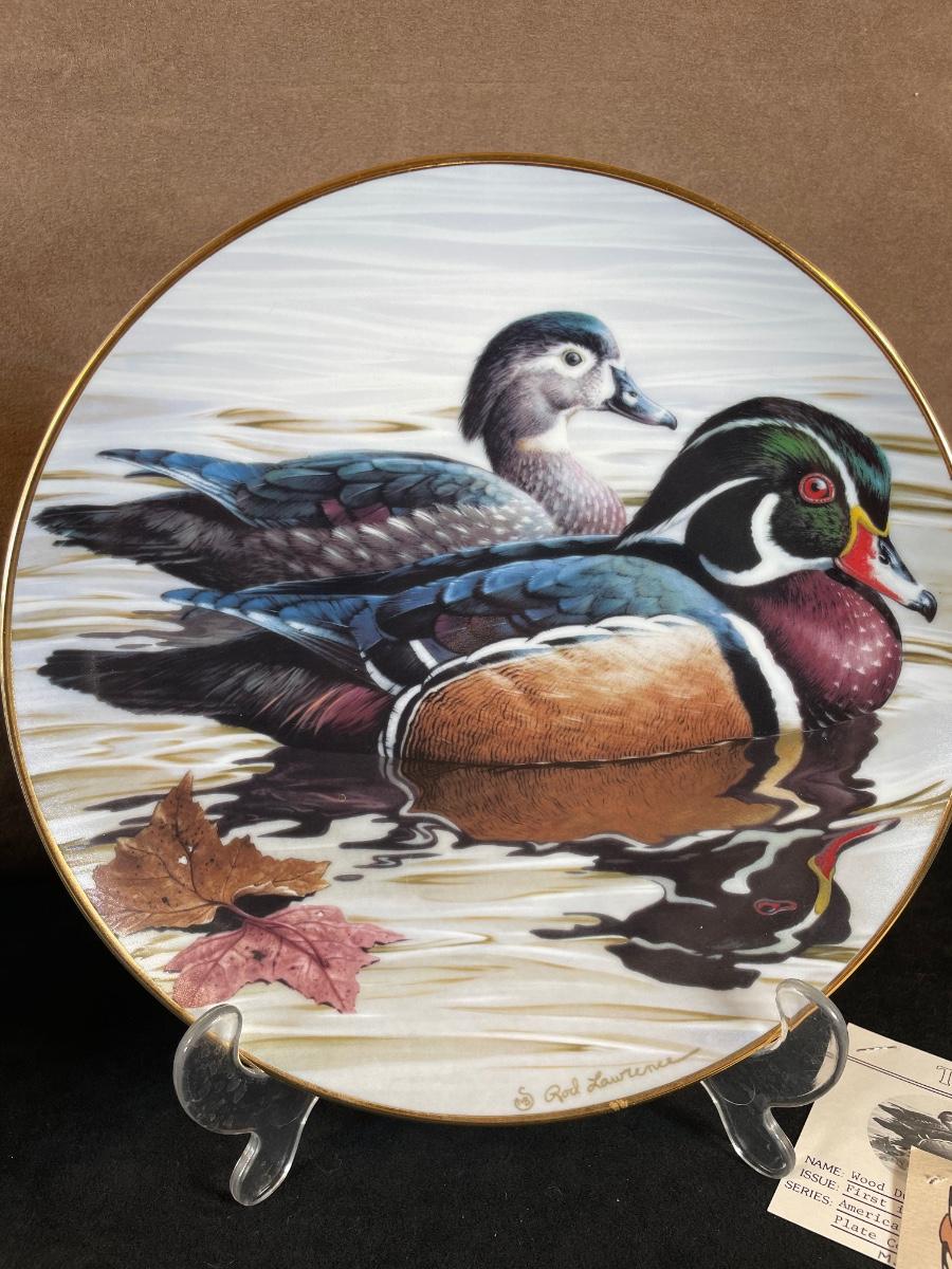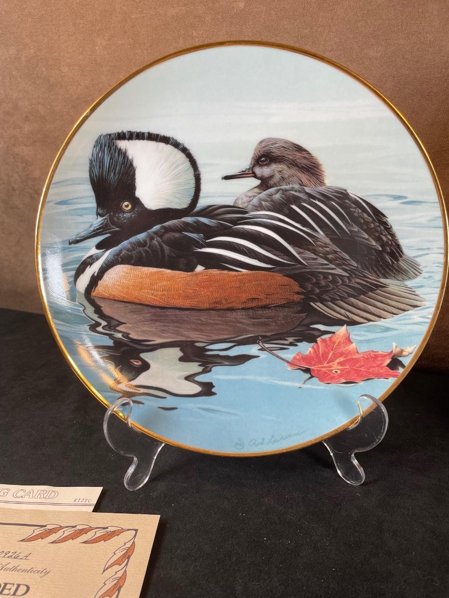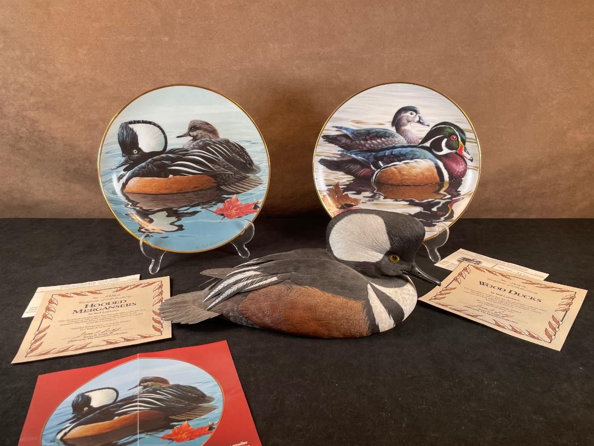 Resin Duck Figure and two collectible plats from the Hamilton Collection "American Waterbirds" by Rod Lawrence with Certificates of Authenticity