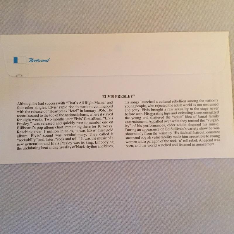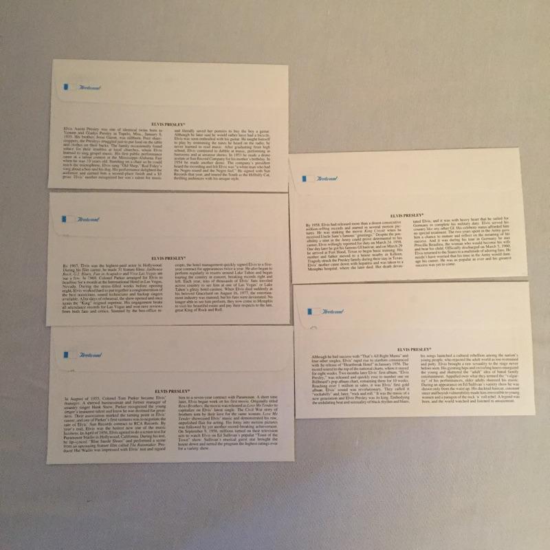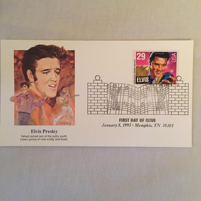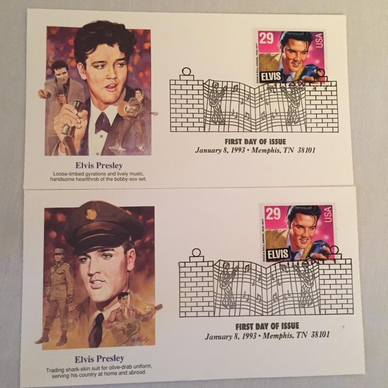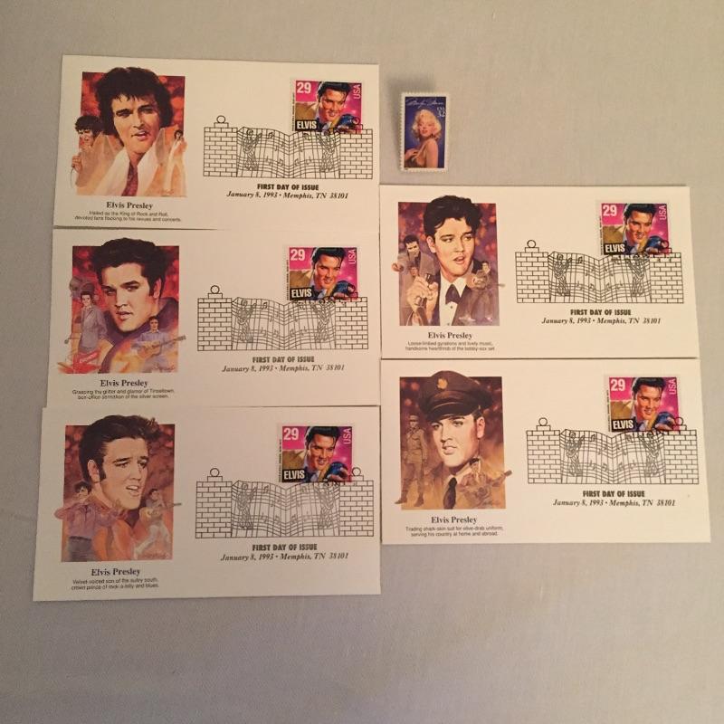 Set of five Elvis Presley first day of issue Stamps on envelopes stamped in Memphis, TN on January 8 1993. Lot also contains one Marilyn Monroe stamp sealed in plastic with pin on back.