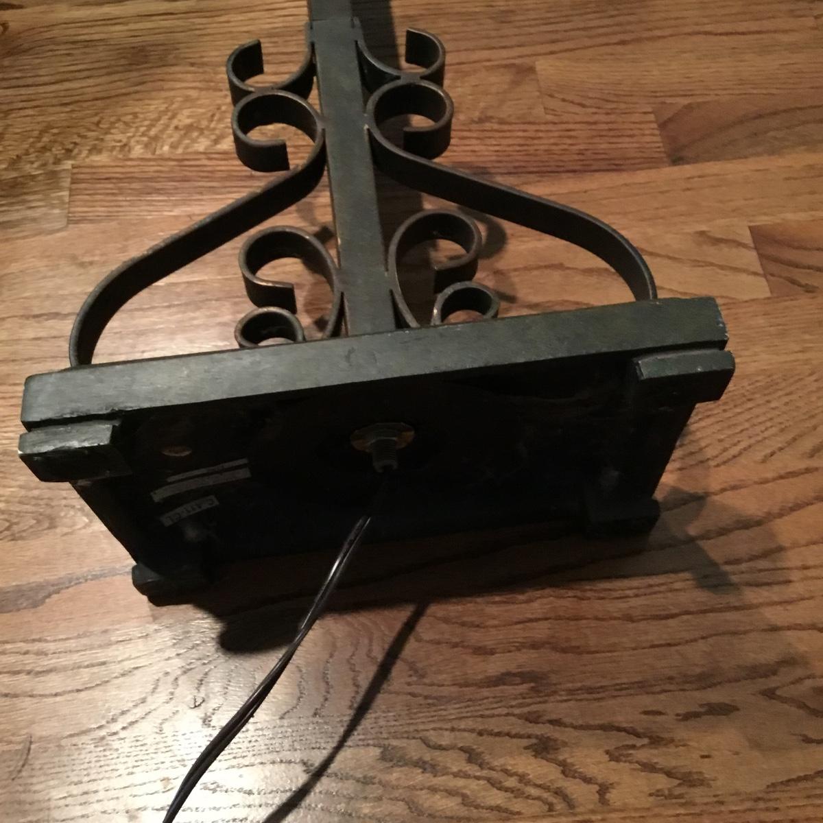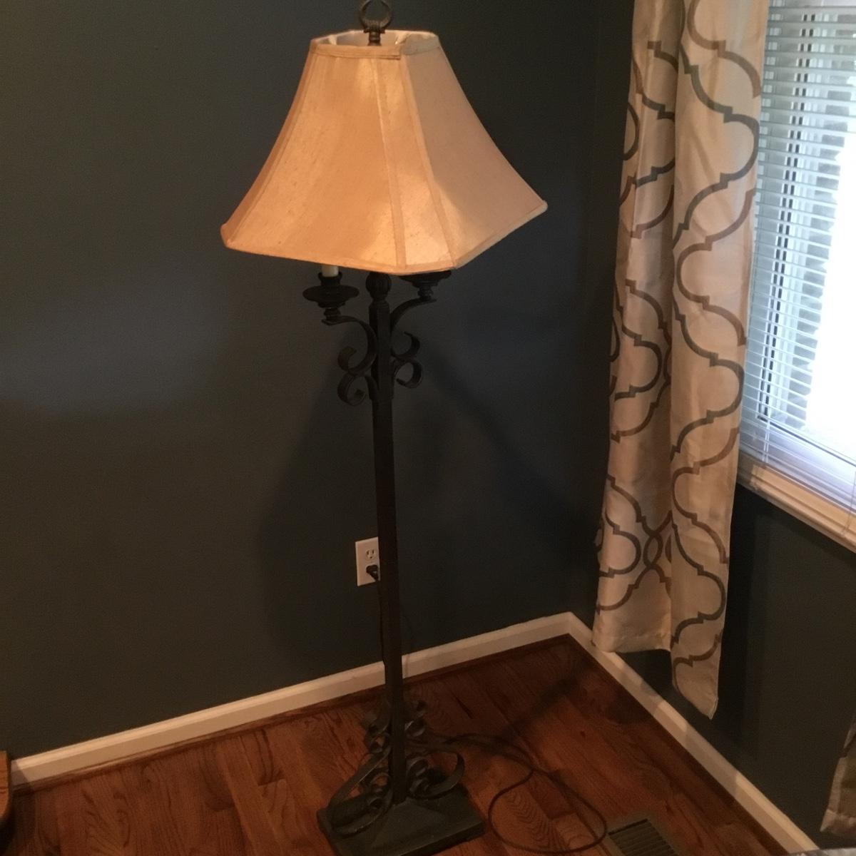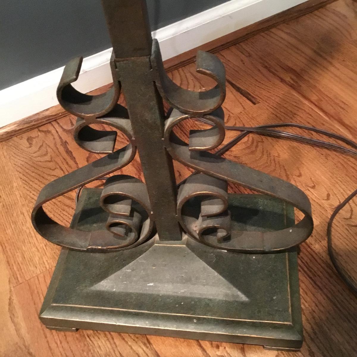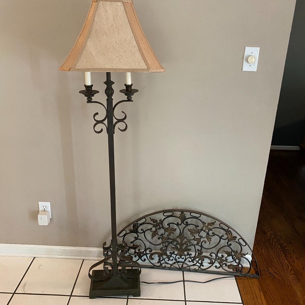 Lot includes a floor lamp and metal wall art. The lamp’s metal features and creme colored lamp shade stands 61” tall. The semi-circle metal wall art measures 38”x16”. Notice the similar curves in the art and details on the lamp. See photos. Local pickup only. The metal lampshade connection to the lamp is a little bent. Could be easily be bent back.