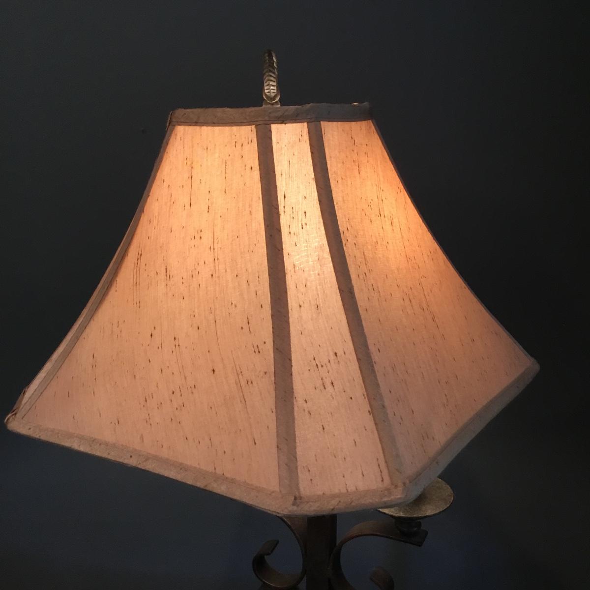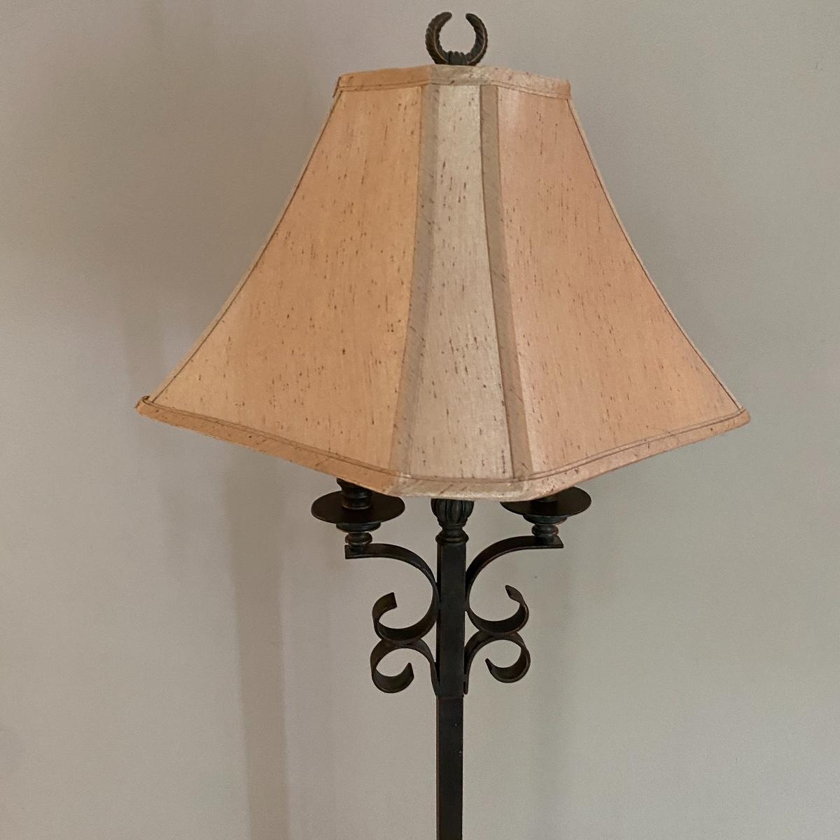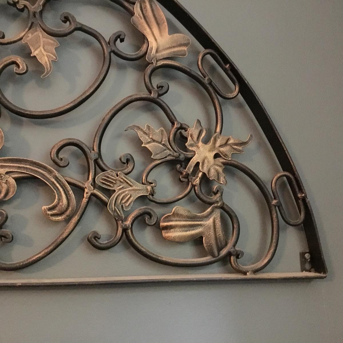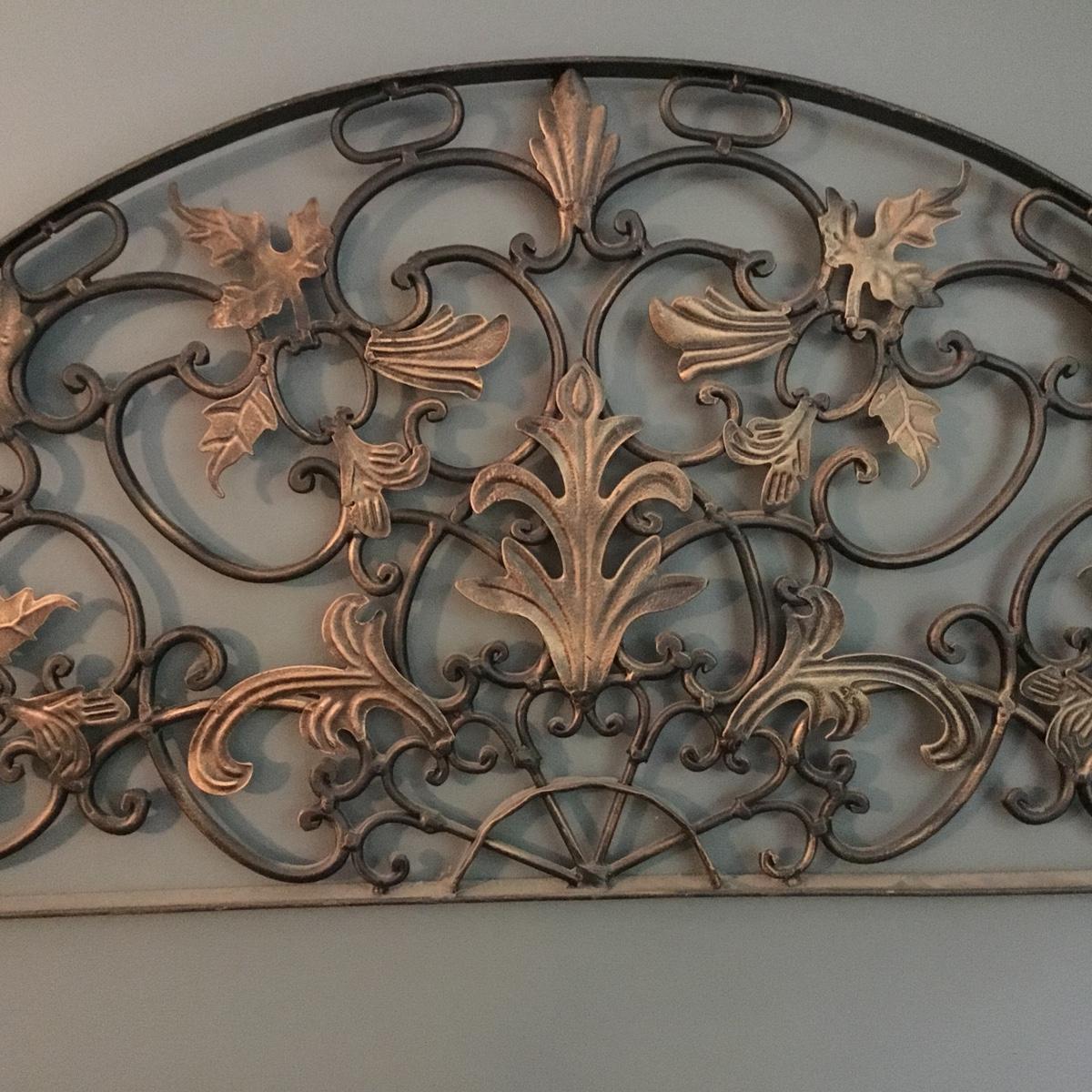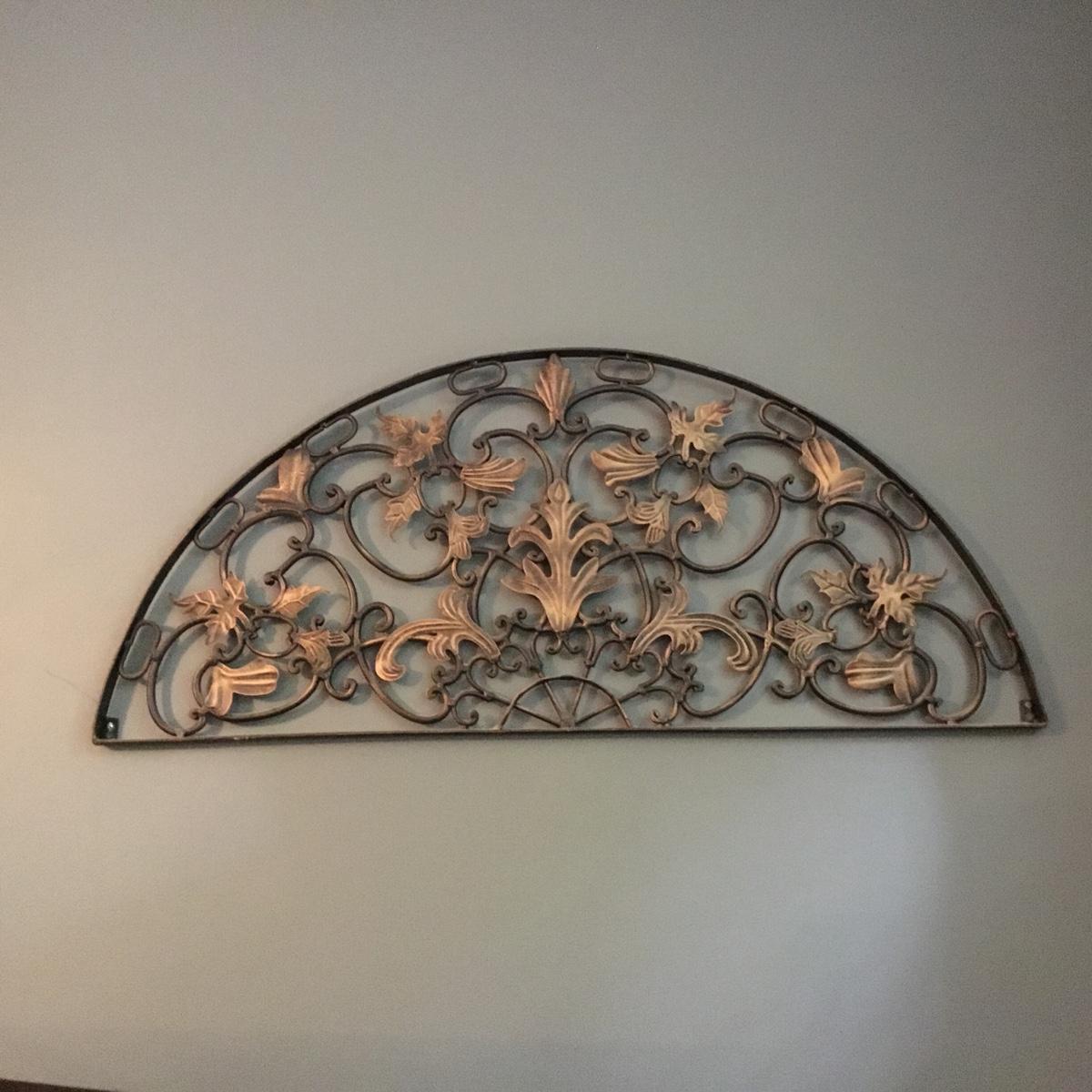 Lot includes a floor lamp and metal wall art. The lamp’s metal features and creme colored lamp shade stands 61” tall. The semi-circle metal wall art measures 38”x16”. Notice the similar curves in the art and details on the lamp. See photos. Local pickup only. The metal lampshade connection to the lamp is a little bent. Could be easily be bent back.
