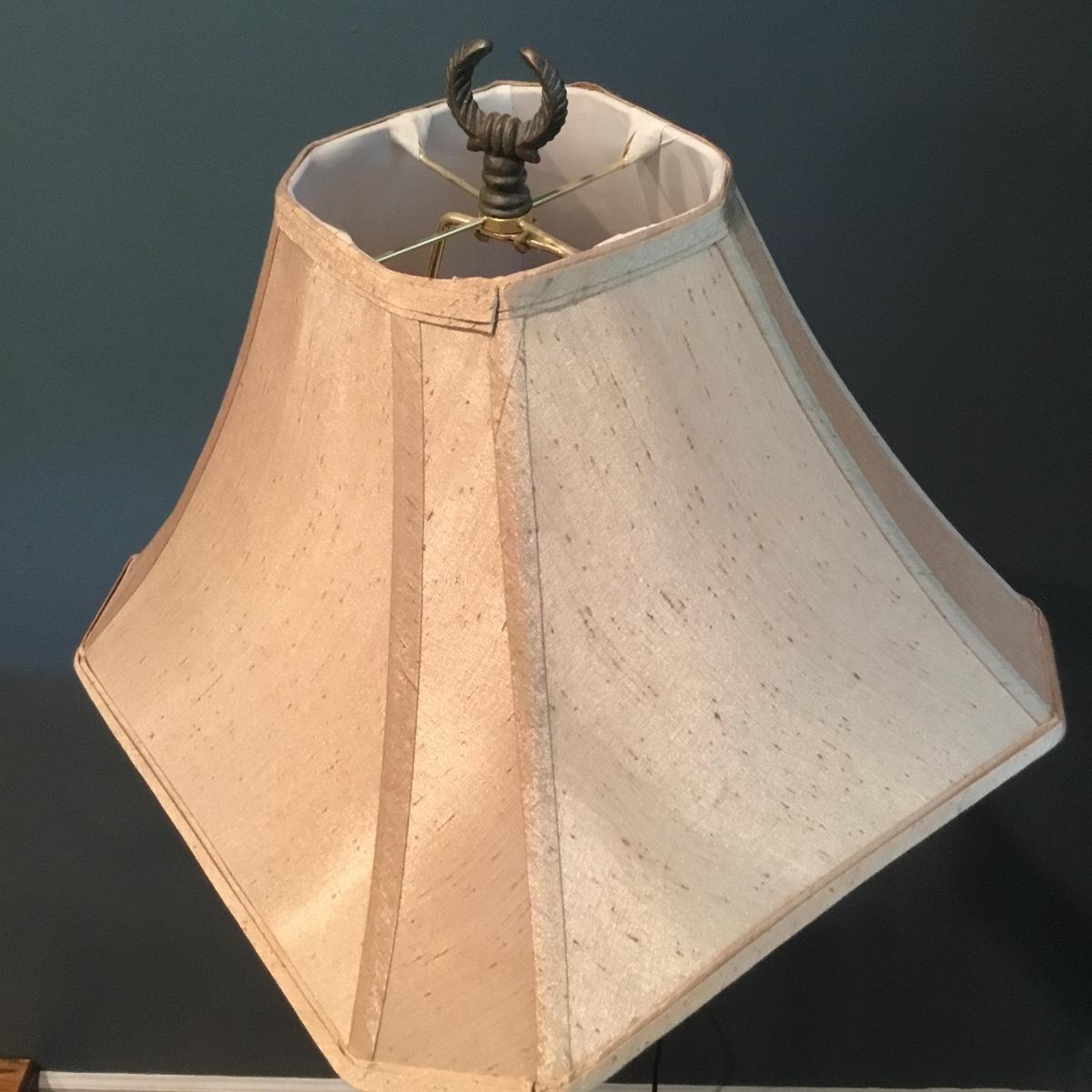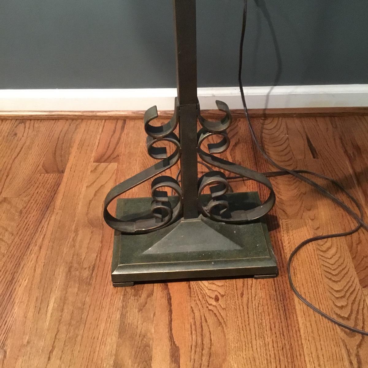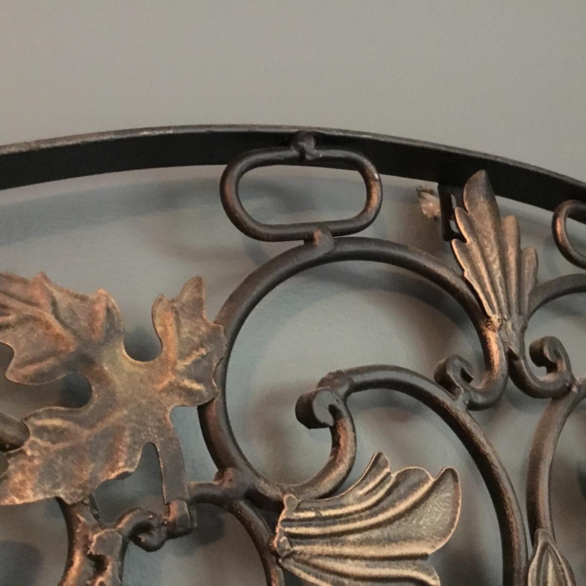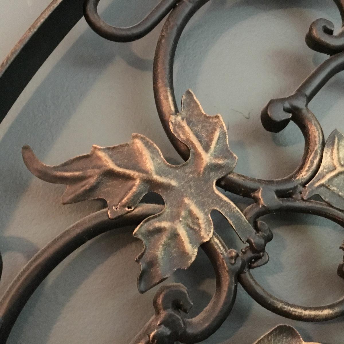Lot includes a floor lamp and metal wall art. The lamp’s metal features and creme colored lamp shade stands 61” tall. The semi-circle metal wall art measures 38”x16”. Notice the similar curves in the art and details on the lamp. See photos. Local pickup only. The metal lampshade connection to the lamp is a little bent. Could be easily be bent back.