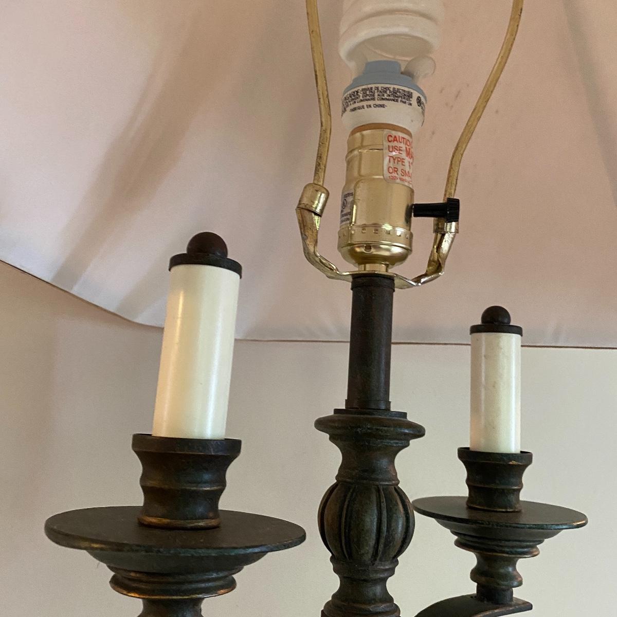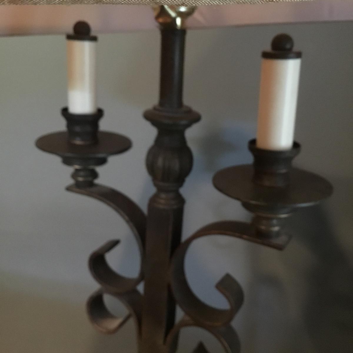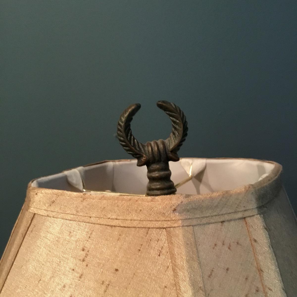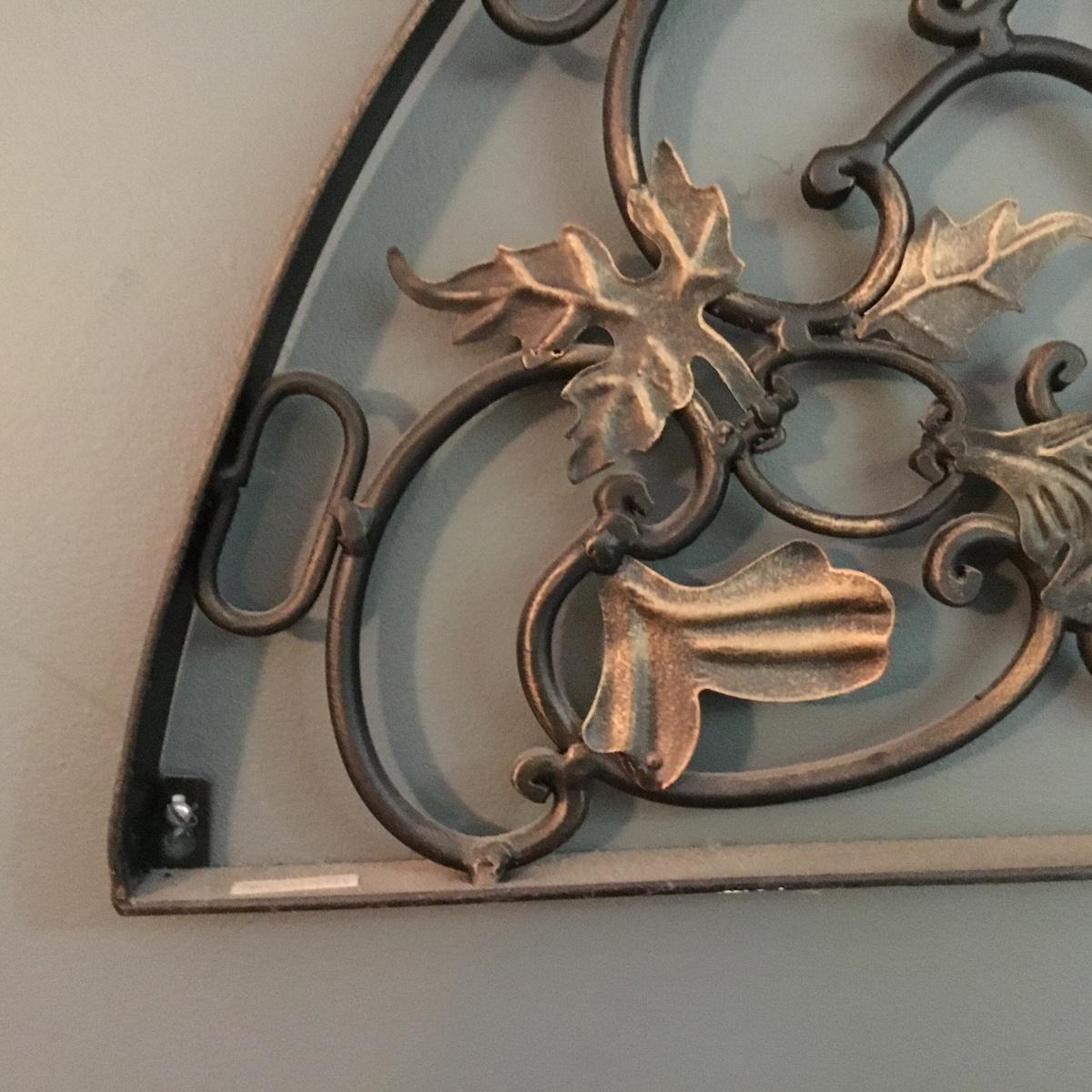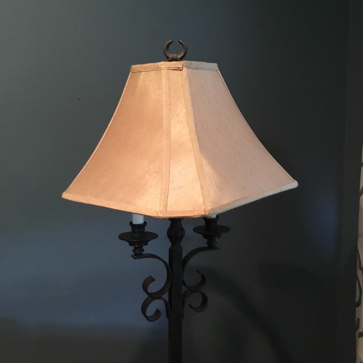Lot includes a floor lamp and metal wall art. The lamp’s metal features and creme colored lamp shade stands 61” tall. The semi-circle metal wall art measures 38”x16”. Notice the similar curves in the art and details on the lamp. See photos. Local pickup only. The metal lampshade connection to the lamp is a little bent. Could be easily be bent back.