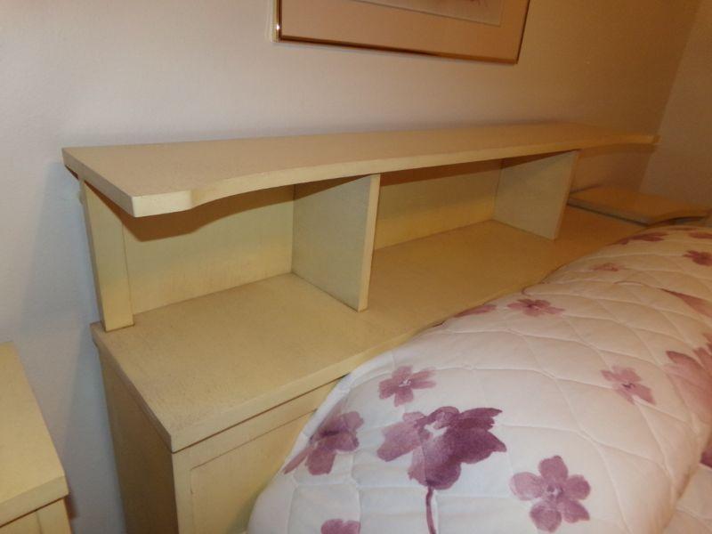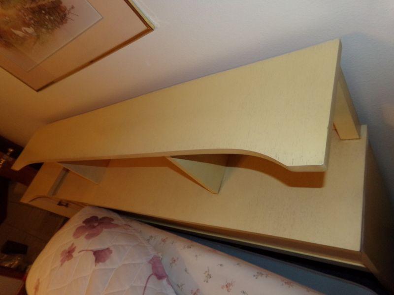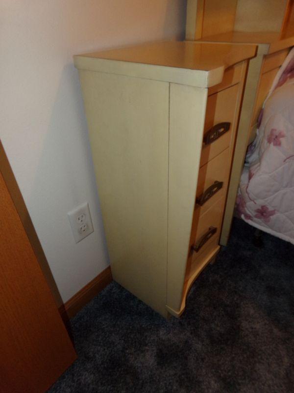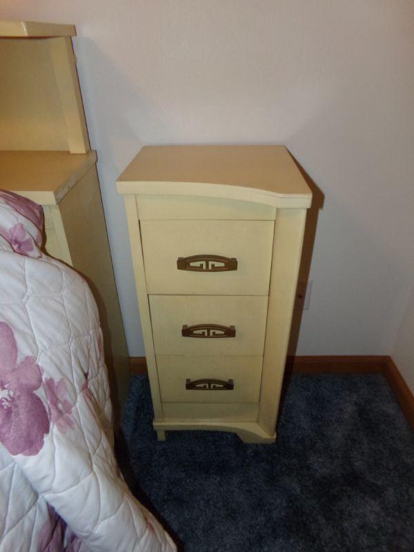 COMPLETE FULL SIZE BED WITH HEADBOARD AND 2 NIGHT STANDS W/ASIAN TYPE HANDLES..