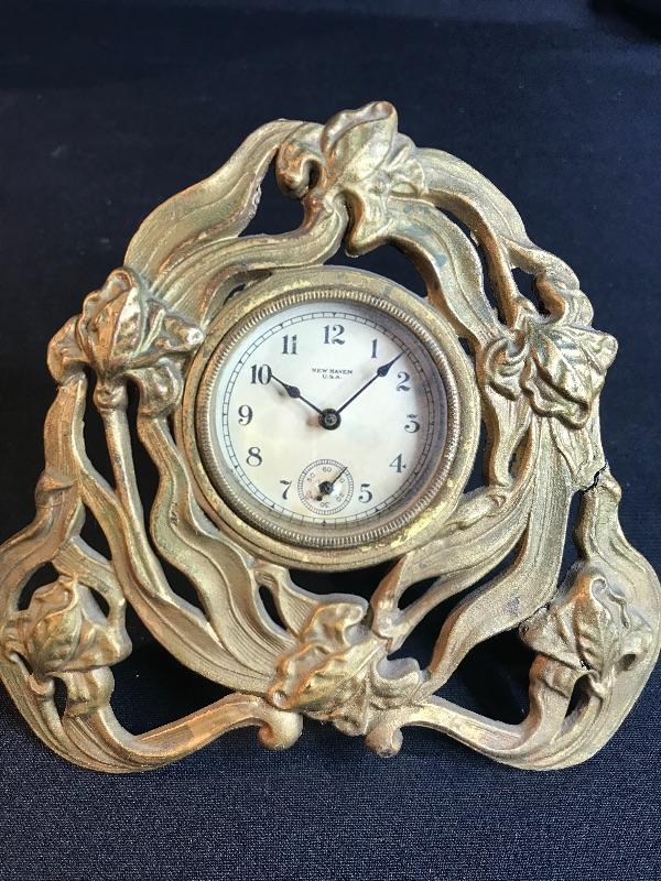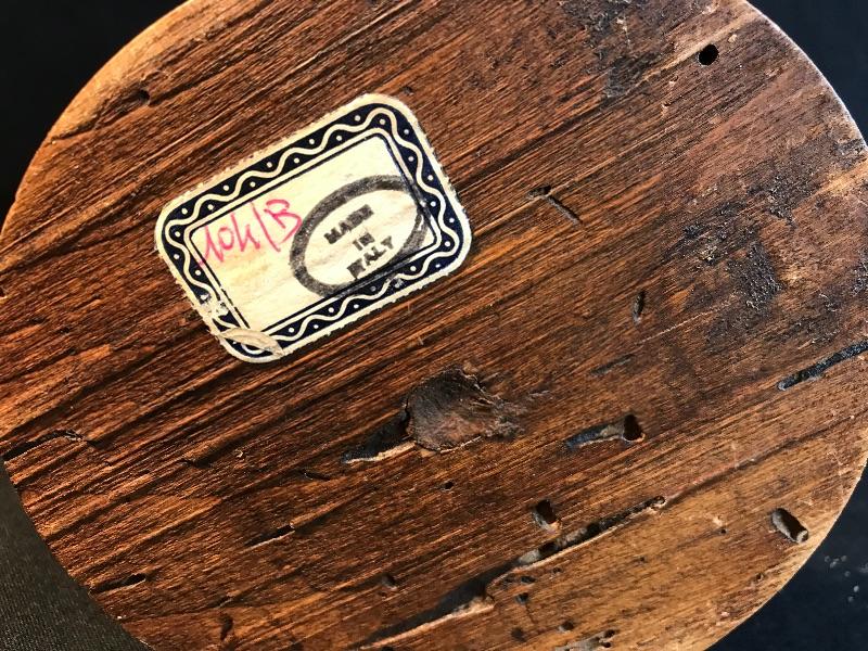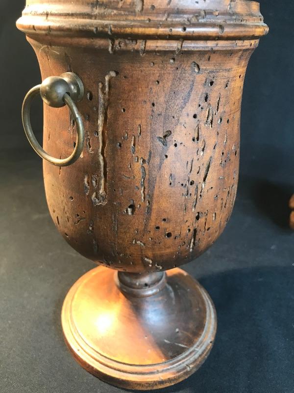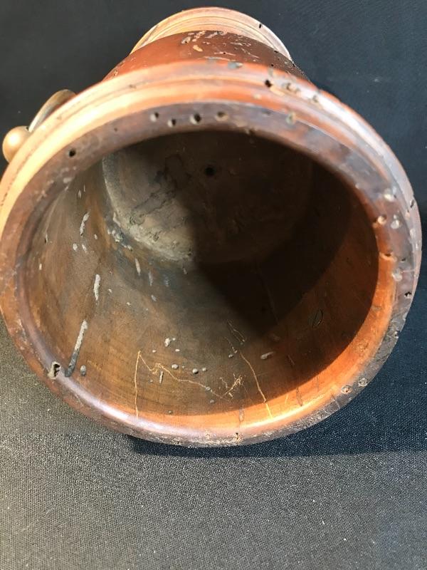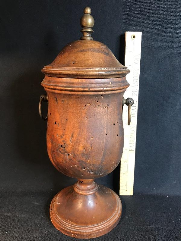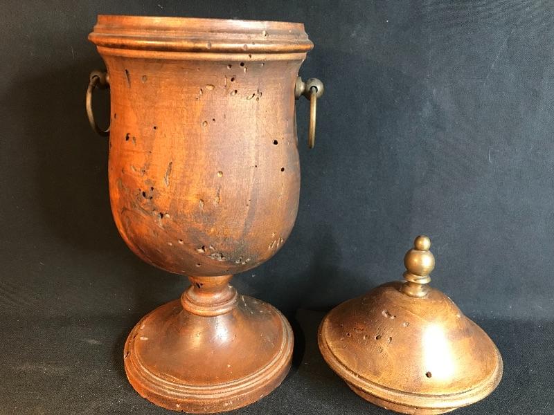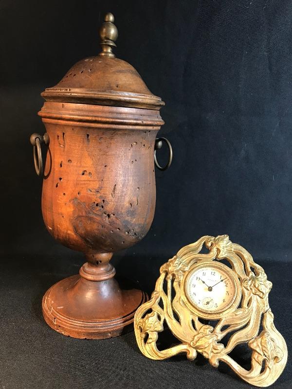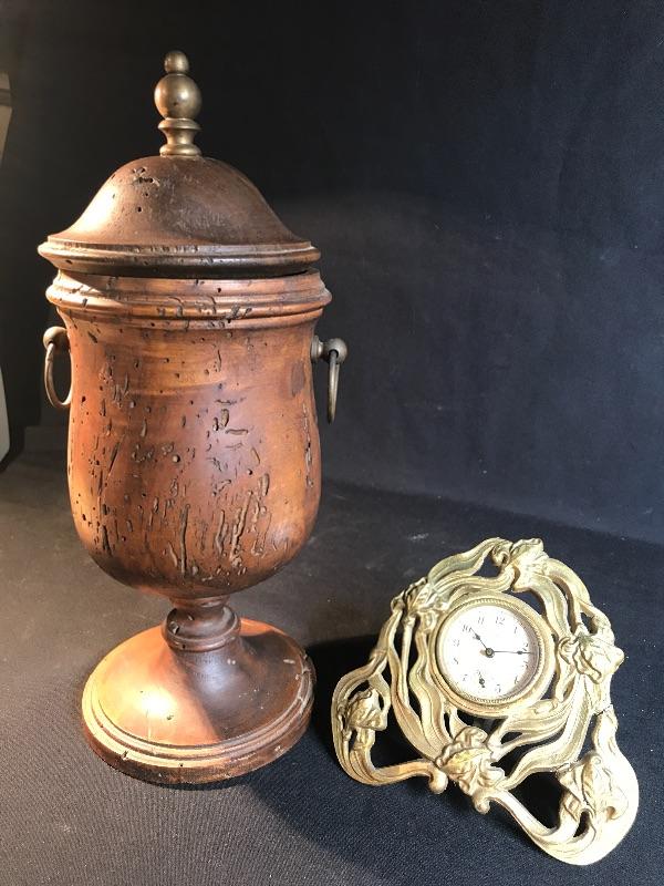 Wooden urn handcrafted in Italy. This is a unique piece and very collectible. Hand made with brass handles and finial, and faux wood wormholes. Included is an Art Deco, New Haven wind up clock in working condition. A small crack in metal. Please see all pictures for content of the lot, condition of the lot, and measurements if taken. Pictures are the best representation of the items listed and items are untested unless indicated in description. Thank you for looking and have fun bidding