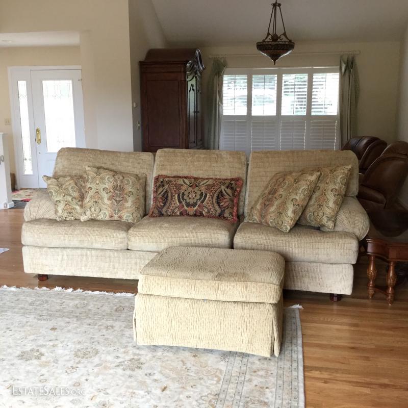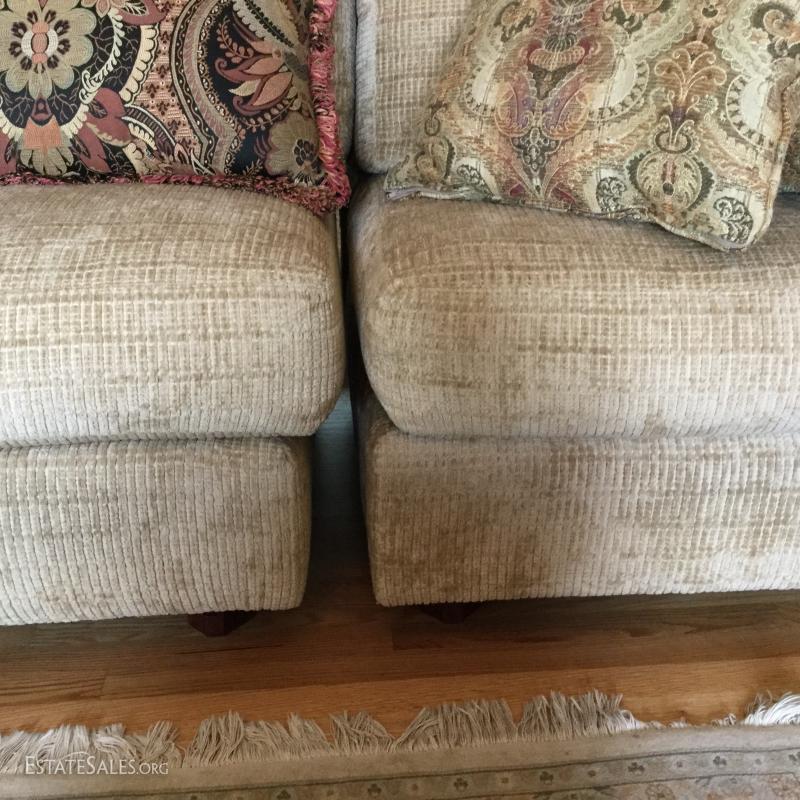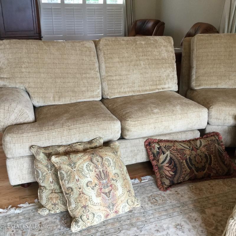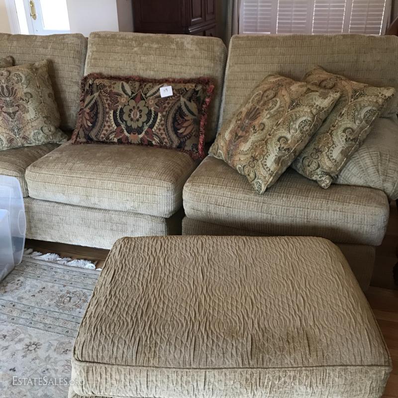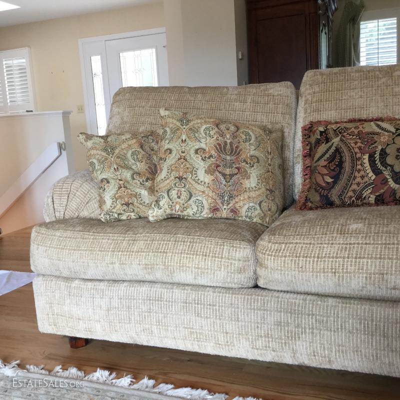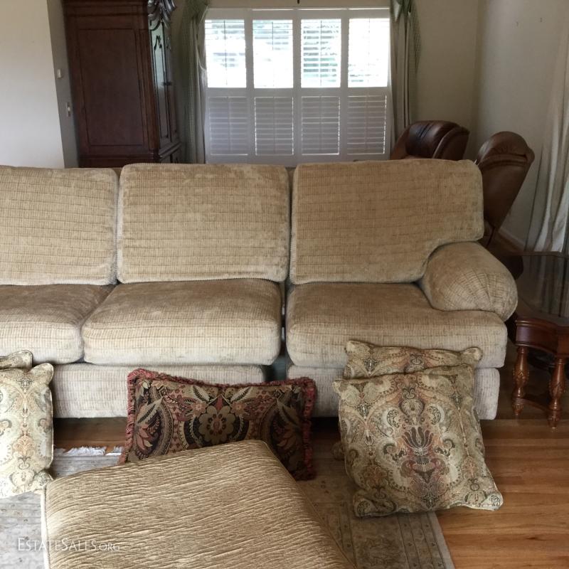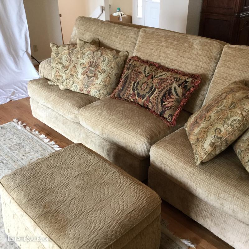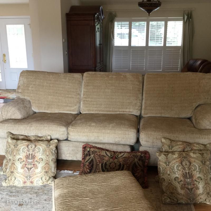 Tan chenille fabric Henredon couch 113" l x 45"w x 39"h and matching ottoman 34"l x 25"w x. 18"h (not the same fabric as couch). Excellent condition. Comes with 5 throw pillows.