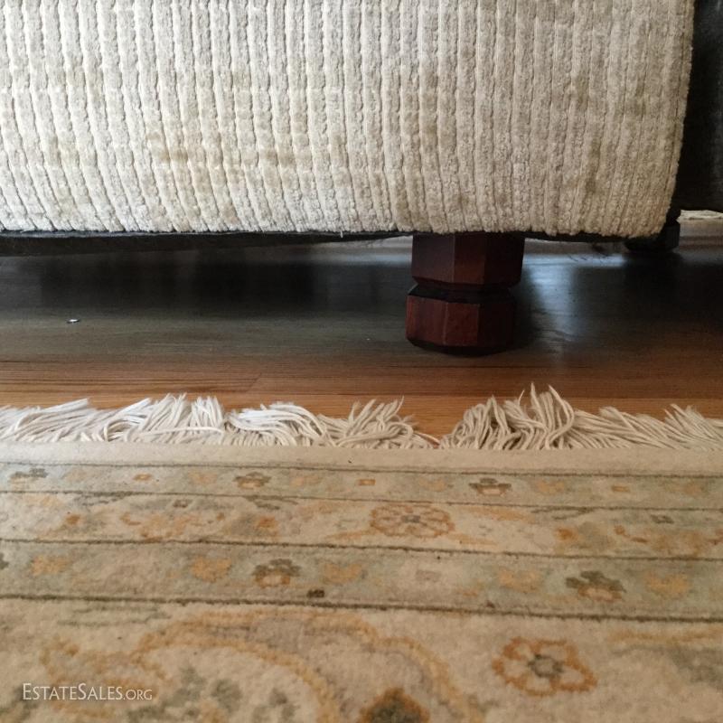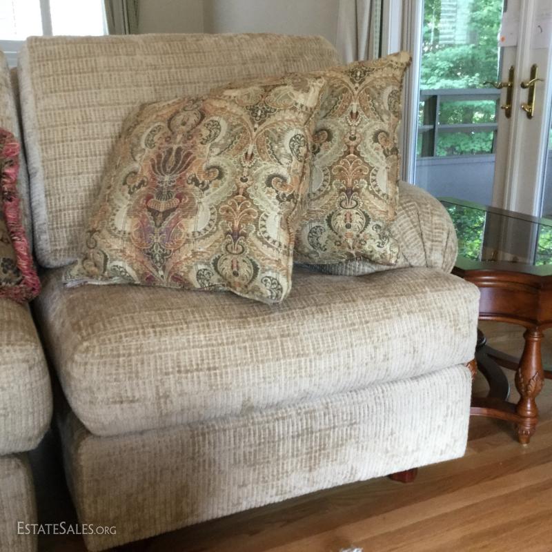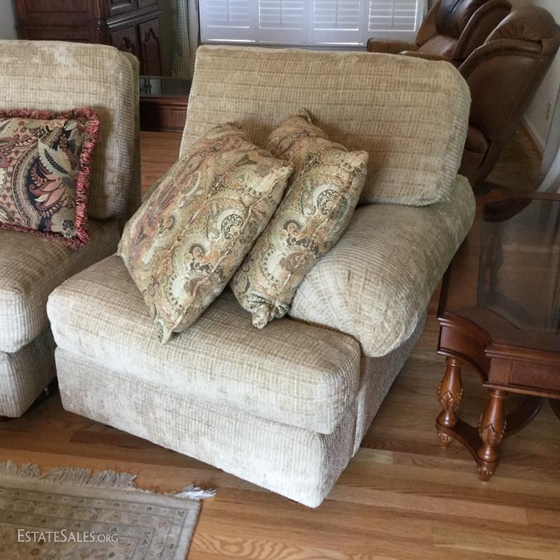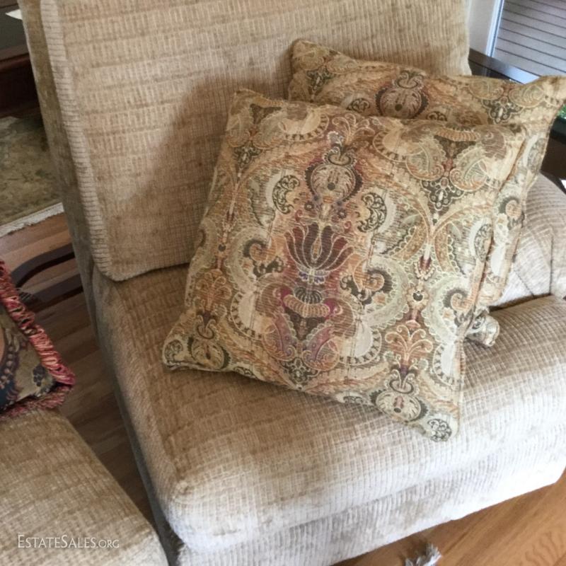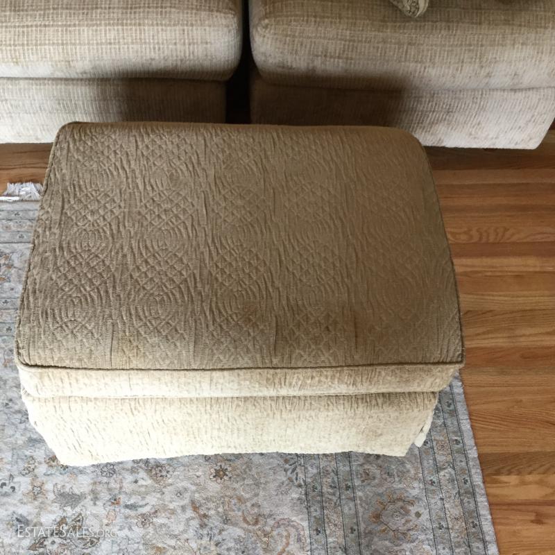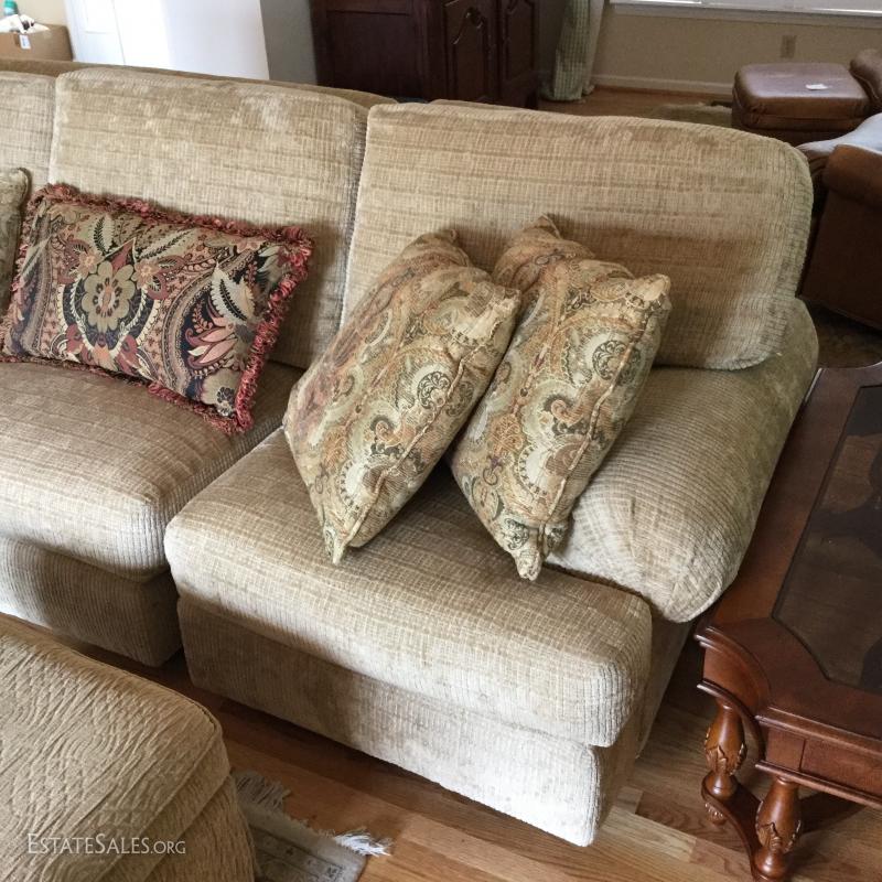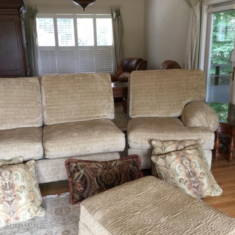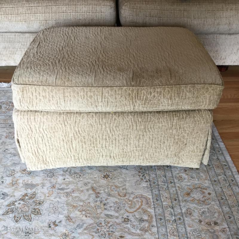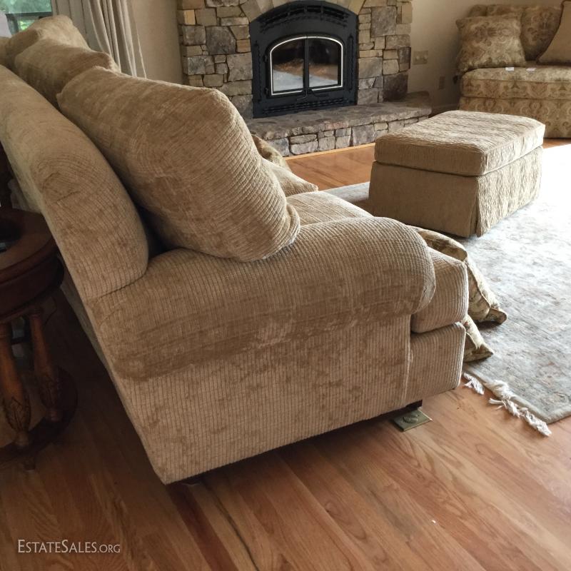 Tan chenille fabric Henredon couch 113" l x 45"w x 39"h and matching ottoman 34"l x 25"w x. 18"h (not the same fabric as couch). Excellent condition. Comes with 5 throw pillows.