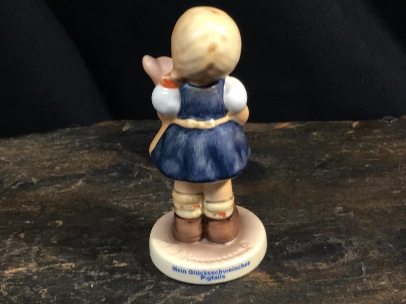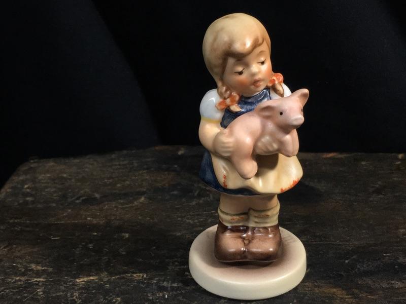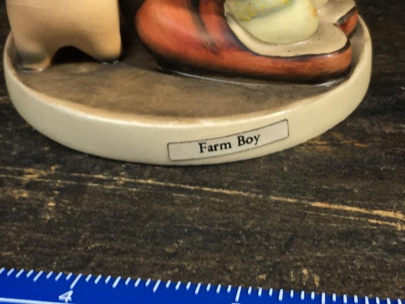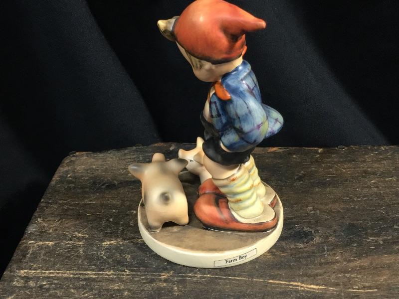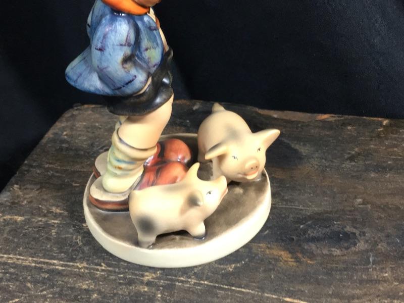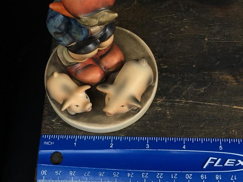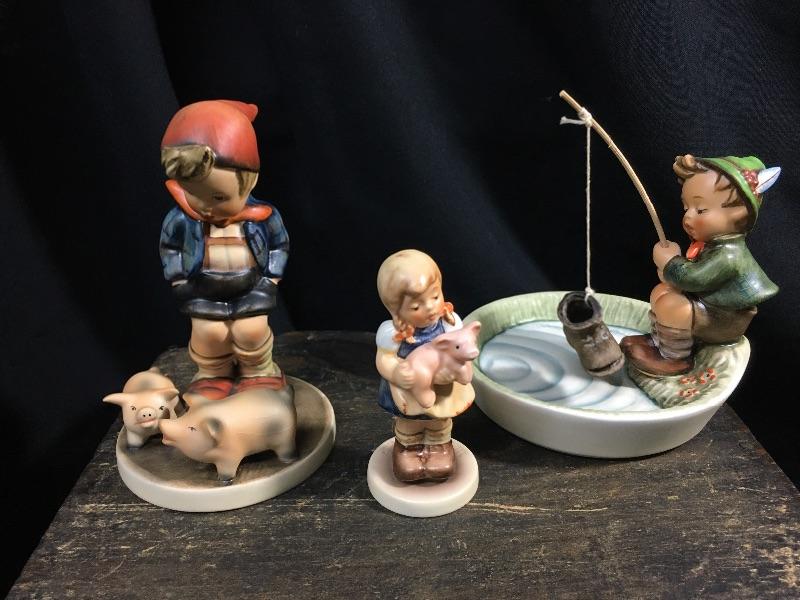 This lot of 3 Hummels contains Hummel #373 “Just Fishing”, #2052 “Pigtails”, and #66 “Farm Boy”. “Just Fishing” is a TMK 6 Hummel and is in mint condition with no signs of crazing. “Pigtails” is a TMK 7 Hummel and is also in mint condition with no signs of crazing. “Farm boy” is a TMK 3SS and has light crazing on the pigs of its figure, as shown in the pictures.