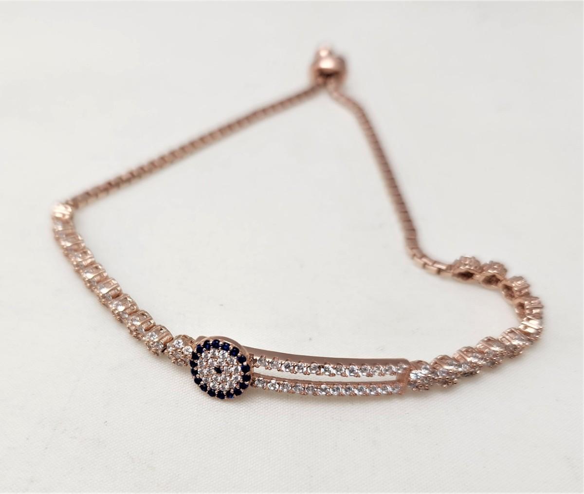 Vintage gold toned bracelet with 11 vintage charms (some Sterling), very pretty comtemporary rose gold colored bracelet with slide clasp (set with crystals - it's a beauty - no marks) and a sterling silver (marked) eternity style bracelet set with CZs. I would be willing to ship these - you pay priority postage.