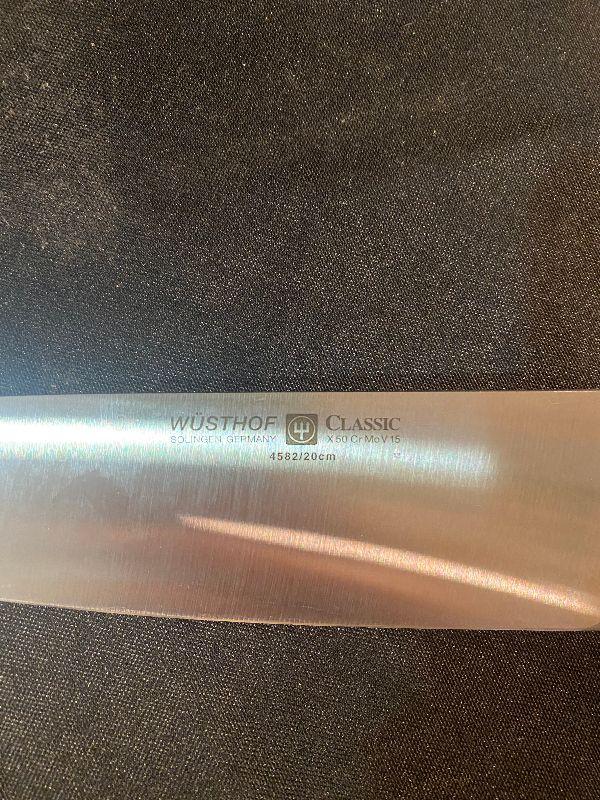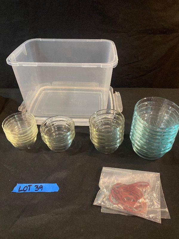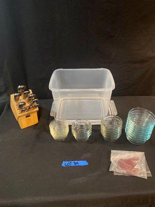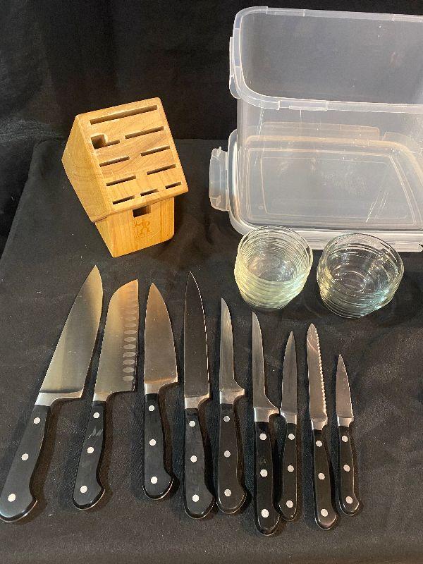 Knife block and knives (Wisthof Classic Knives - made in Germany), 21 glass bowls and storage bin