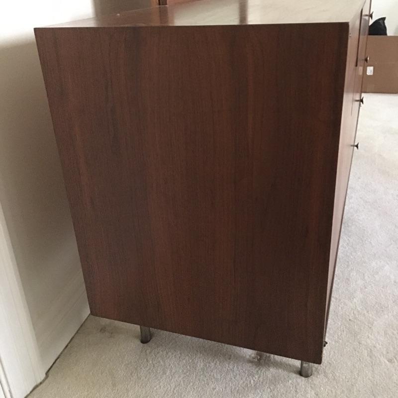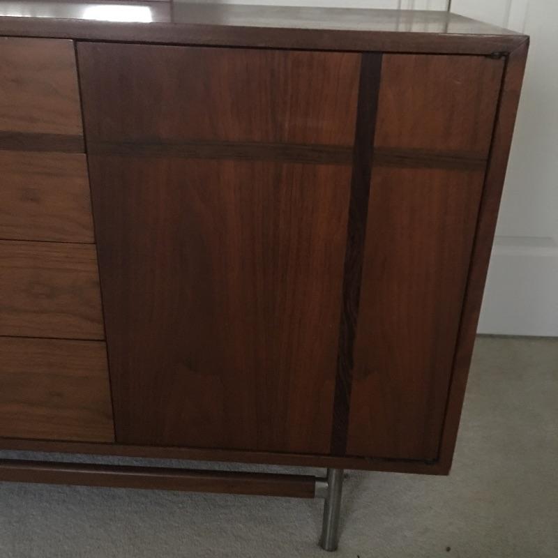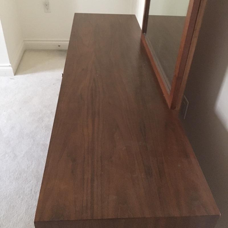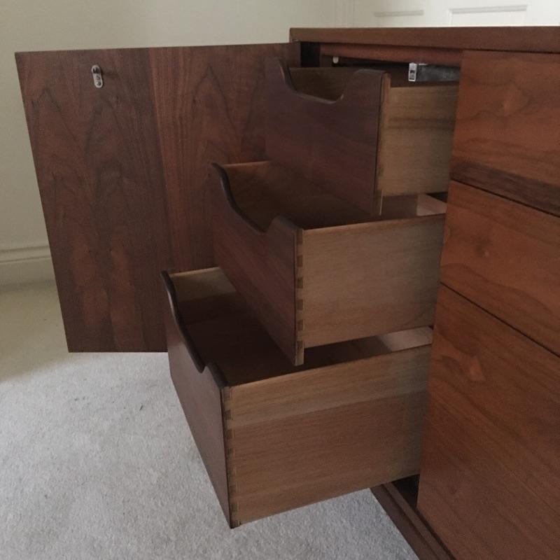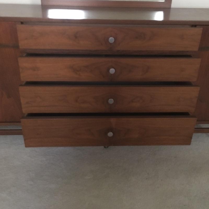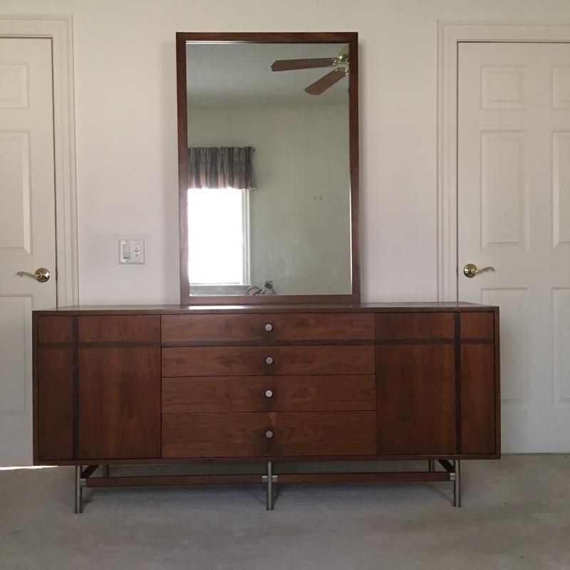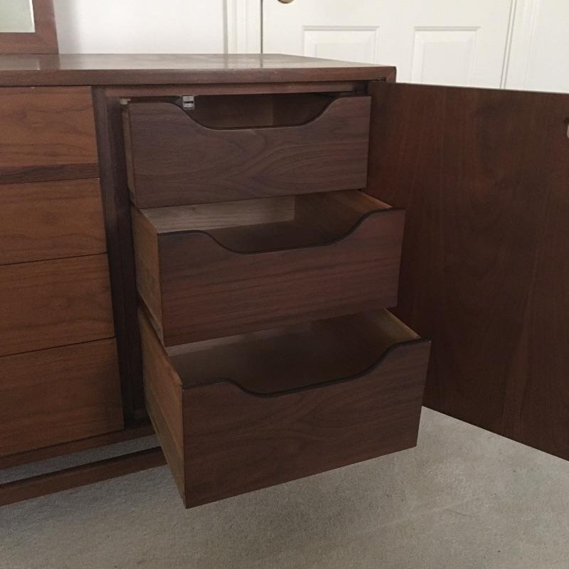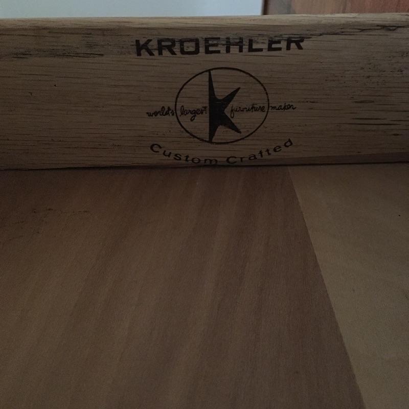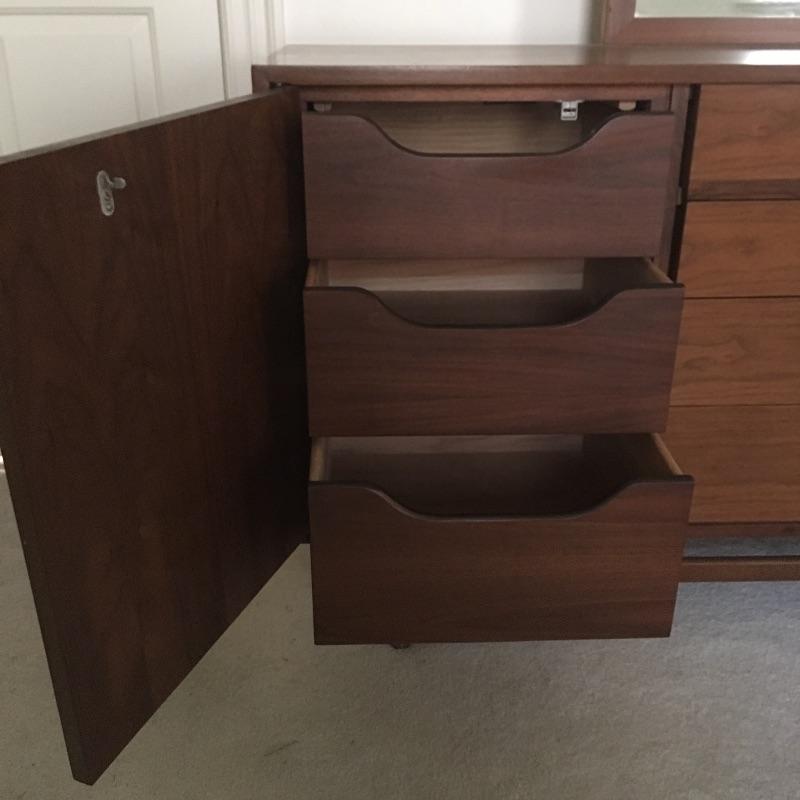 Beautiful MCM Kroehler dresser with mirror. Dresser has four drawers that show with six drawers behind doors. All drawers are dovetailed. A truly stunning MCM dresser will make you smile every time you see it and appreciate the craftsmanship that went into making it. Dresser measures 19” x 70” x 30.5” and mirror measures 32.25” x 48.5”. Bring help item is substantial.