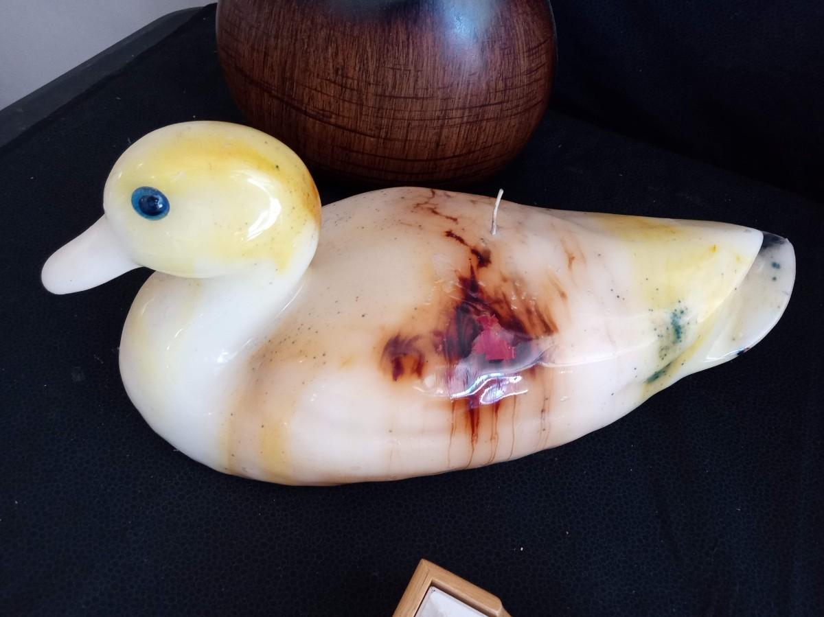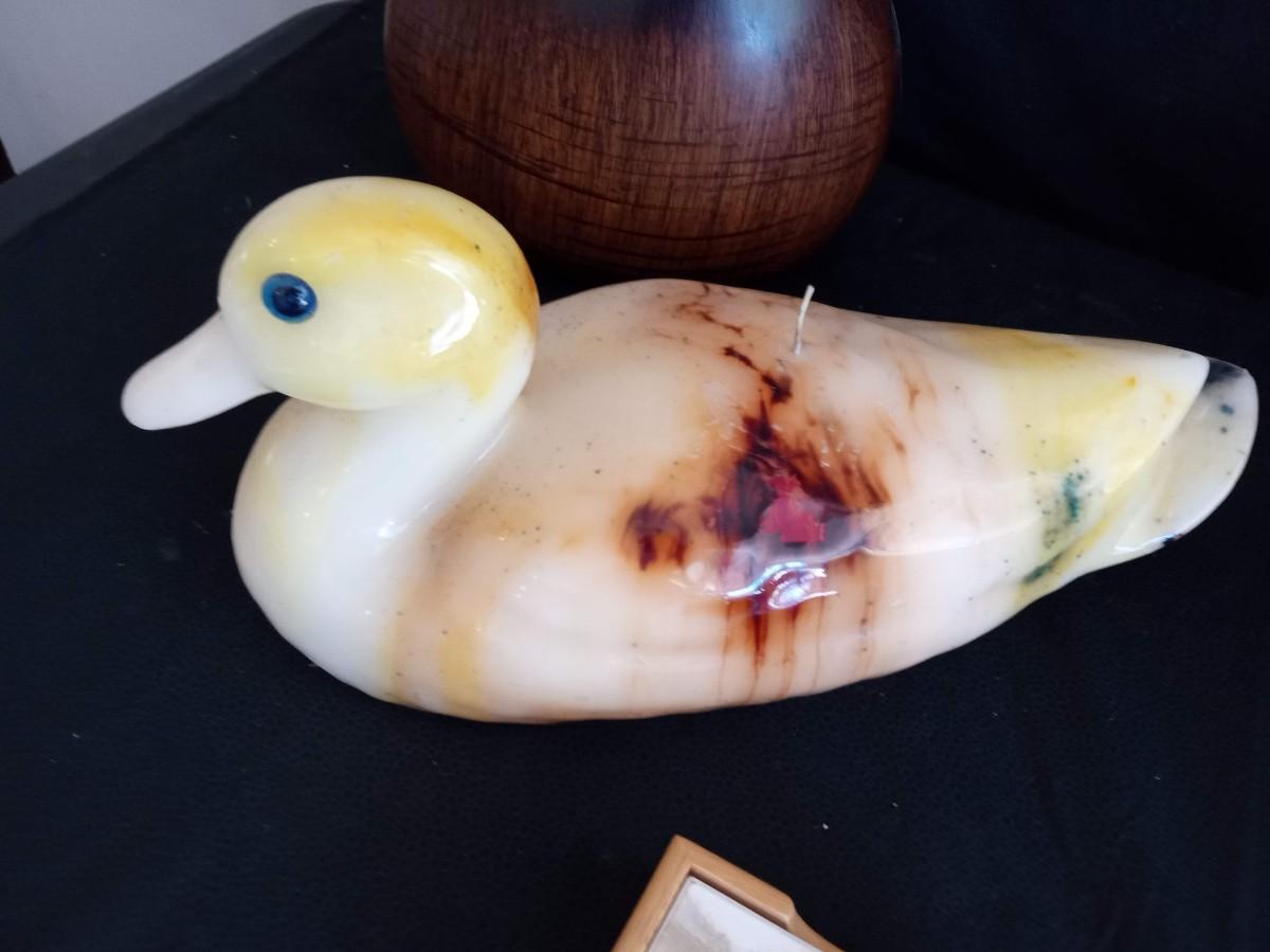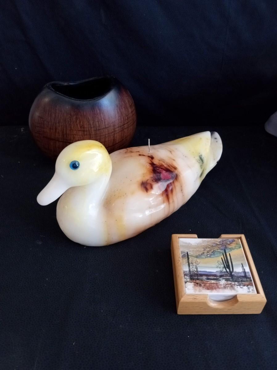 LOT 39  LARGE DUCK CANDLE, COASTERS AND A FLOWER POT