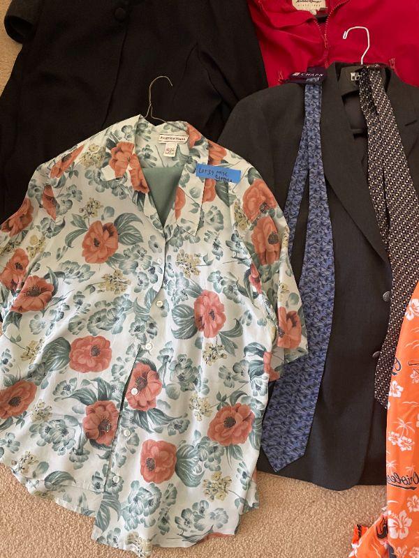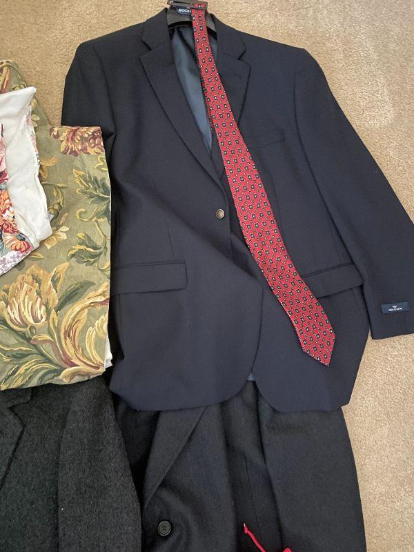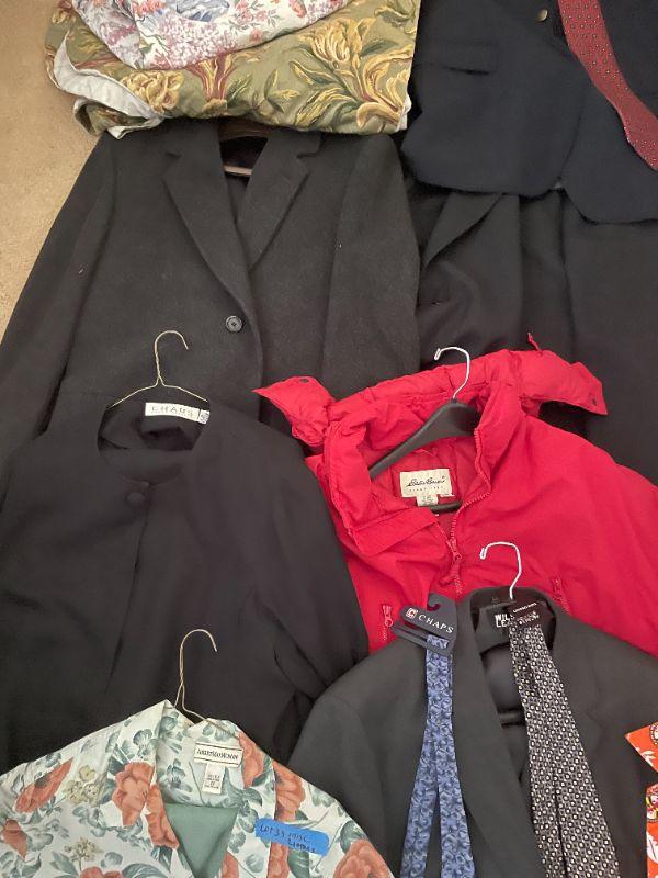 Lot 39 - Lot of women's and men's coats, ties, suit coats, drapes set