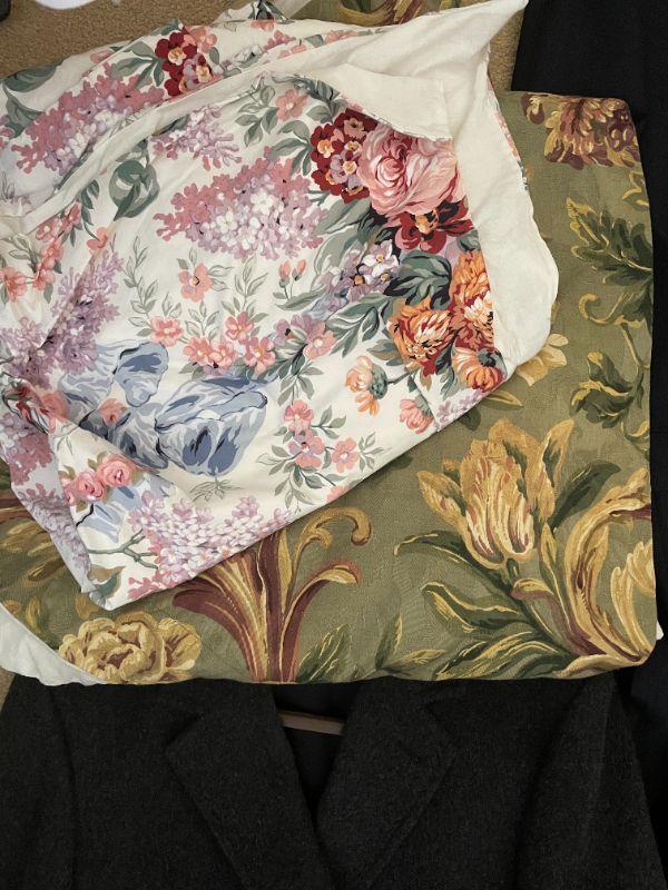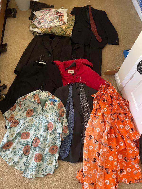 Chaus dress coat size 20w, dockers suit coat, london fog made in USA coat, Geoffrey Beene tie, "fish" tie, august max woman top with pants size 2x, (4) Orioles tops, drapes set.