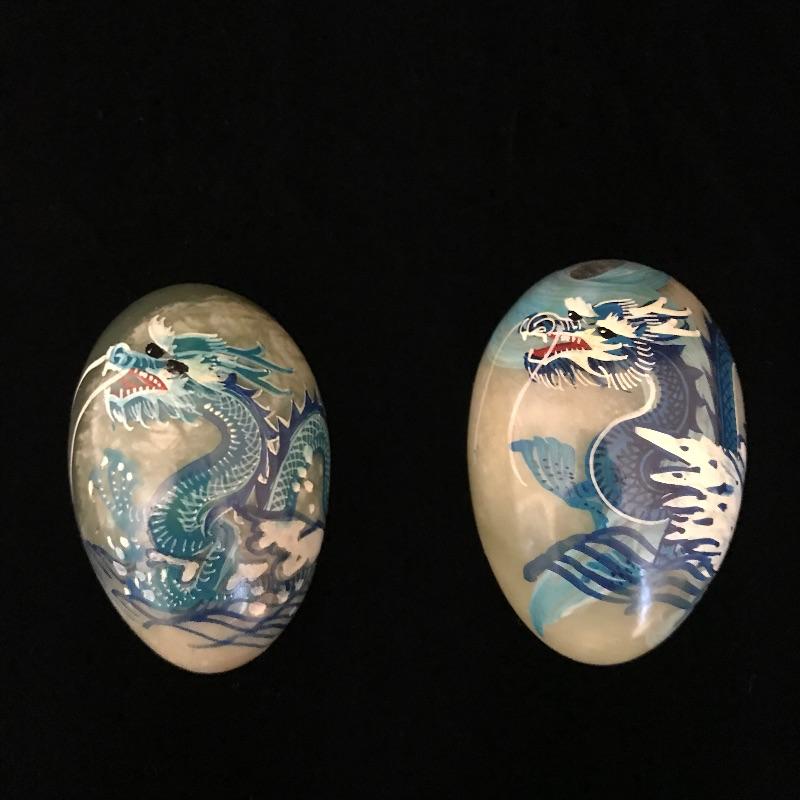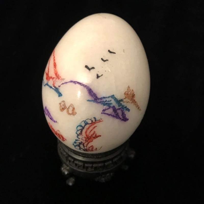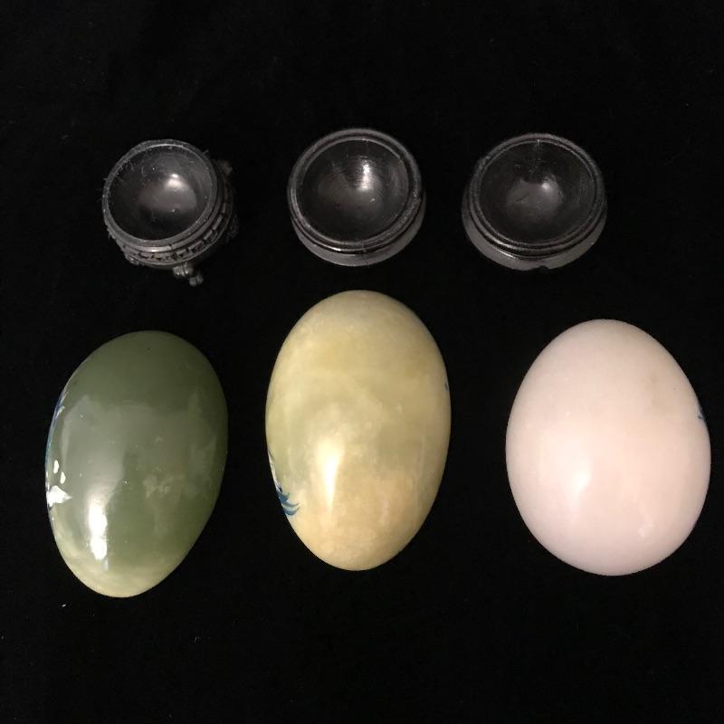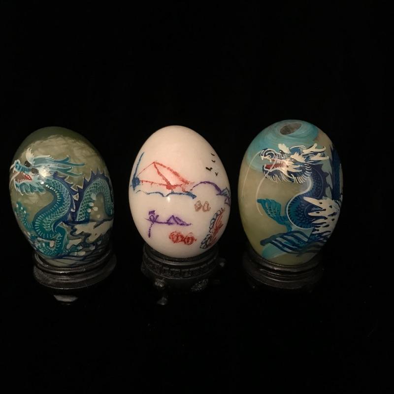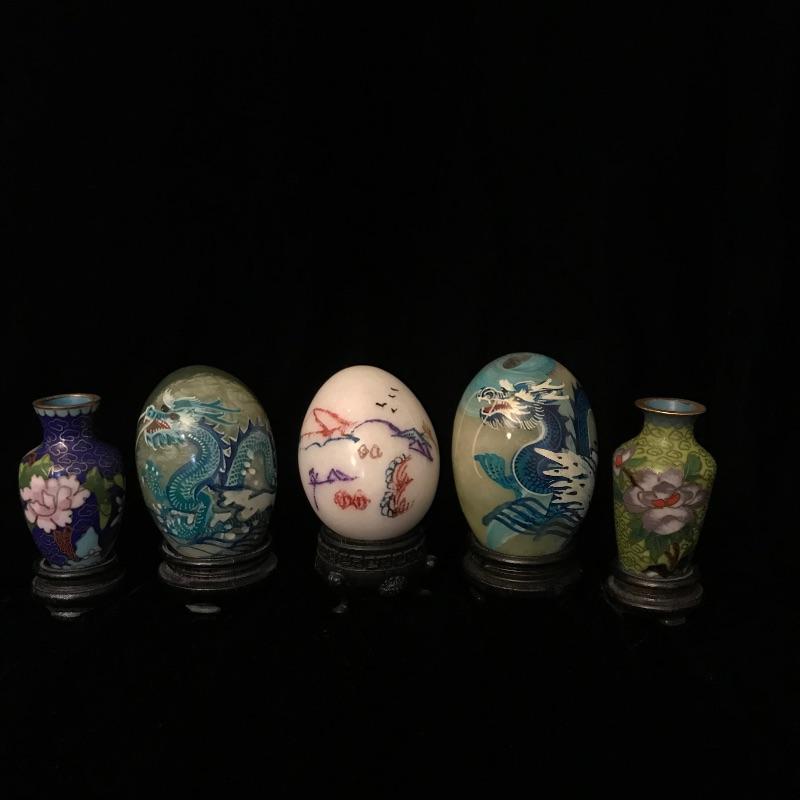 Stunning collection of Asian themed collectibles here. These heavy hand painted eggs come with two miniature 2” vases that also appear to be ceramic and hand painted. All five pieces have their own dark wood stands. Two of the eggs could possibly be jade and the white egg appears to be marble. All three are about 2.5” without stands. See photos.