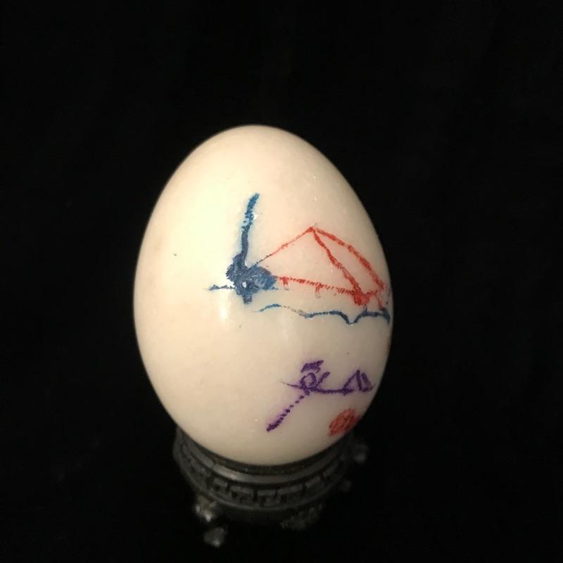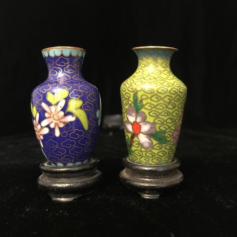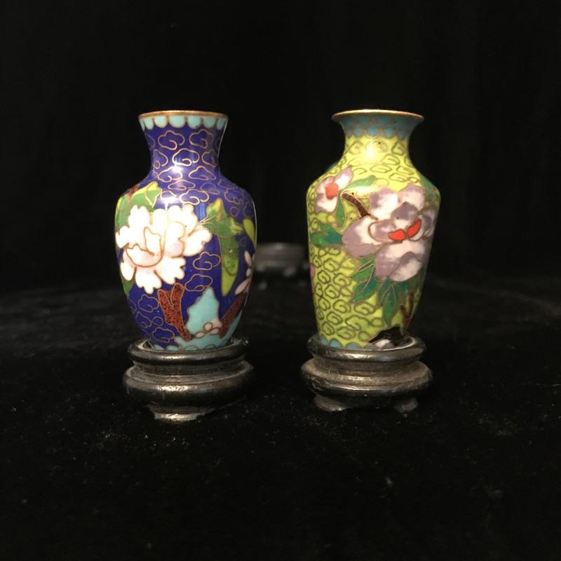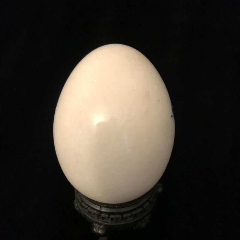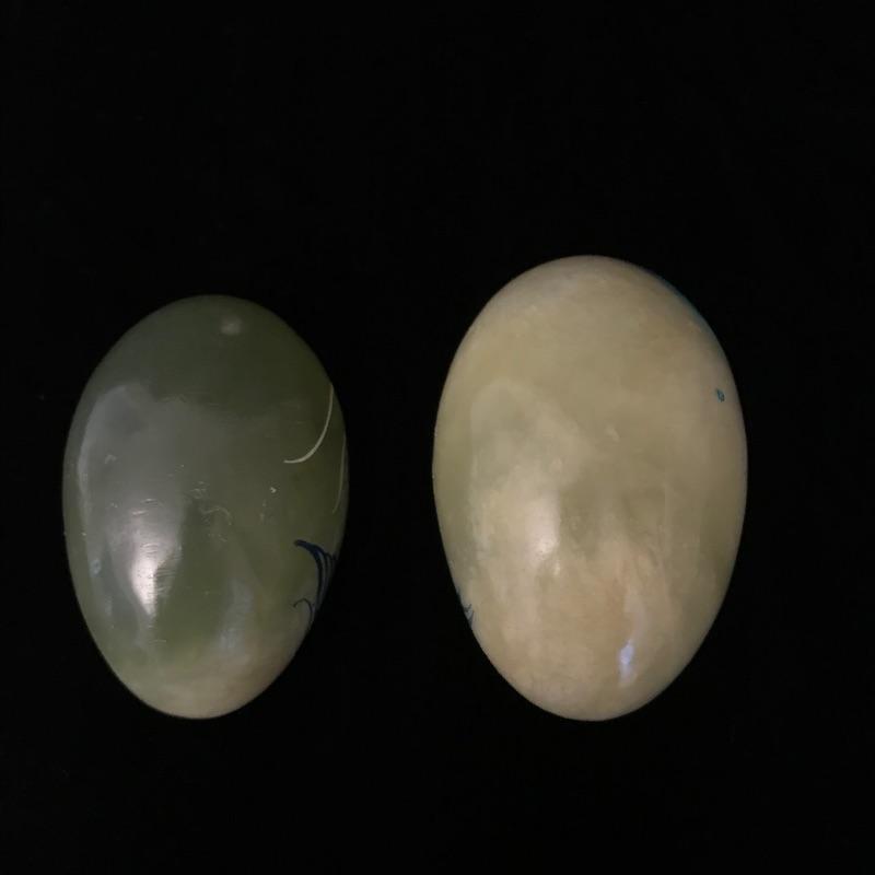 Stunning collection of Asian themed collectibles here. These heavy hand painted eggs come with two miniature 2” vases that also appear to be ceramic and hand painted. All five pieces have their own dark wood stands. Two of the eggs could possibly be jade and the white egg appears to be marble. All three are about 2.5” without stands. See photos.