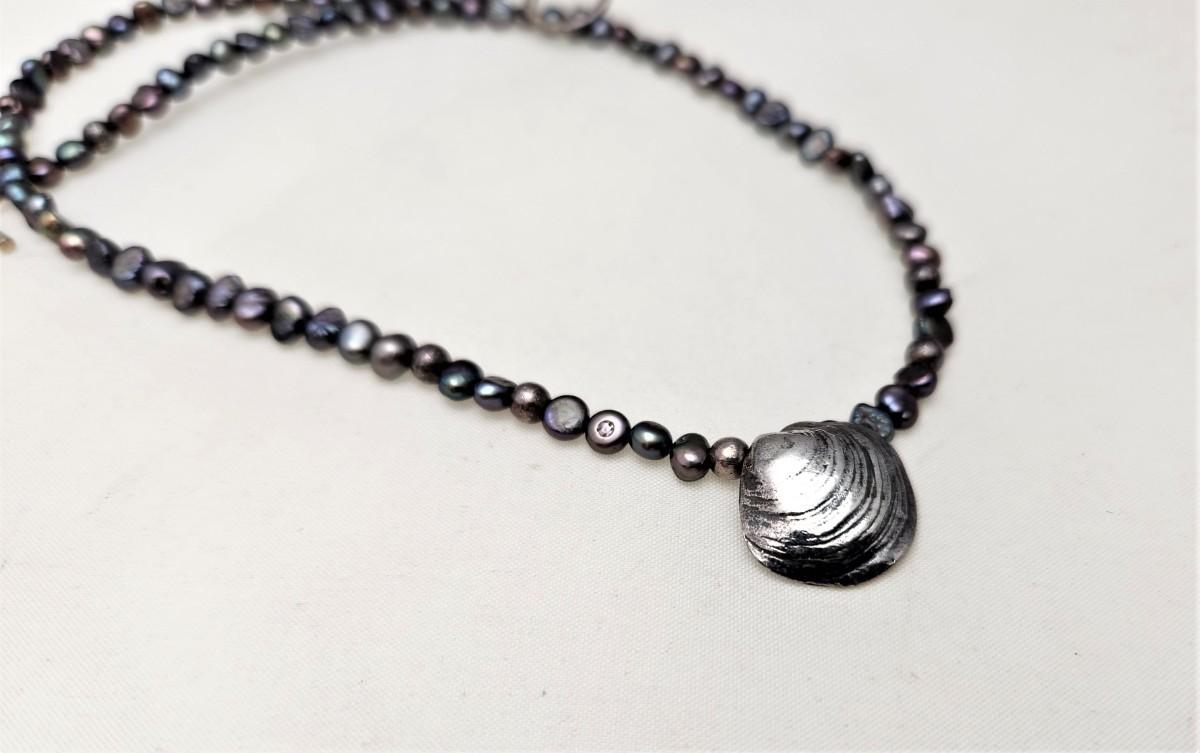 Marked Mignon Faget Sterling silver shell and natural pearl necklace. 16" long, good condition.