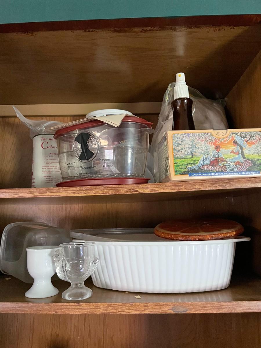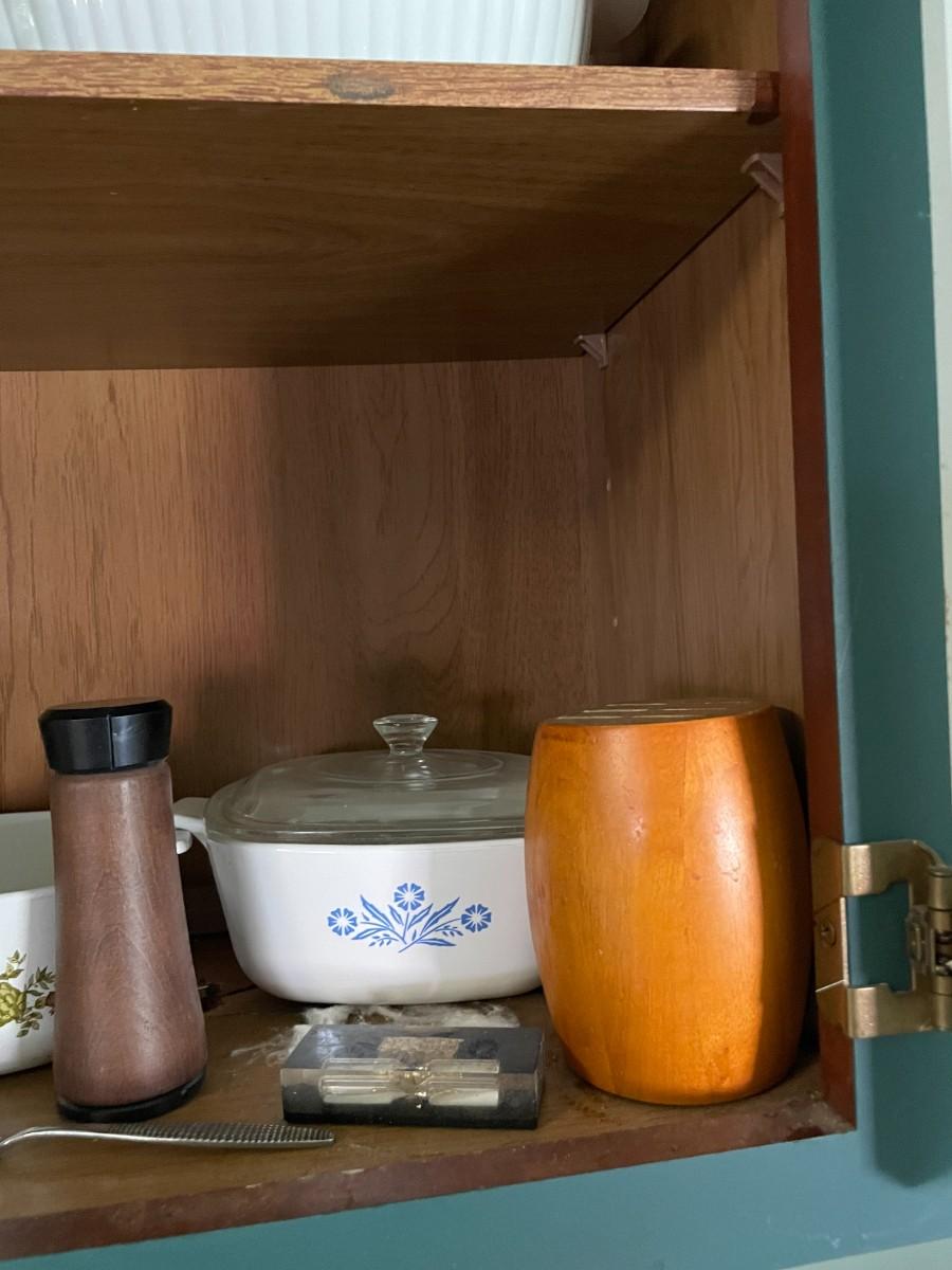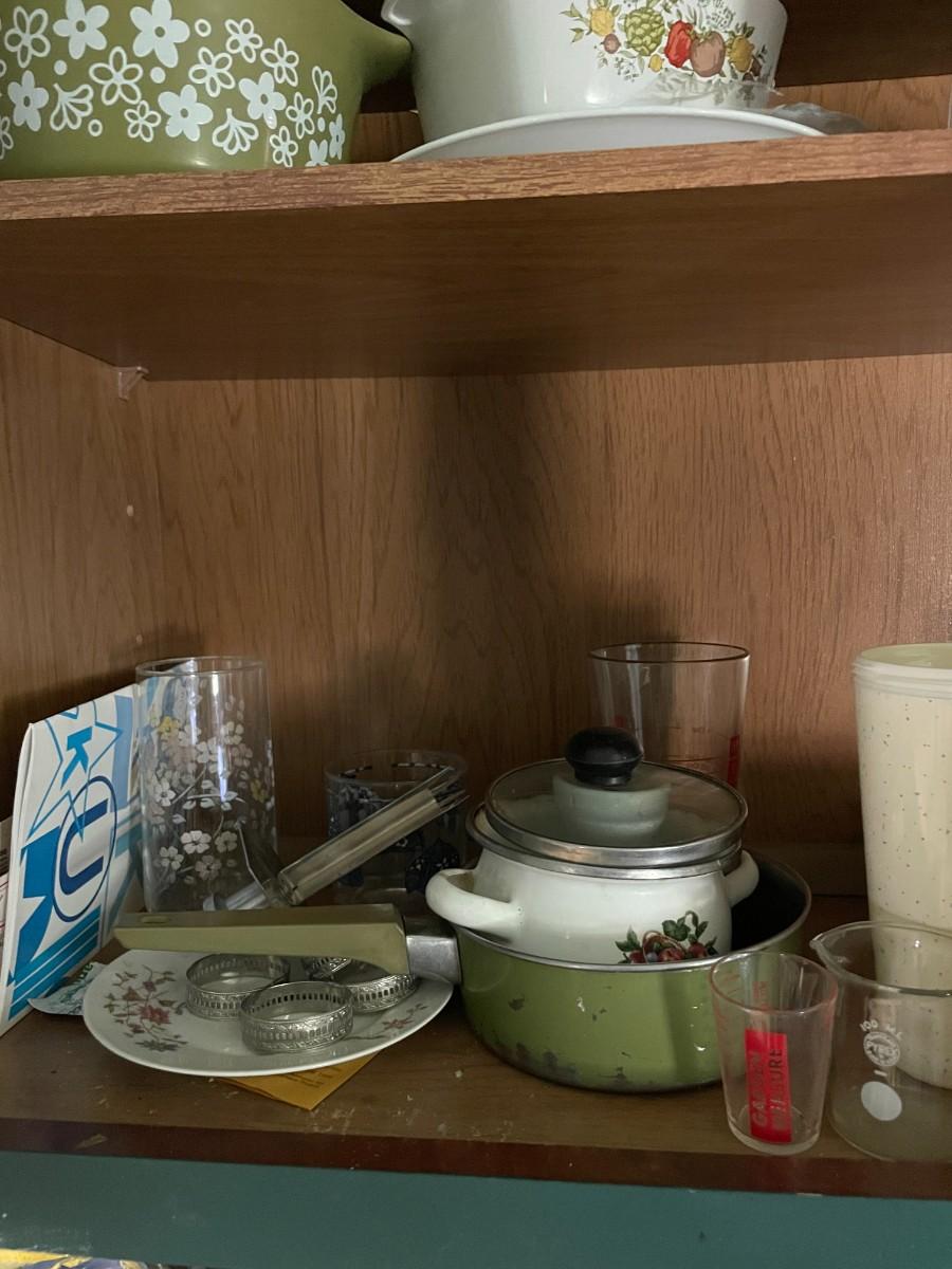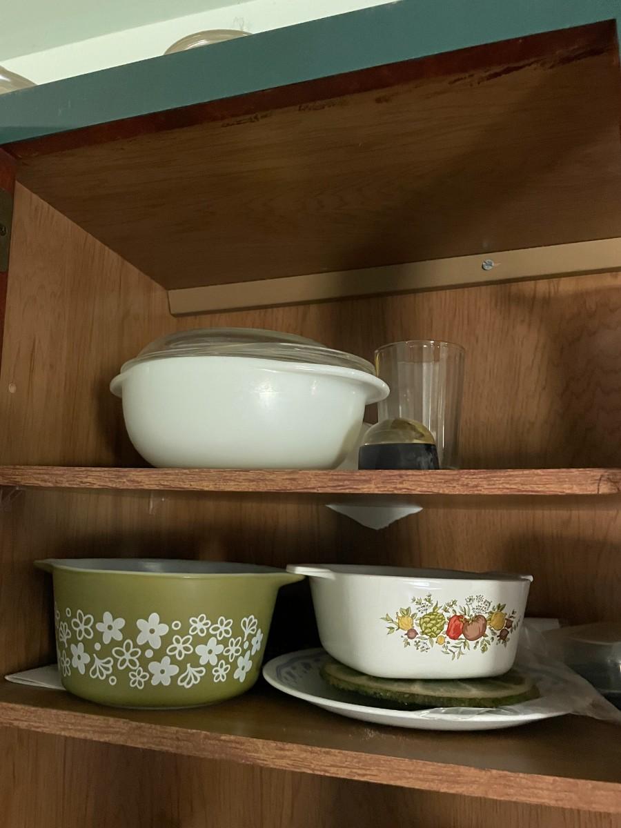 Misc. kitchen items, corning ware, pyrex, glassware.