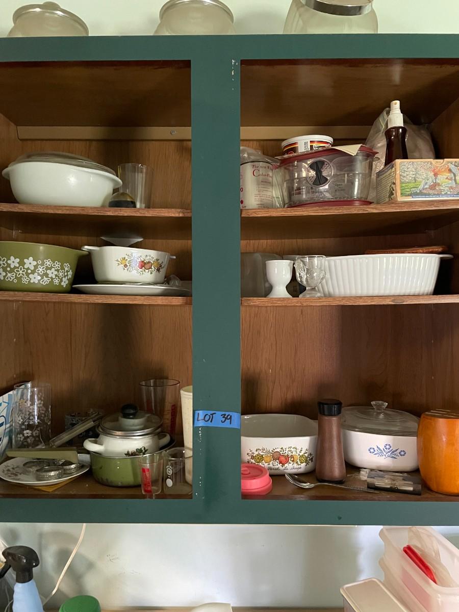 Lot 39- Misc. kitchen items, corning ware, pyrex, glassware