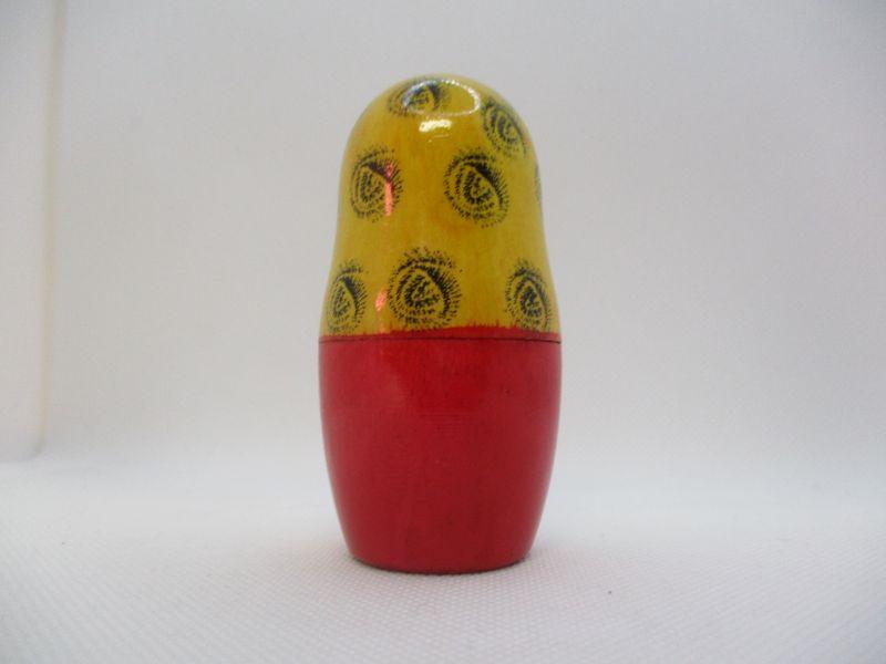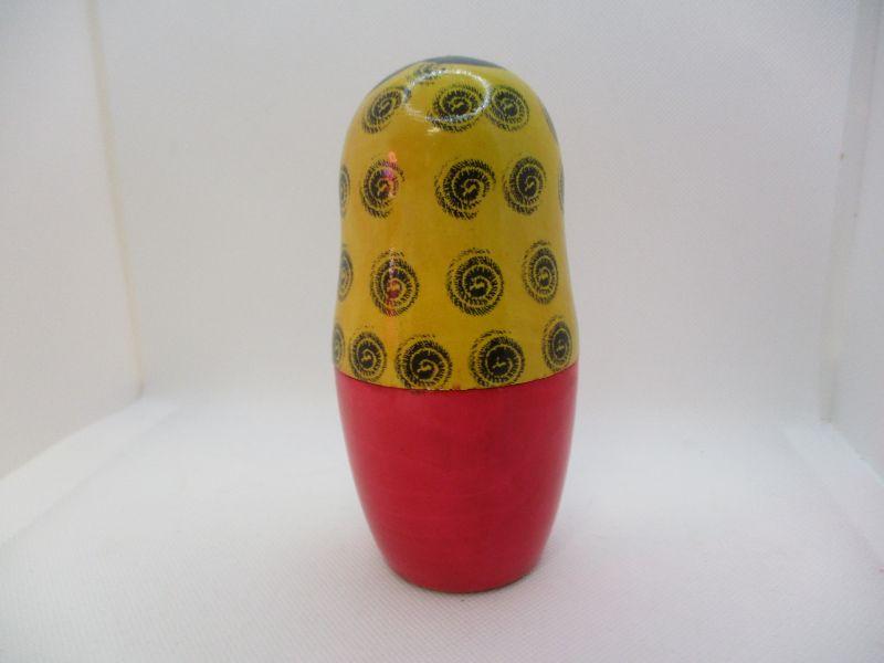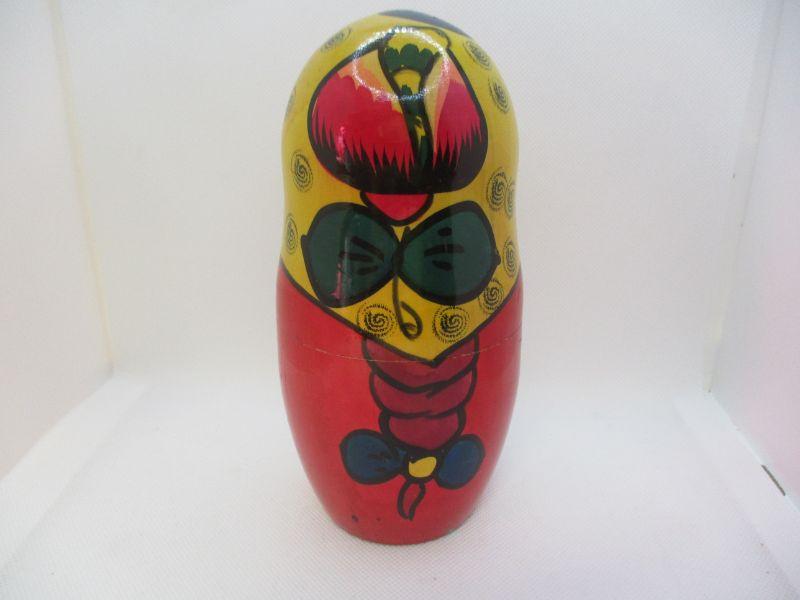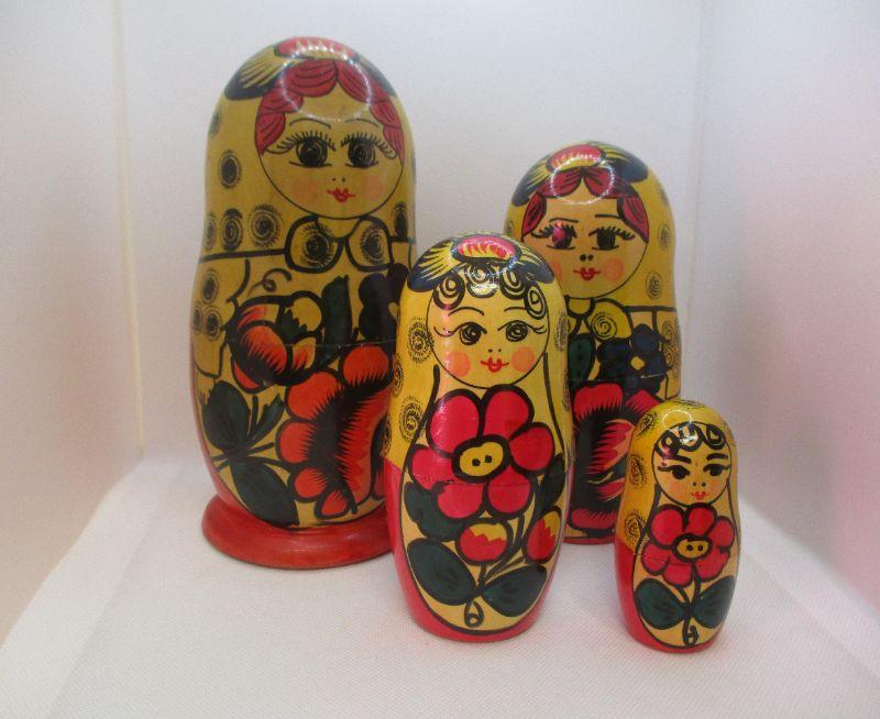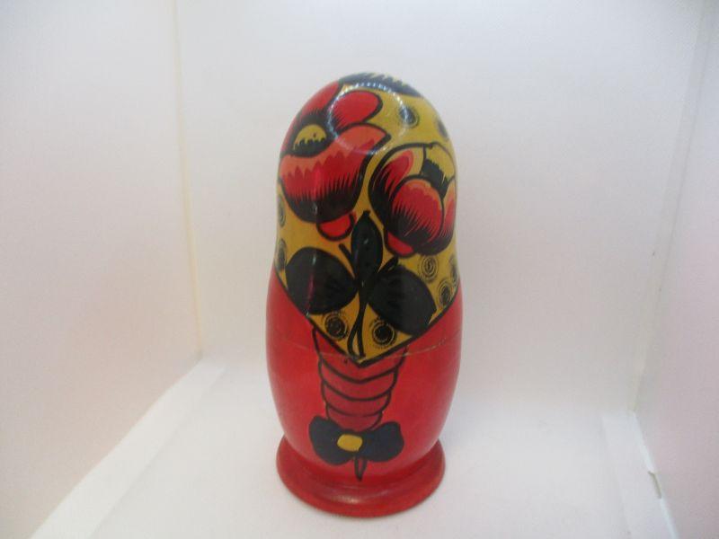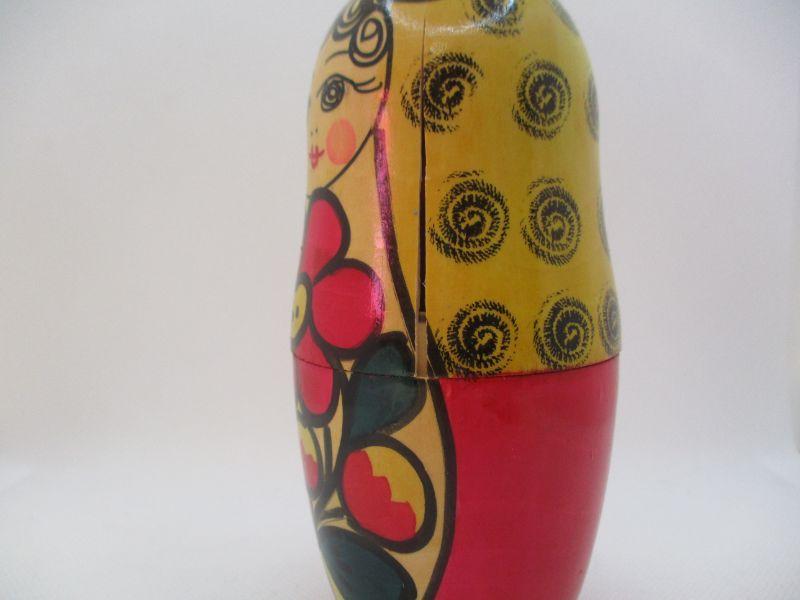 The third largest doll has a split in the wood (shown in pictures) and there is not a fifth (baby) doll. Otherwise, it is in fantastic condition. It is 9" tall.