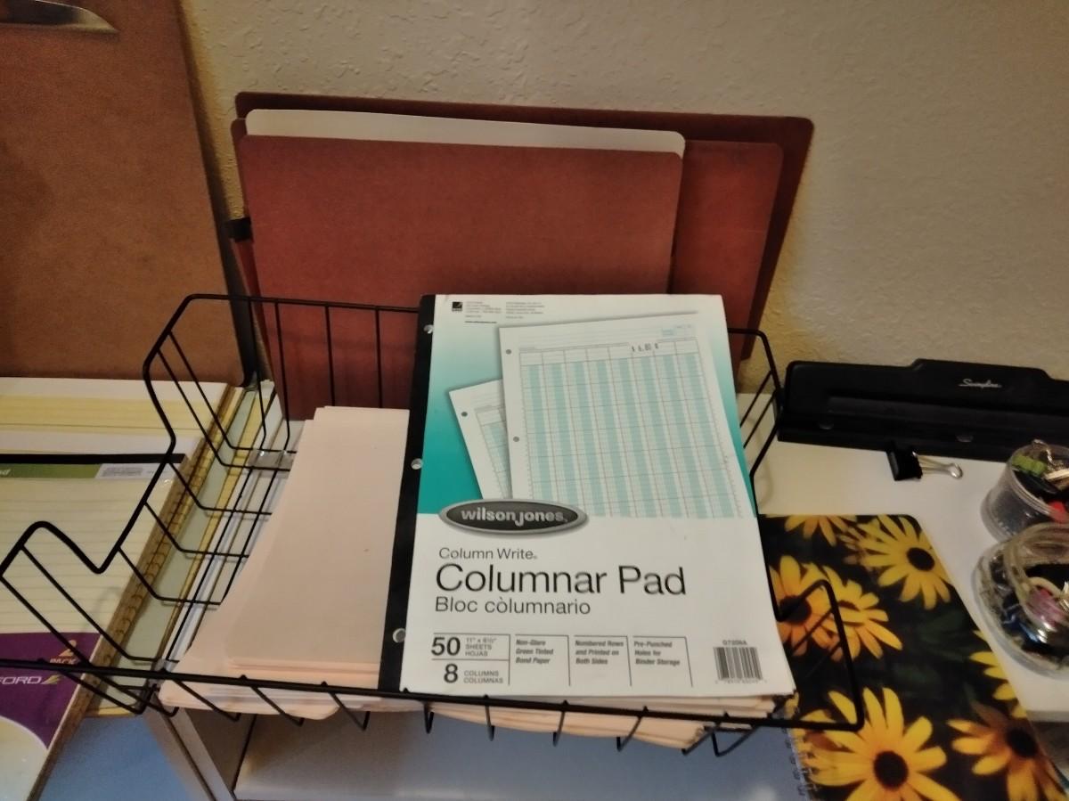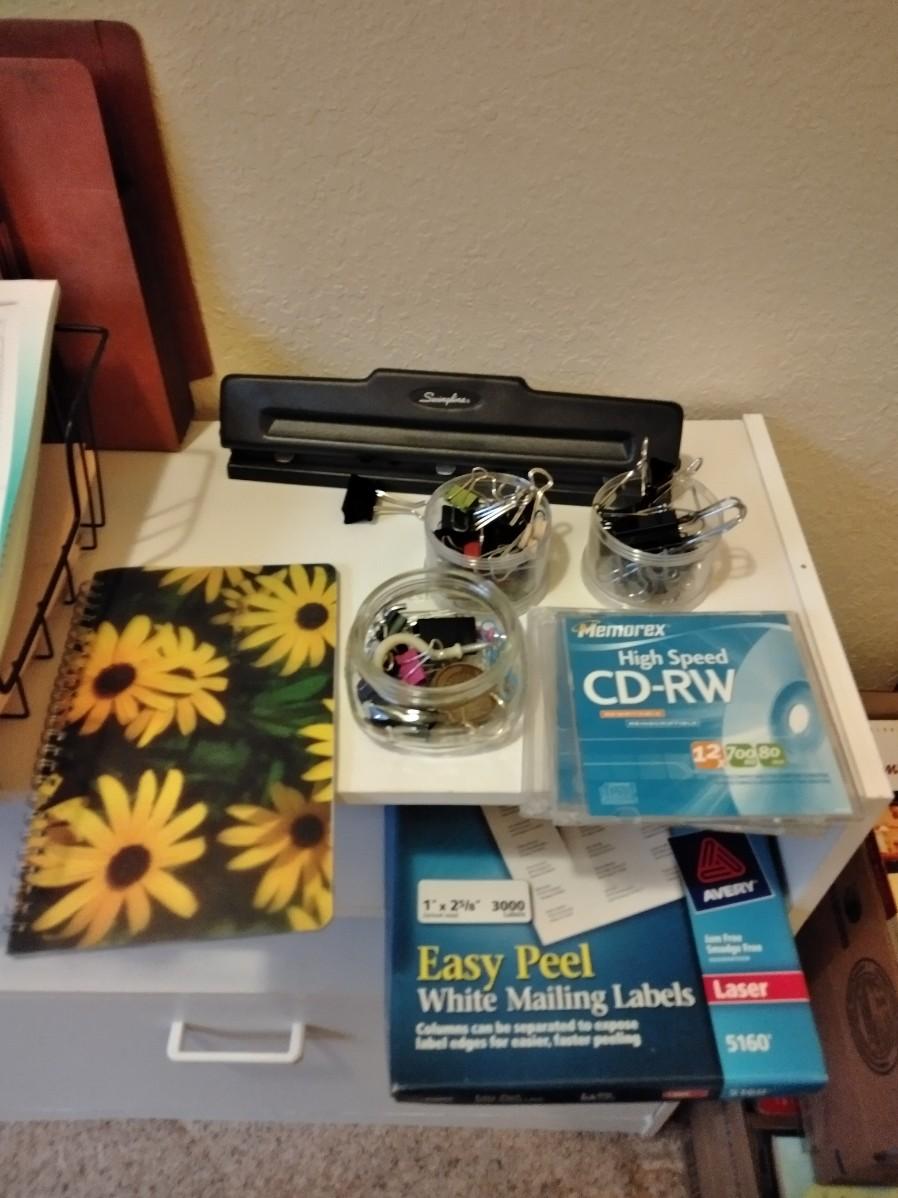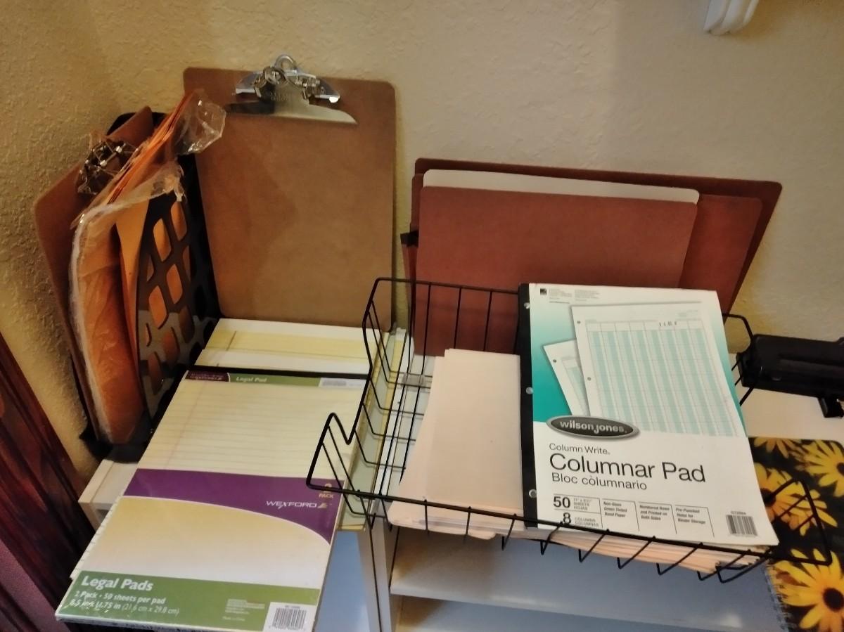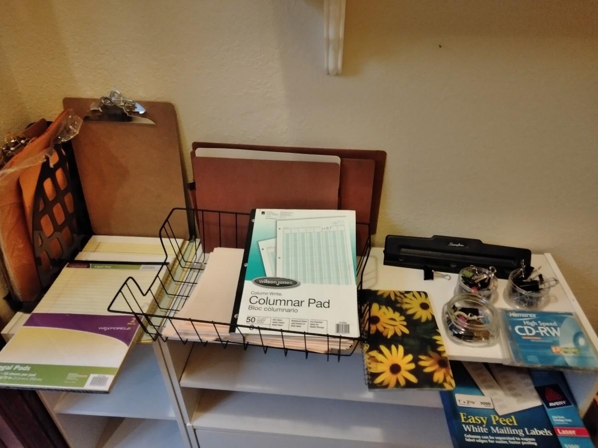 OFFICE SUPPLIES INCLUDING A HOLE PUNCH, A CLIP BOARD, ORGANIZING BASKETS AND RACKS, WRITING TABLETS, COLUMAR PAD, AND MORE