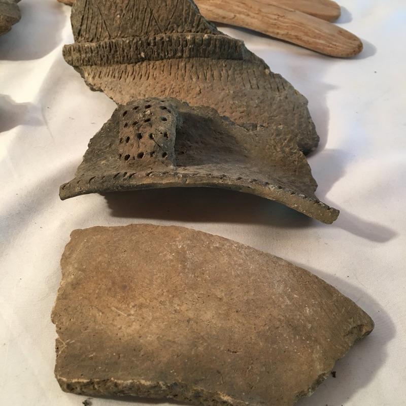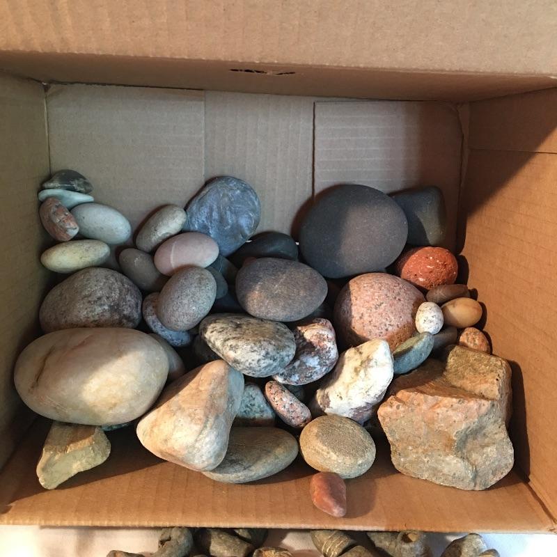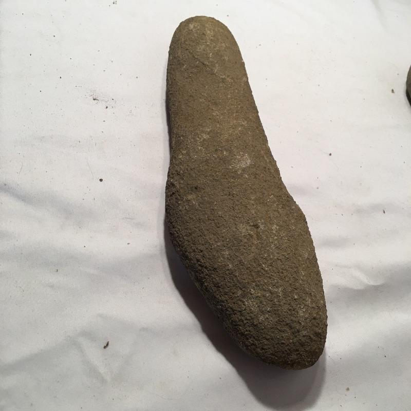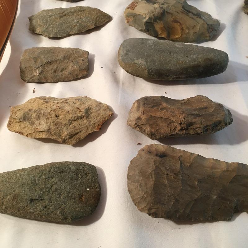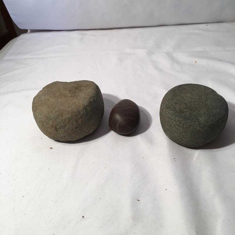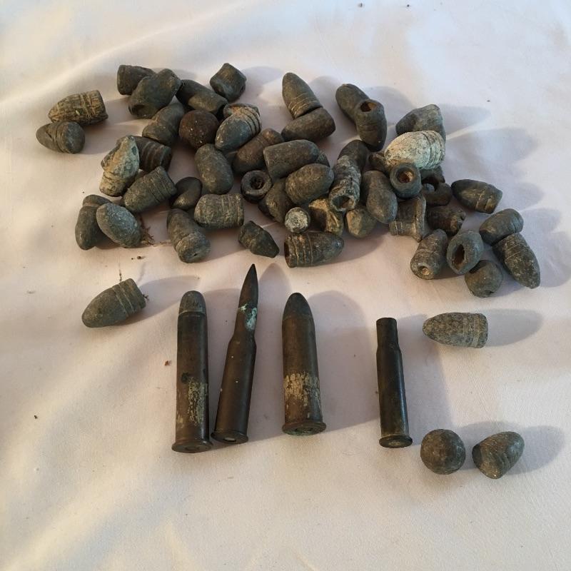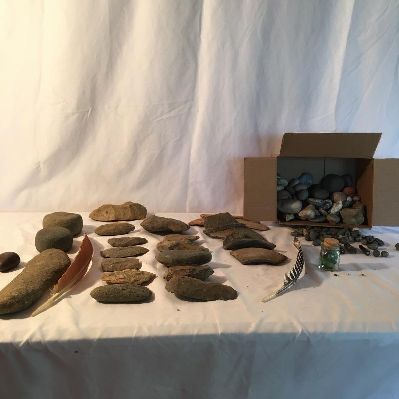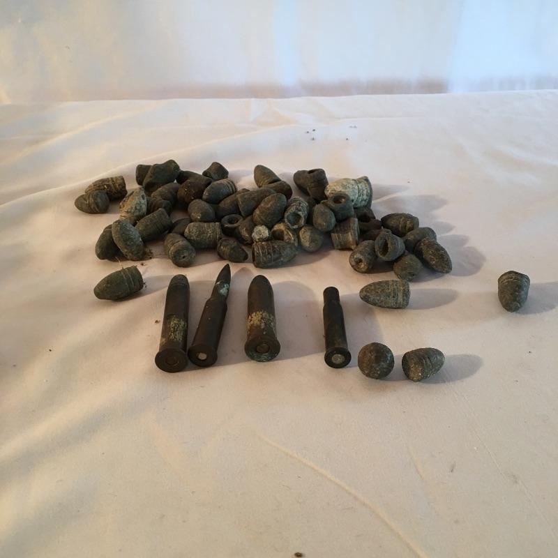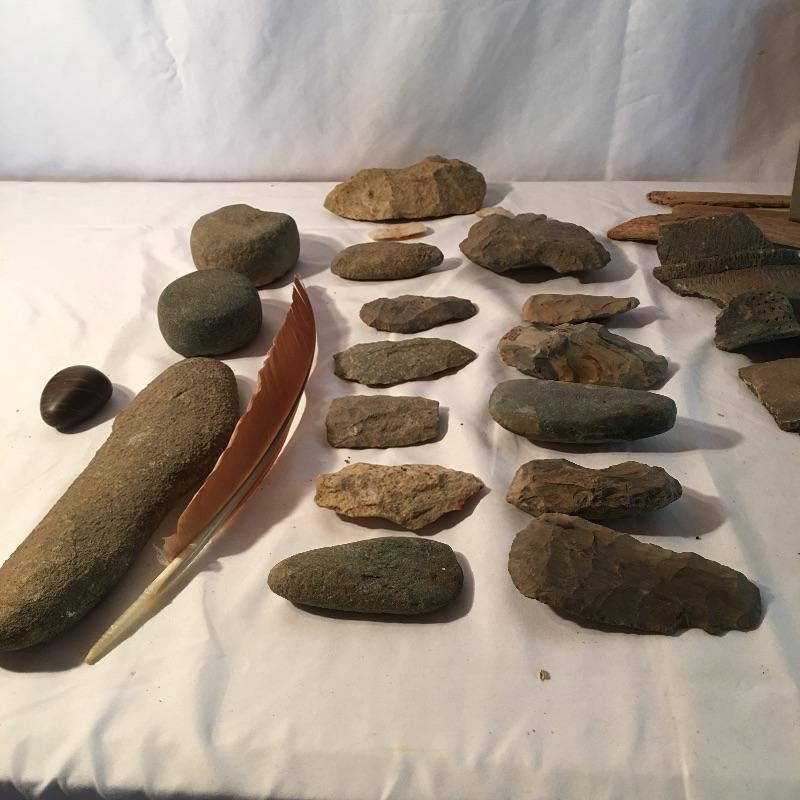 A fascinating array of primitive tools, rocks and old bullets. Lot includes old metal bullets, arrow shaped stones, small jar of sea glass, a selection of river rocks, pair of feathers and more. Largest stone measures 11” long. If only these artifacts could talk...