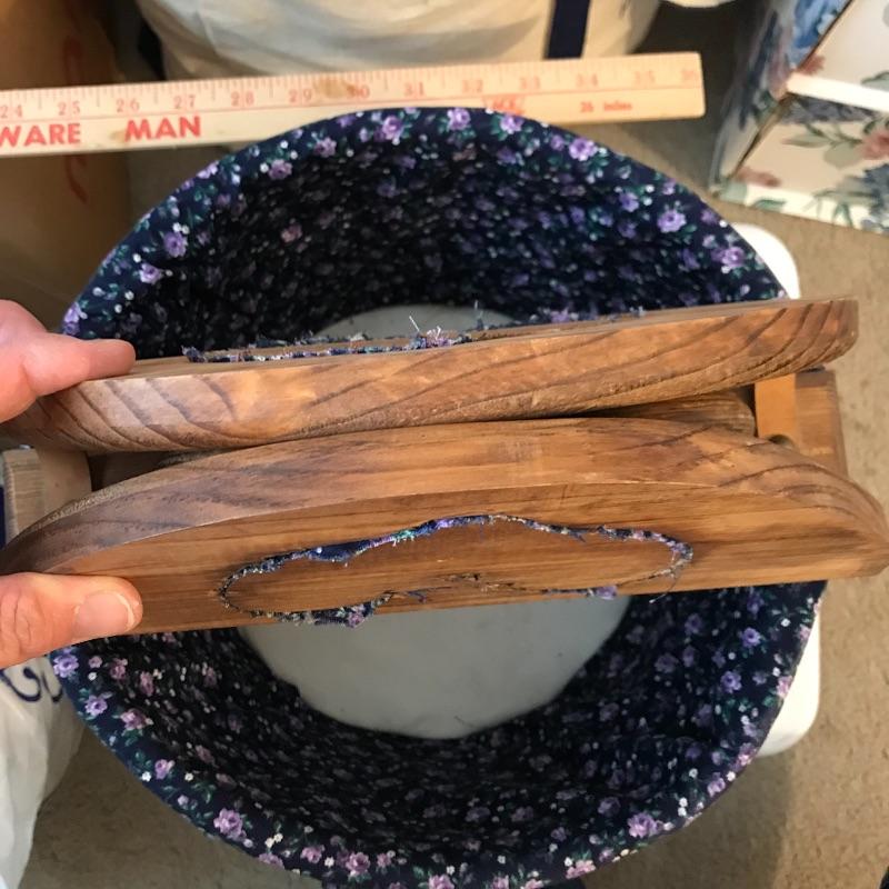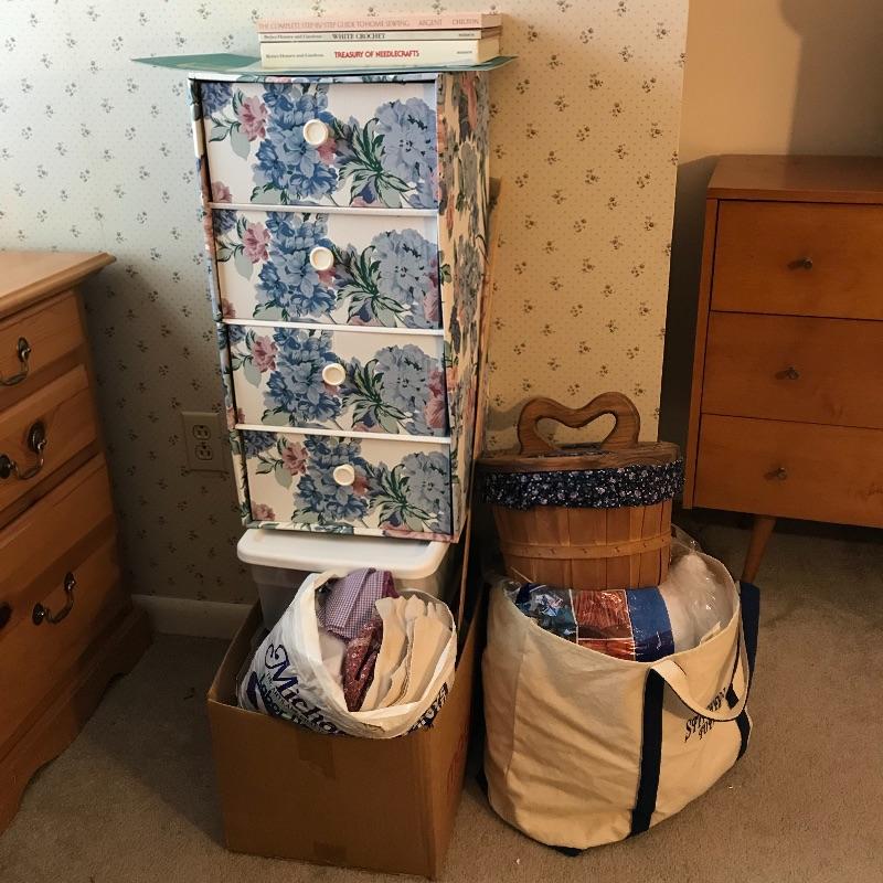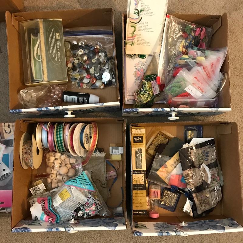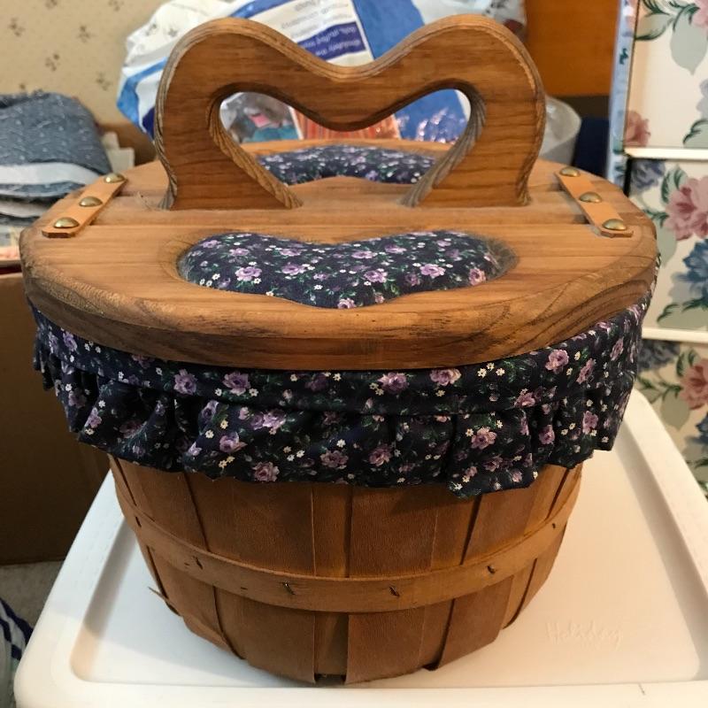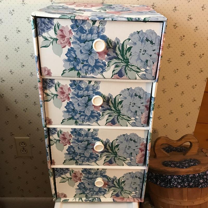 Neat lot full of variety for new or well-seasoned crafters. A four-drawer, 12.25”sq x 24” floral cardboard organizer full of crafting supplies. Some fat squares, ribbons, marbles, books, a Stitchers Tote full of fiberfill and more! A lovely wooden basket with purple floral design and smudged marking on bottom. See and zoom images. Local pick up only.