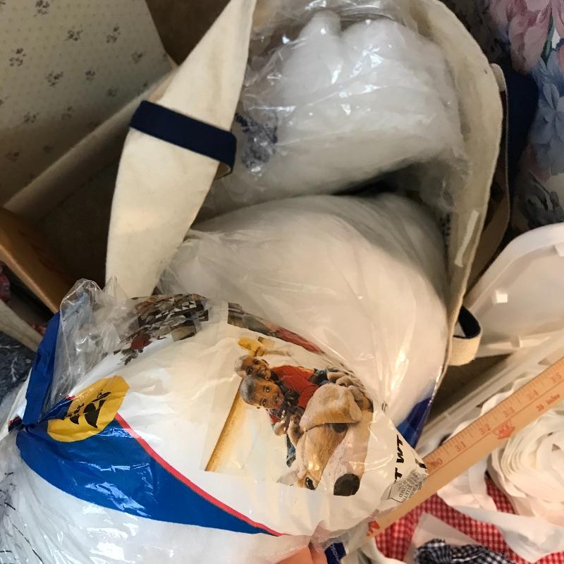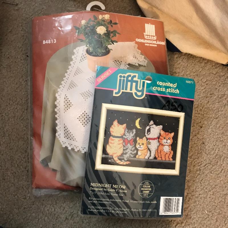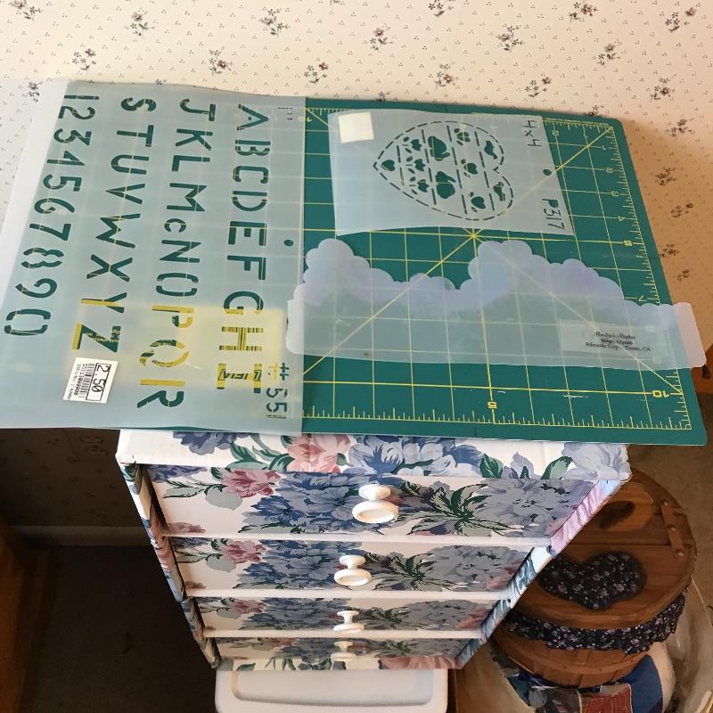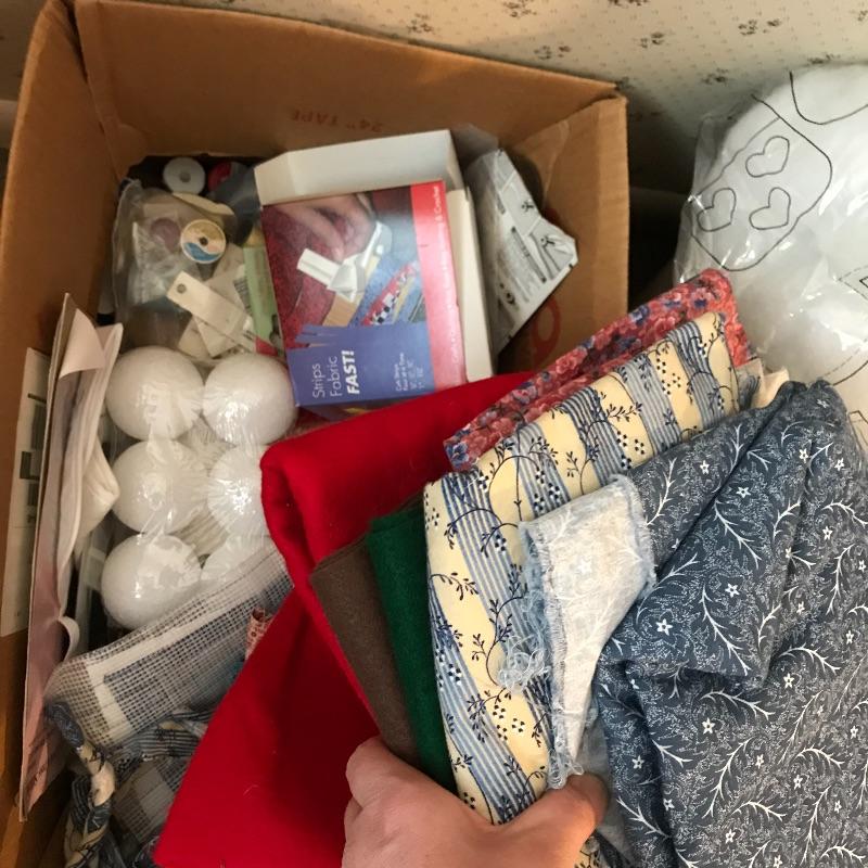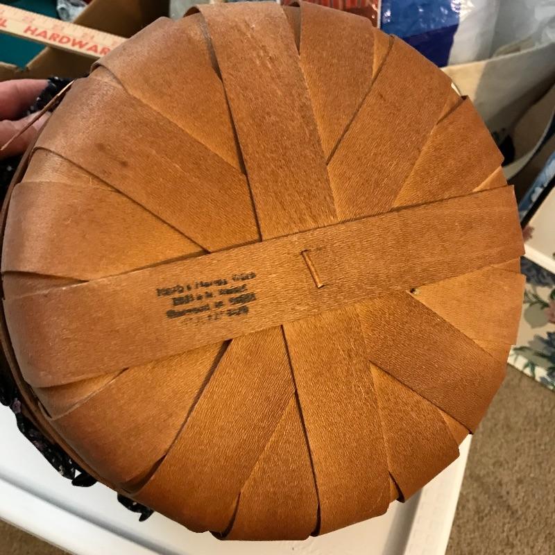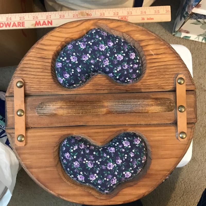 Neat lot full of variety for new or well-seasoned crafters. A four-drawer, 12.25”sq x 24” floral cardboard organizer full of crafting supplies. Some fat squares, ribbons, marbles, books, a Stitchers Tote full of fiberfill and more! A lovely wooden basket with purple floral design and smudged marking on bottom. See and zoom images. Local pick up only.