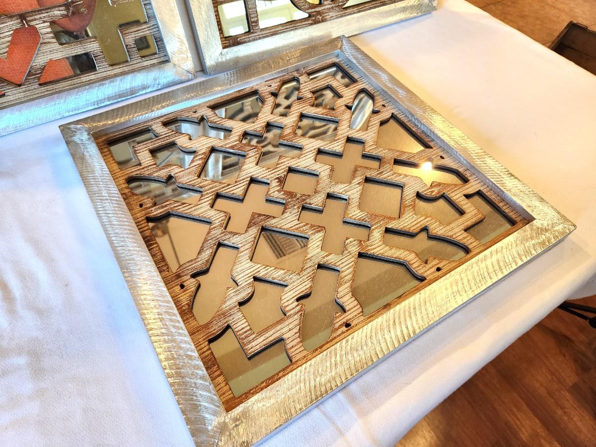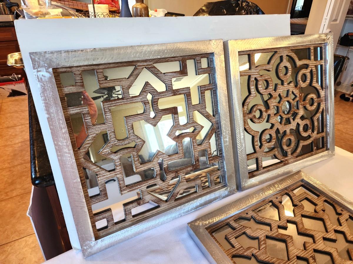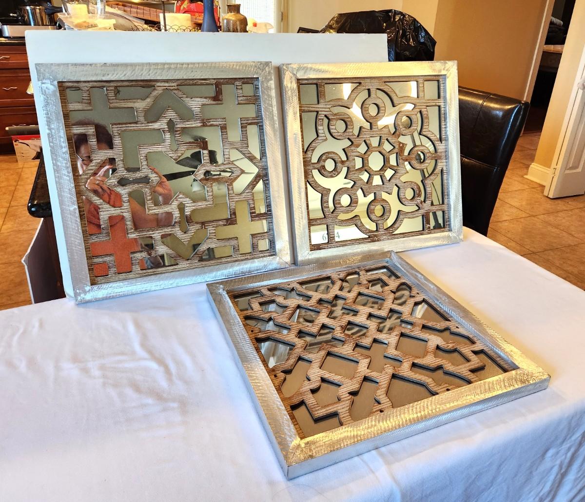 Attractive set of 3 contemporary mirrored wall decorations - each measures 17.5" x 17.5". All in good condition.