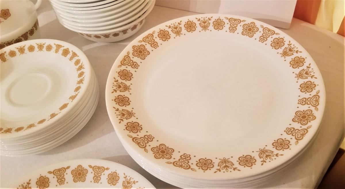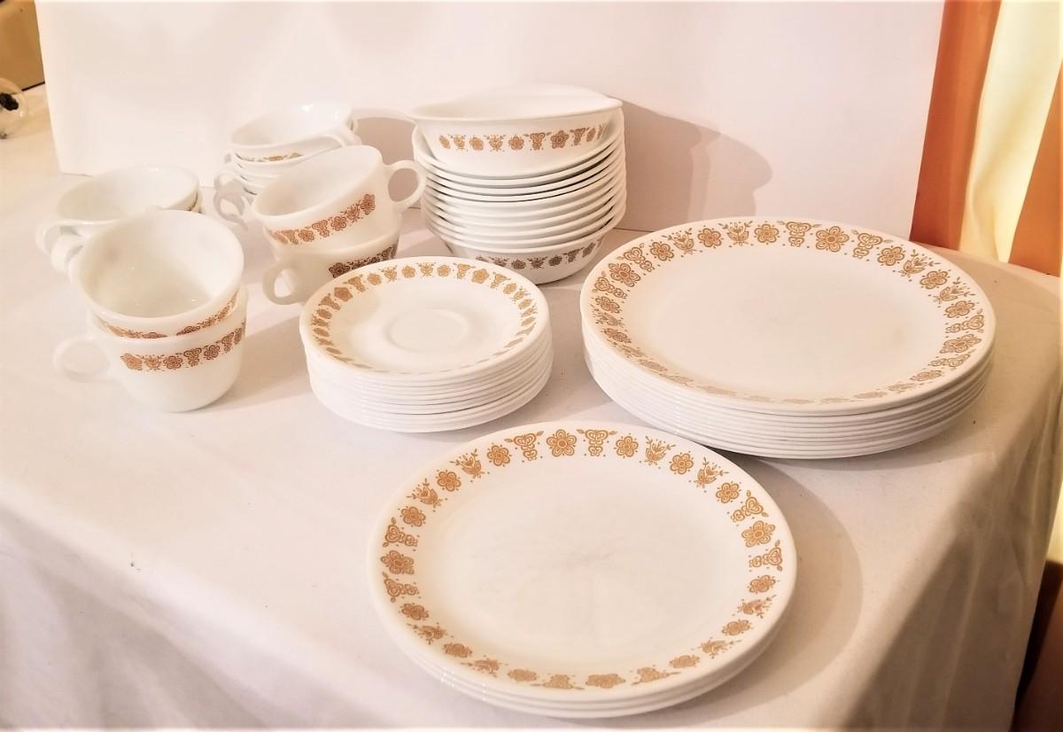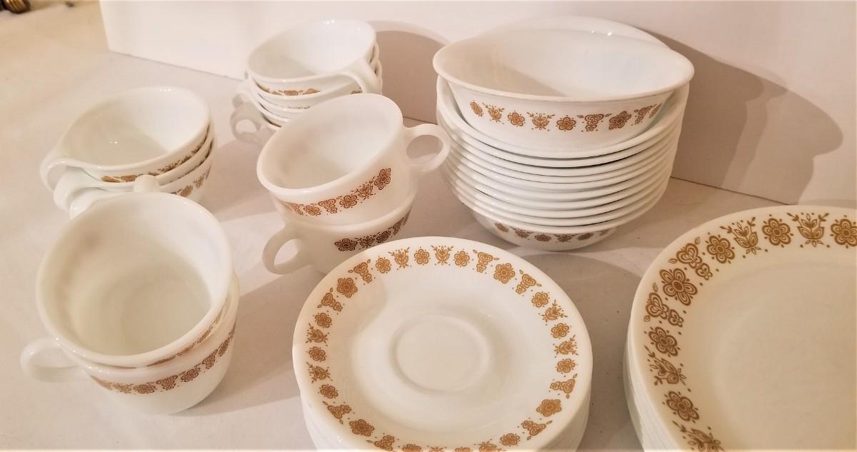 Vintage Corelle set in Harvest Gold - you get all you see here - 7 plates (10" across), 6 bowls, 3 salad plates, 12 saucers, 4 regular cups, 9 curved handle cups. Vintage condition.