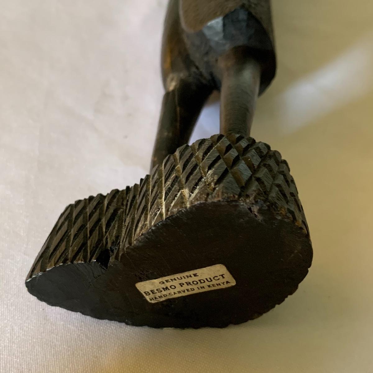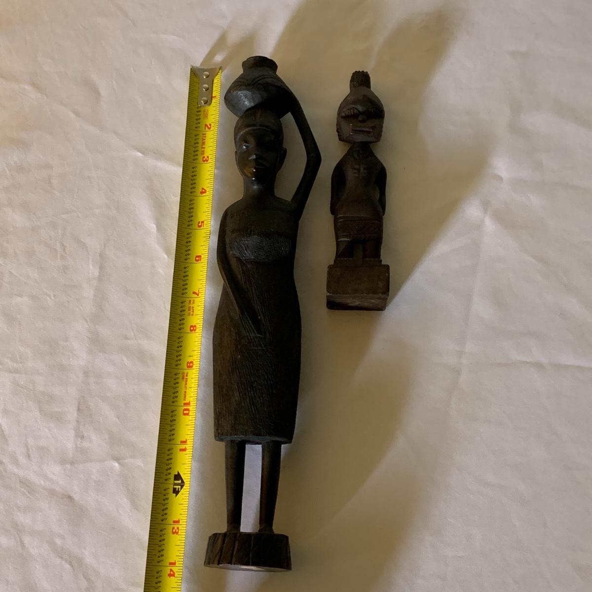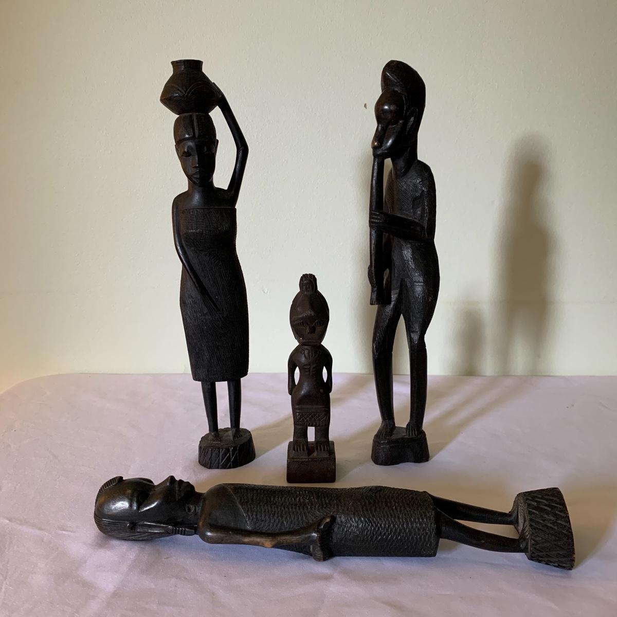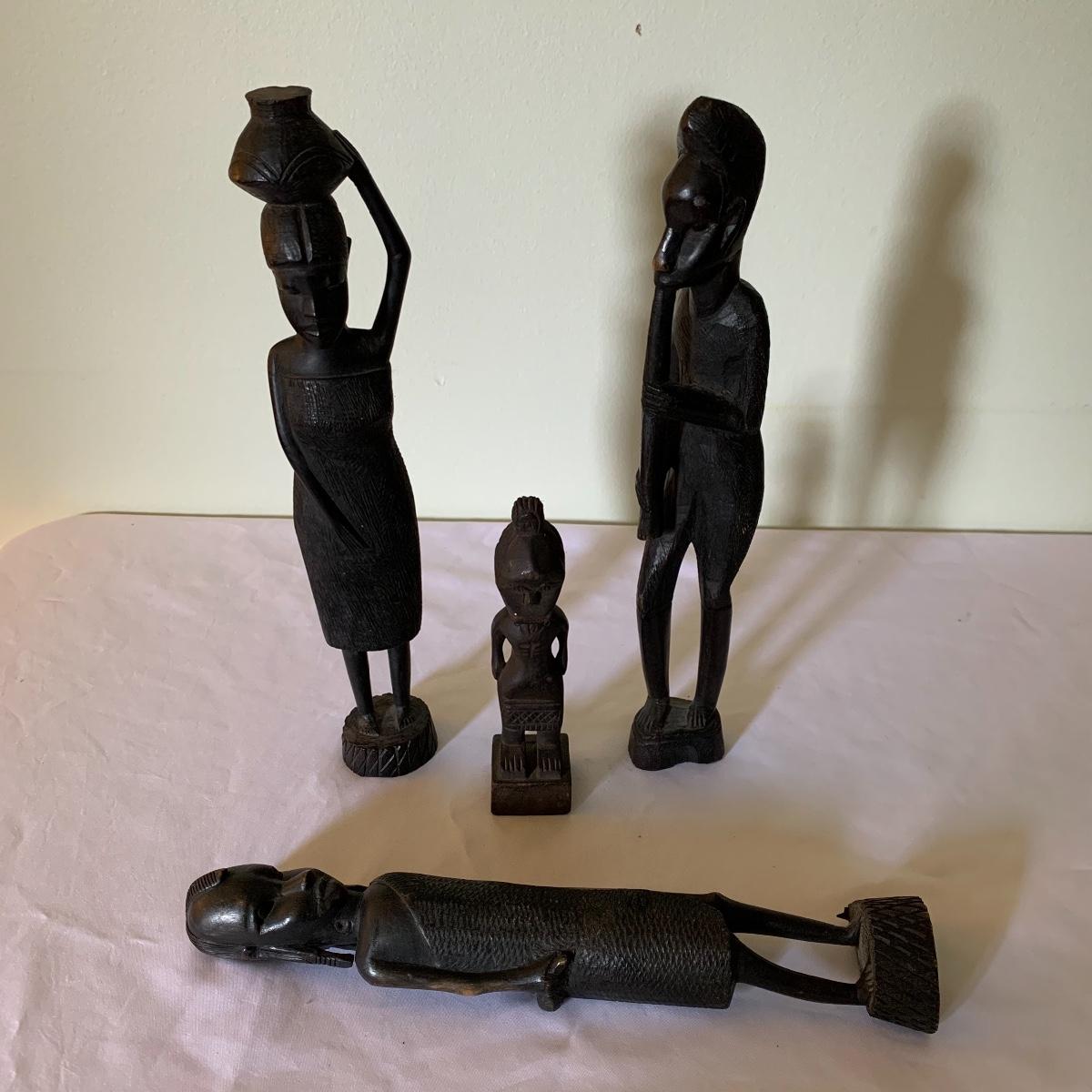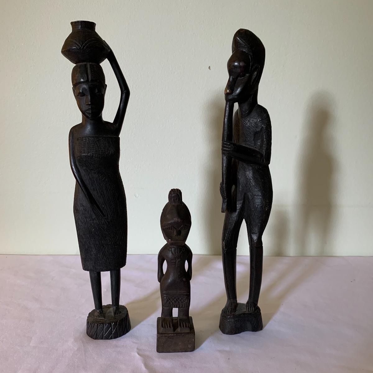 This lot includes four carved wooden statuettes. Three of them are a matching set that have stickers on the bottom that say “Genuine Besmo Product Handcarved in Kenya”. These three measure about 14” tall. One of these is top heavy and needs help standing upright. It needs a very flat surface to stand upright. The fourth statuette fits in with the others, but it not part of the same set. It is smaller (7”) and lightweight and has no label regarding its origins. Shipping available.