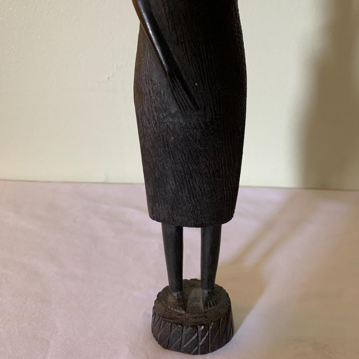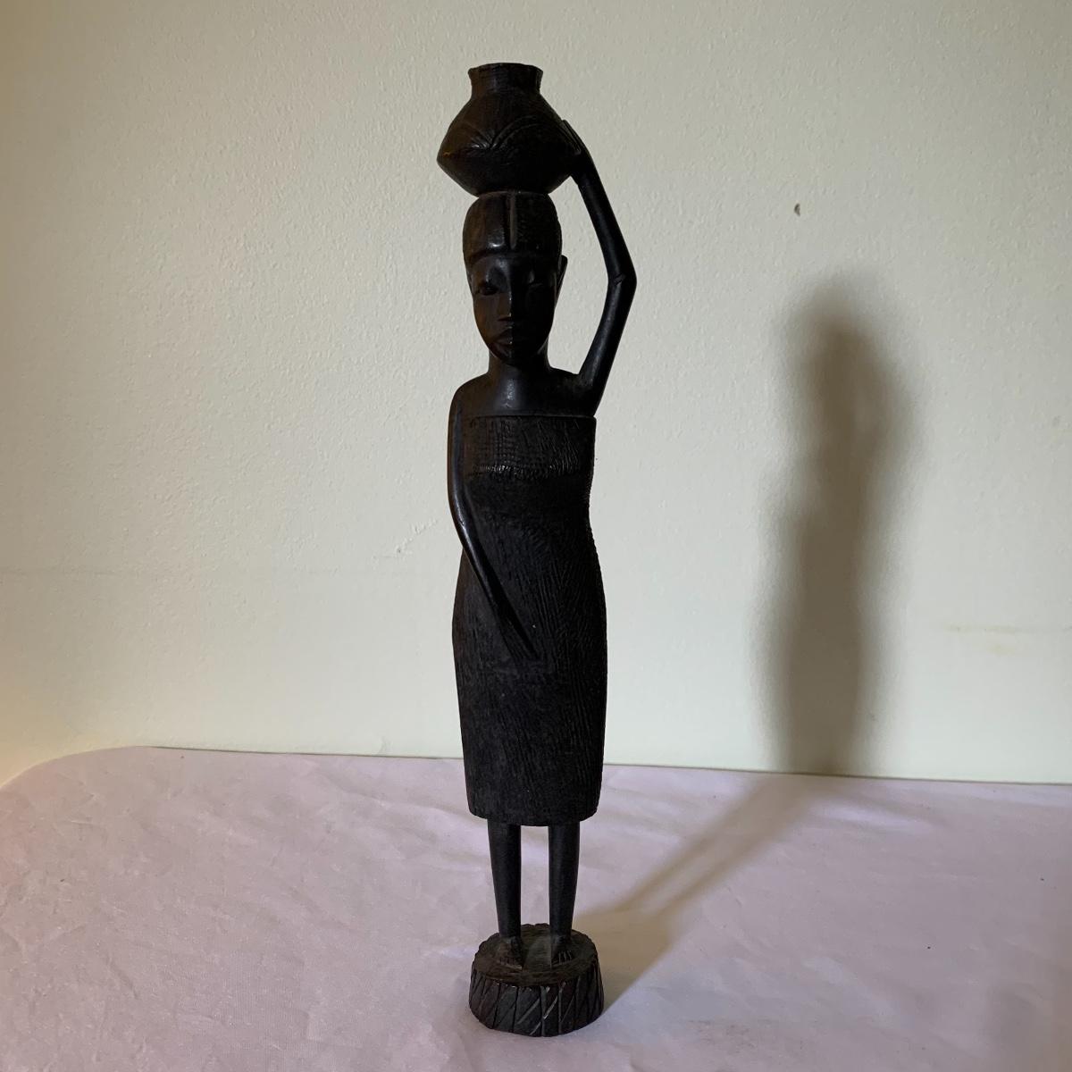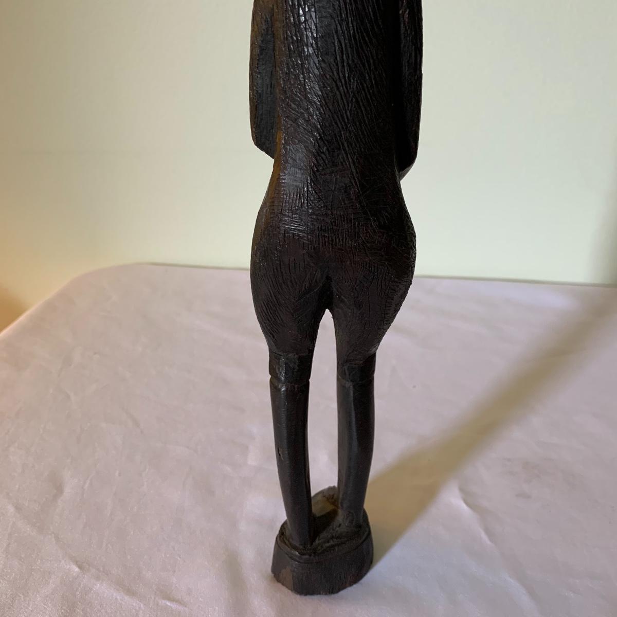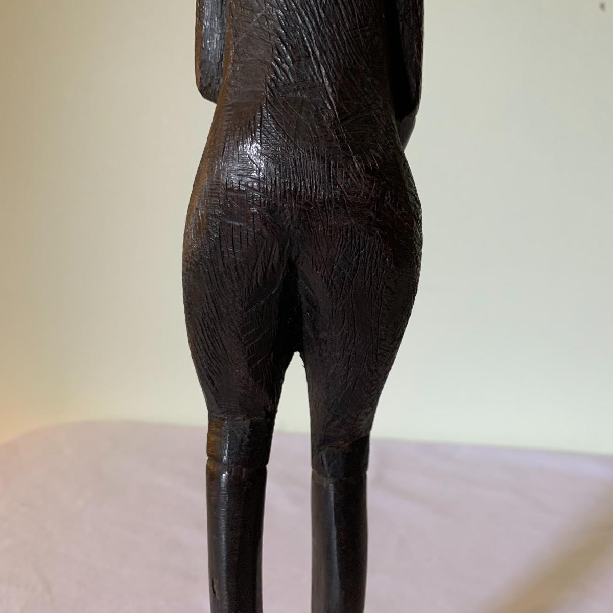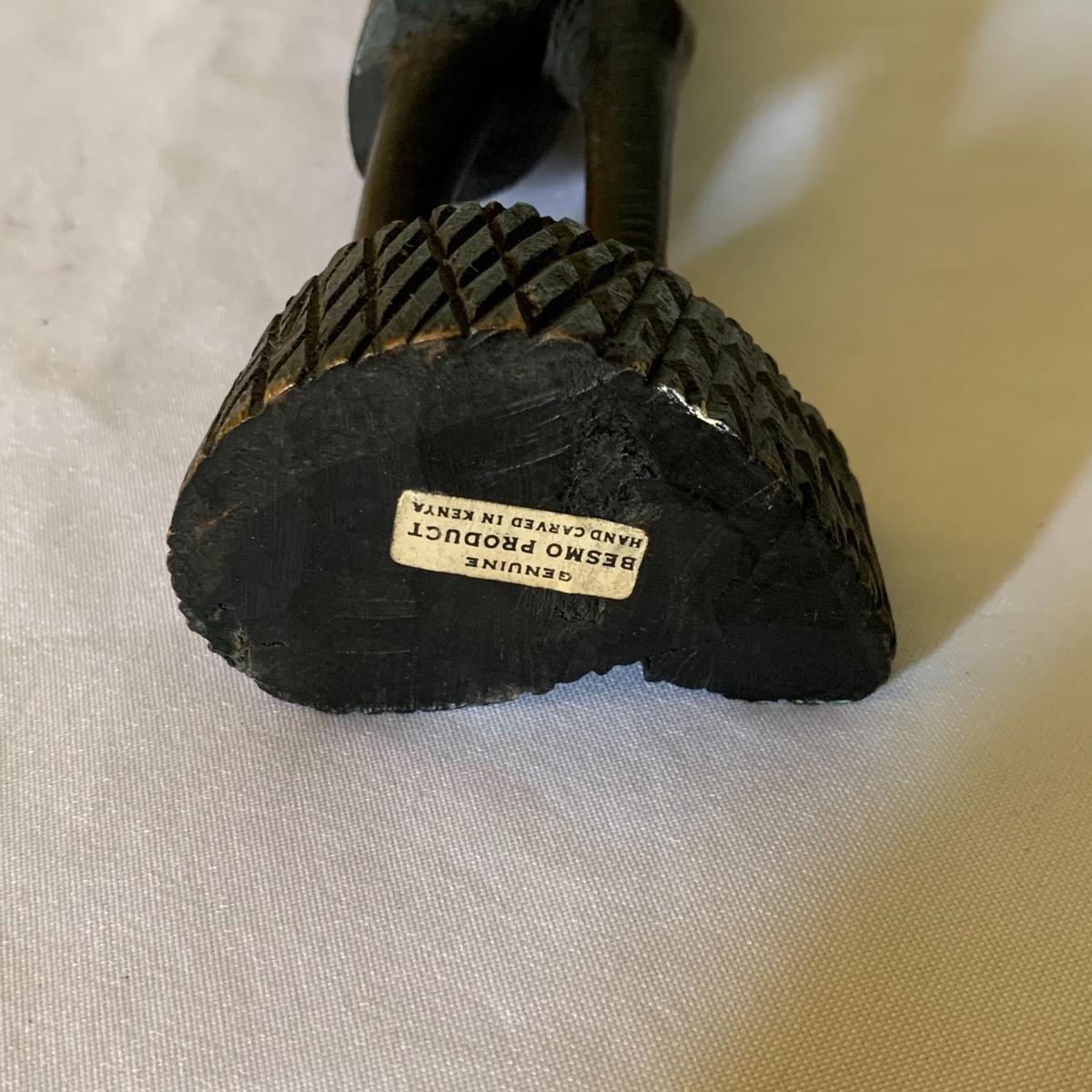 This lot includes four carved wooden statuettes. Three of them are a matching set that have stickers on the bottom that say “Genuine Besmo Product Handcarved in Kenya”. These three measure about 14” tall. One of these is top heavy and needs help standing upright. It needs a very flat surface to stand upright. The fourth statuette fits in with the others, but it not part of the same set. It is smaller (7”) and lightweight and has no label regarding its origins. Shipping available.