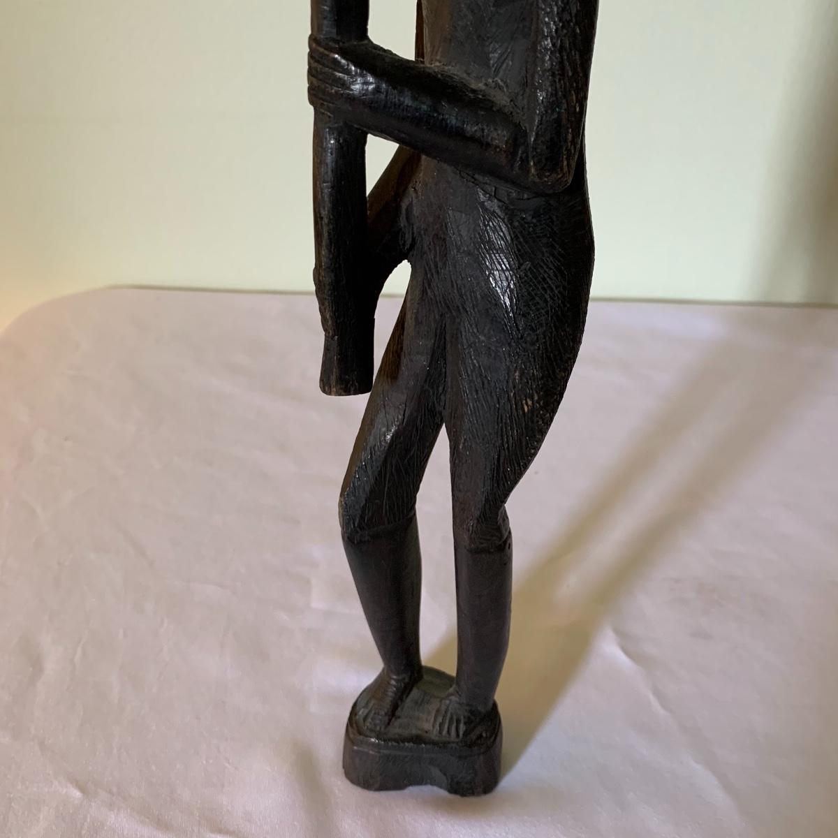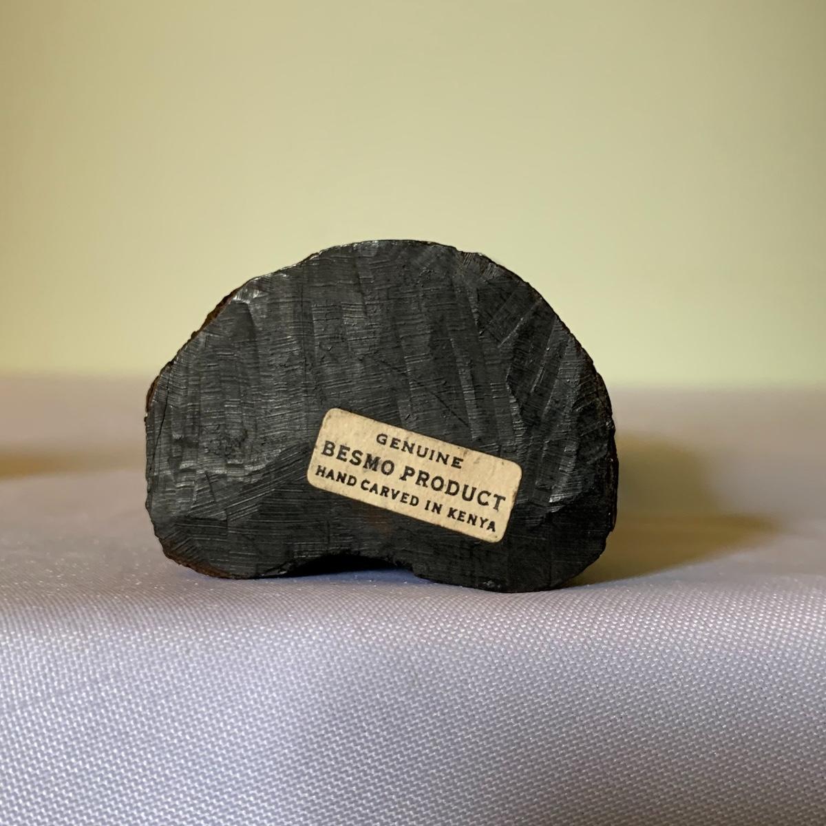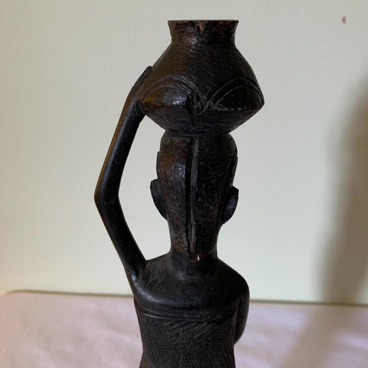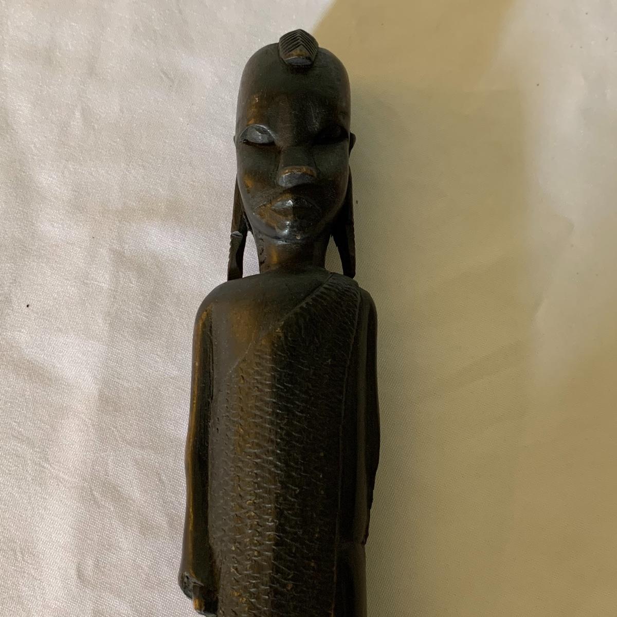 This lot includes four carved wooden statuettes. Three of them are a matching set that have stickers on the bottom that say “Genuine Besmo Product Handcarved in Kenya”. These three measure about 14” tall. One of these is top heavy and needs help standing upright. It needs a very flat surface to stand upright. The fourth statuette fits in with the others, but it not part of the same set. It is smaller (7”) and lightweight and has no label regarding its origins. Shipping available.