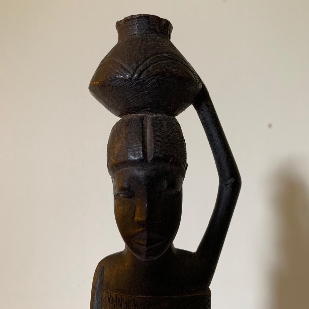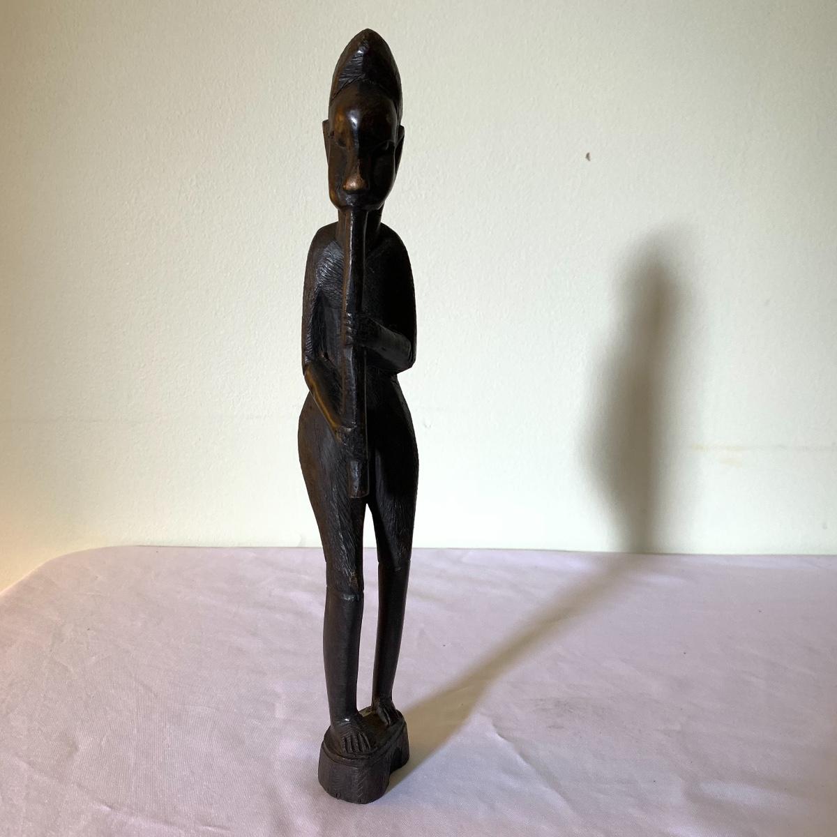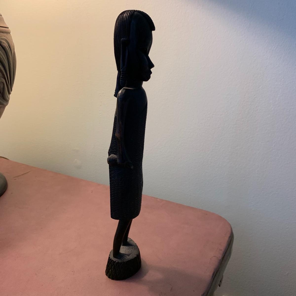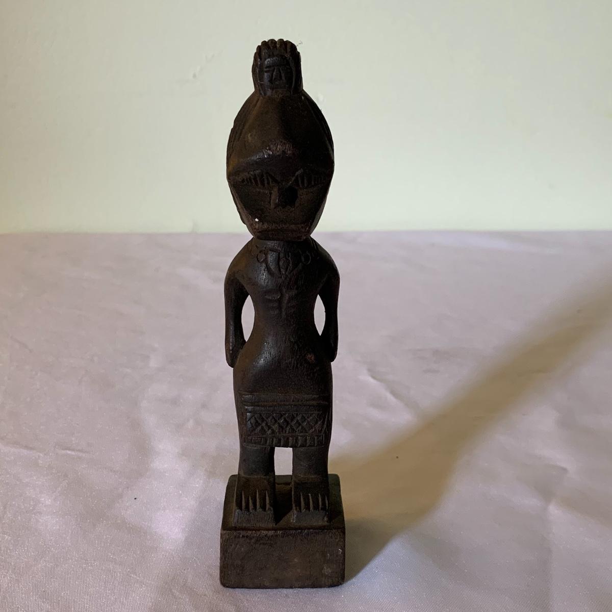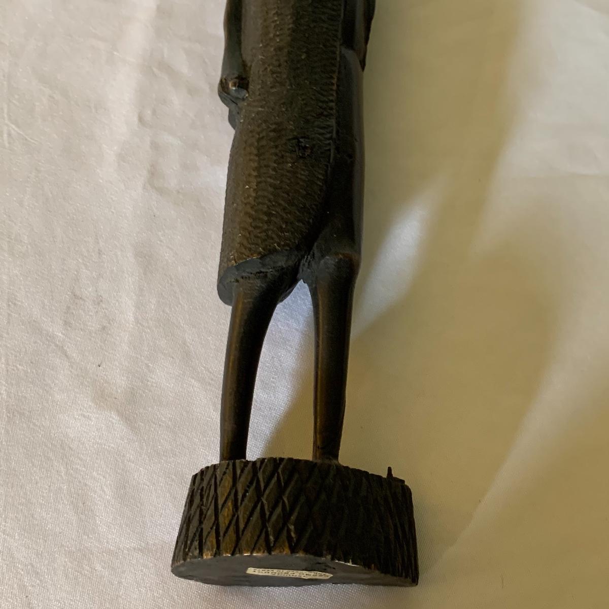 This lot includes four carved wooden statuettes. Three of them are a matching set that have stickers on the bottom that say “Genuine Besmo Product Handcarved in Kenya”. These three measure about 14” tall. One of these is top heavy and needs help standing upright. It needs a very flat surface to stand upright. The fourth statuette fits in with the others, but it not part of the same set. It is smaller (7”) and lightweight and has no label regarding its origins. Shipping available.