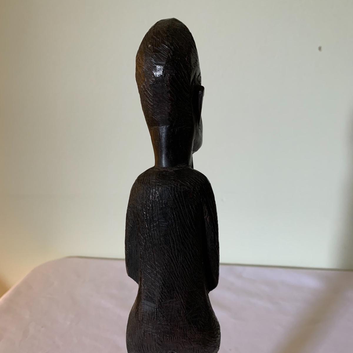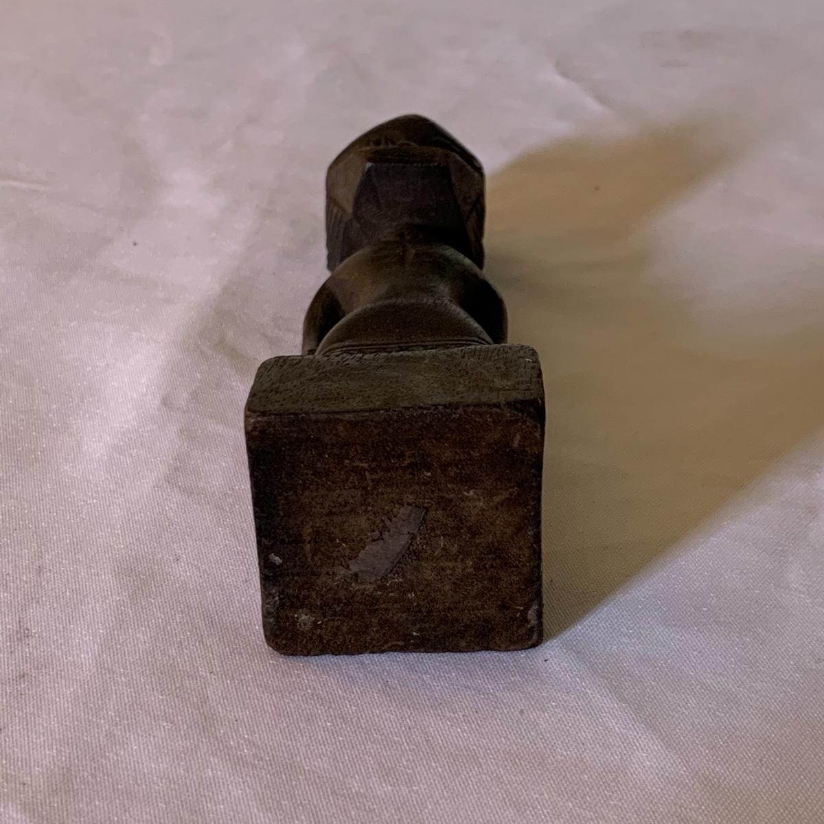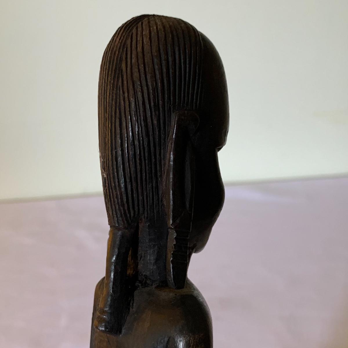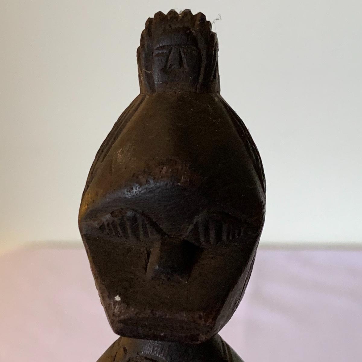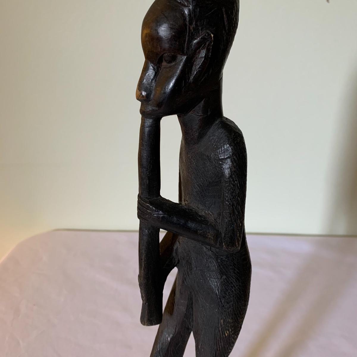 This lot includes four carved wooden statuettes. Three of them are a matching set that have stickers on the bottom that say “Genuine Besmo Product Handcarved in Kenya”. These three measure about 14” tall. One of these is top heavy and needs help standing upright. It needs a very flat surface to stand upright. The fourth statuette fits in with the others, but it not part of the same set. It is smaller (7”) and lightweight and has no label regarding its origins. Shipping available.