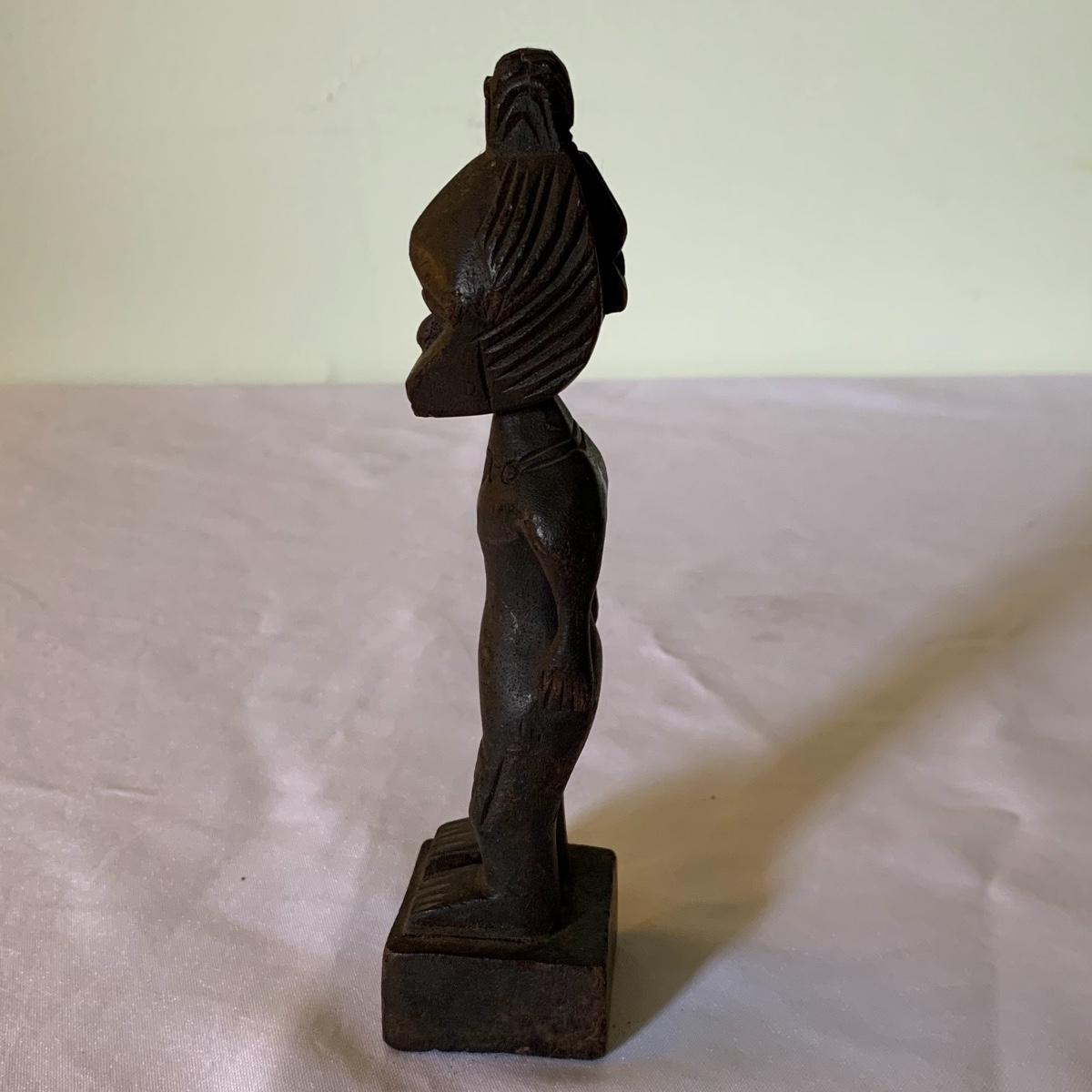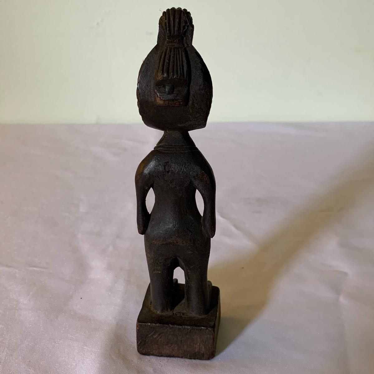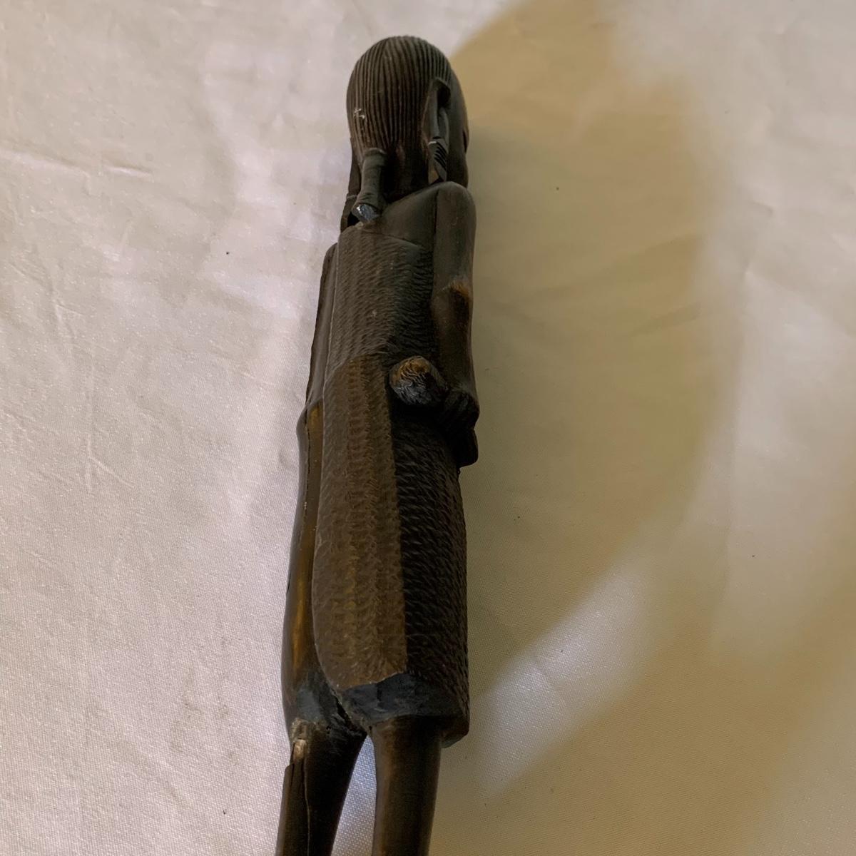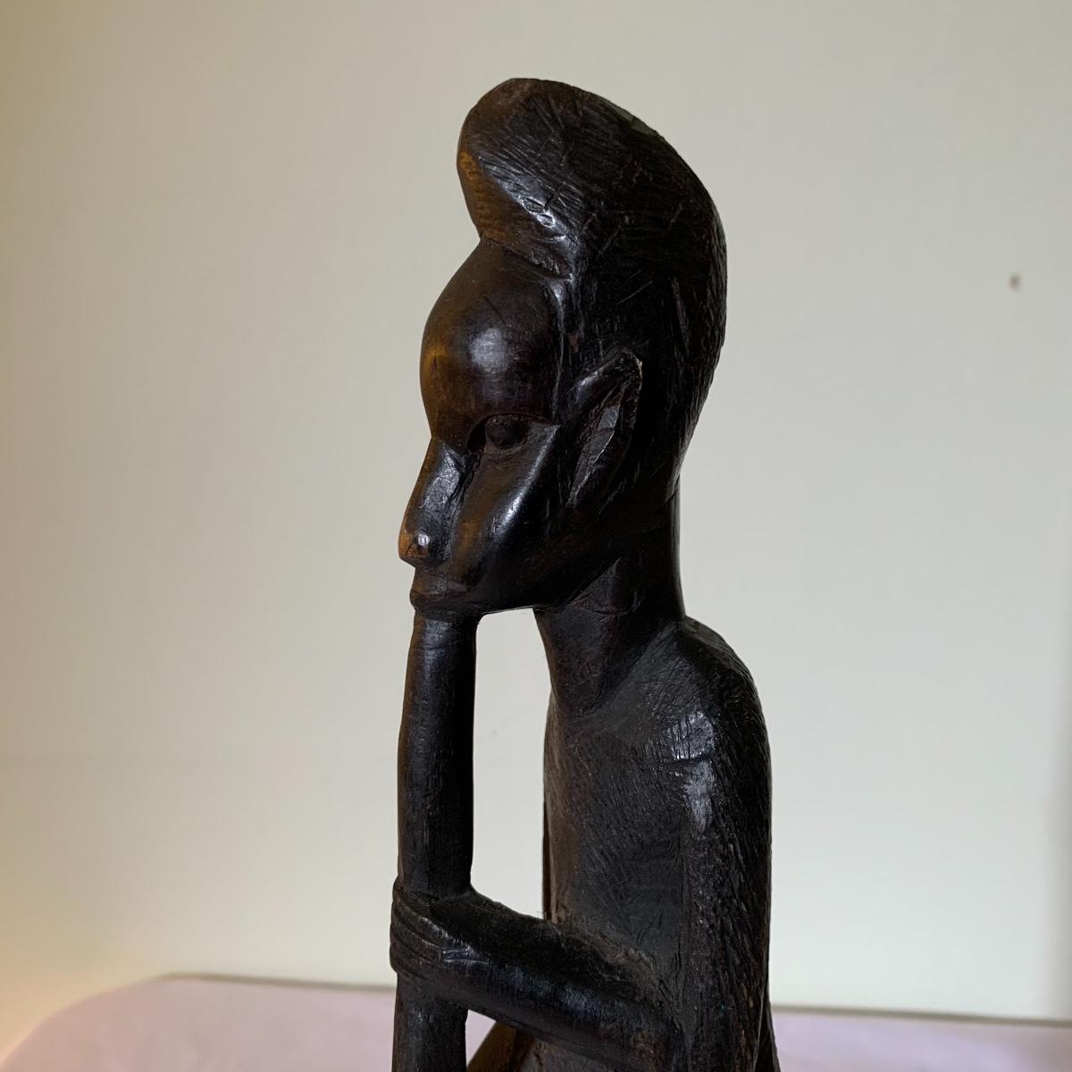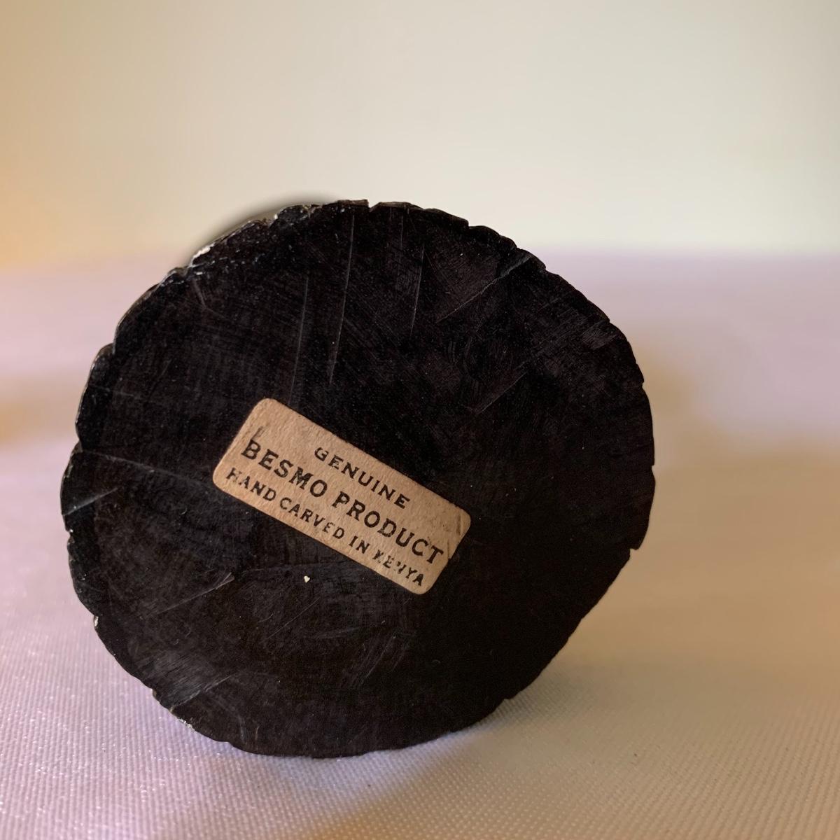 This lot includes four carved wooden statuettes. Three of them are a matching set that have stickers on the bottom that say “Genuine Besmo Product Handcarved in Kenya”. These three measure about 14” tall. One of these is top heavy and needs help standing upright. It needs a very flat surface to stand upright. The fourth statuette fits in with the others, but it not part of the same set. It is smaller (7”) and lightweight and has no label regarding its origins. Shipping available.