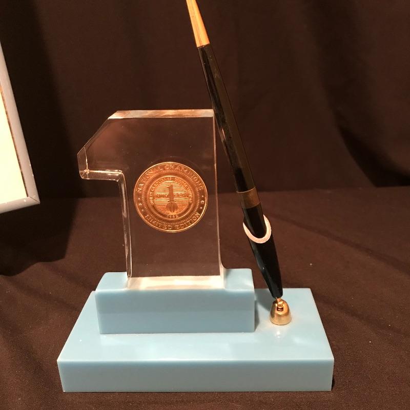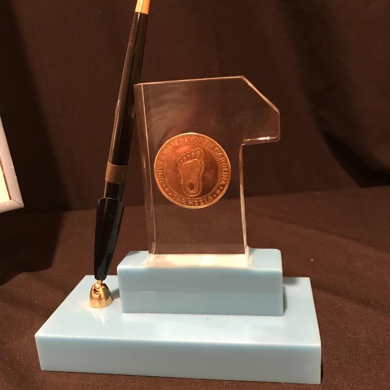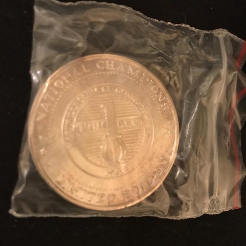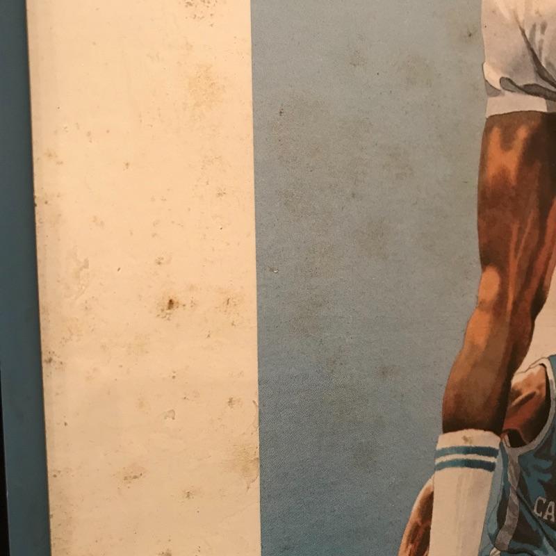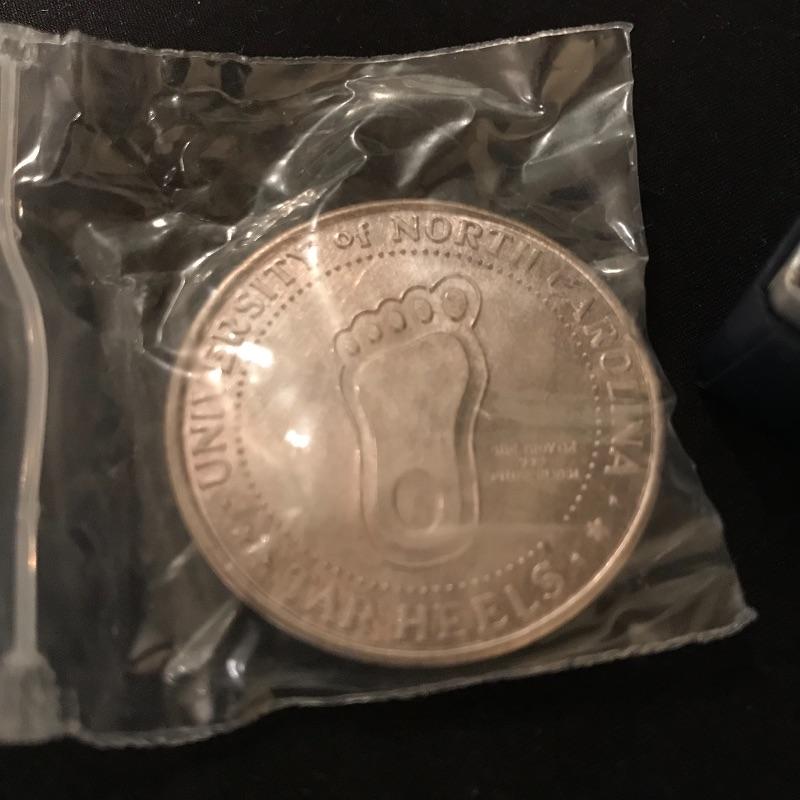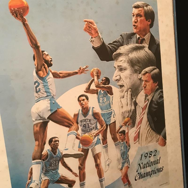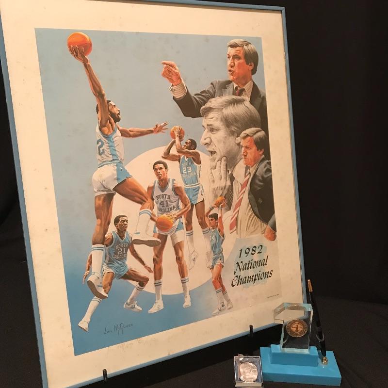 Large montage of the major players of the 1982 National Champions in a Carolina Blue metal frame. Number 40/1100. Frame measures approximately 20.25” x 24.25”. The glass is a little dusty, art itself appears to have spots of discoloration throughout. See photos. Lot also includes two coins commemorating the 1982 win over Georgetown 63-62. One coin is encased in a heavy plastic #1 pen holder and the other is still wrapped in plastic with presumably its original box, ready to be gifted if desired. Shipping available, please call UPS at 828-252-6930 with dimensions for a shipping quote prior to bidding.