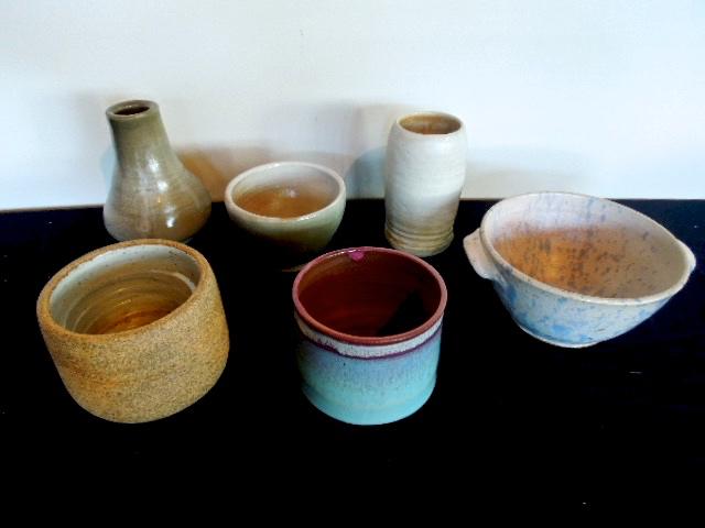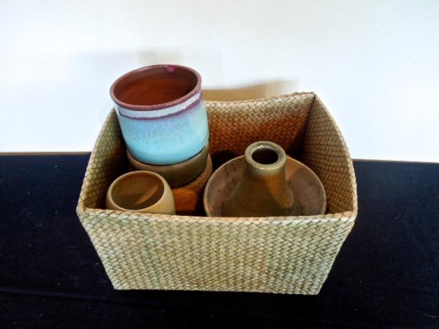 Group of 6 art pottery pieces. Stoneware clay in 9 x 11 woven grass box. No lids. Variety of techniques, shapes and glazes.