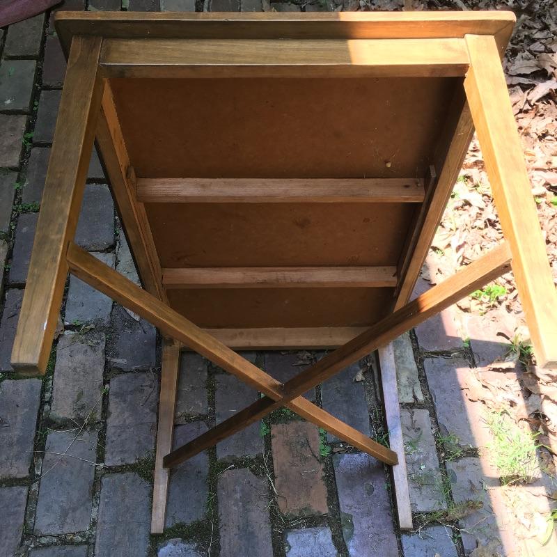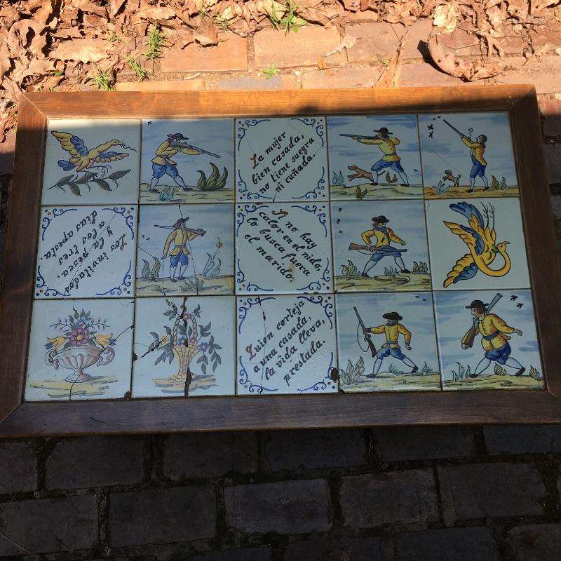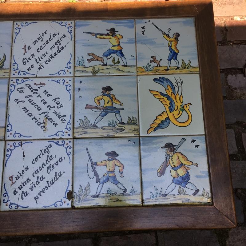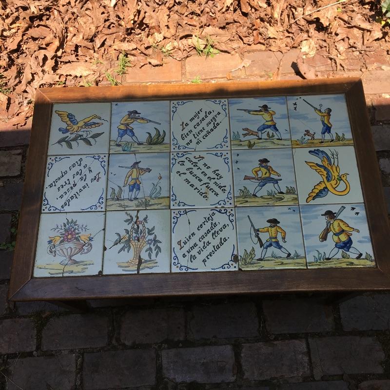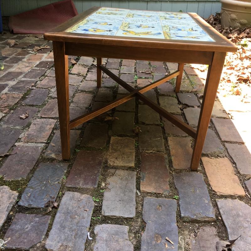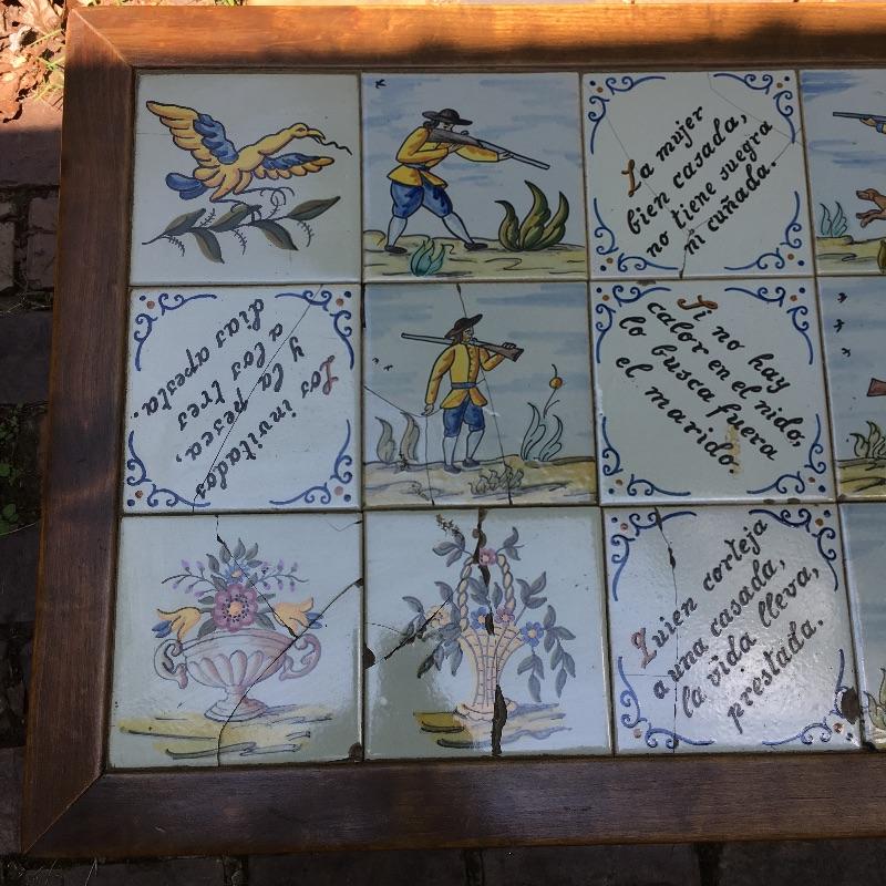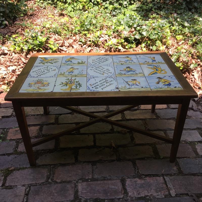 Lovely wooden table with Spanish tile top. This well made table is sure to get the conversation started with it’s unusual tiles. Tile has some cracks, see pictures. Table measures 21.75” x 33.5” x 17.75”.