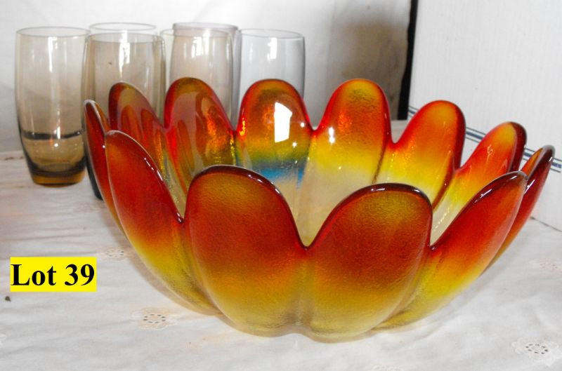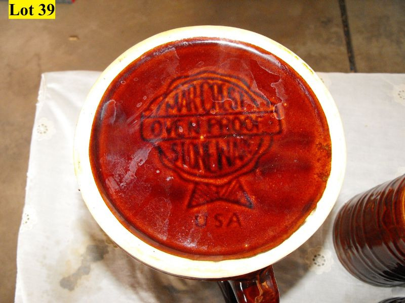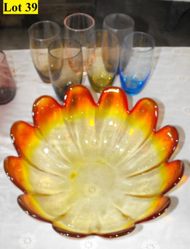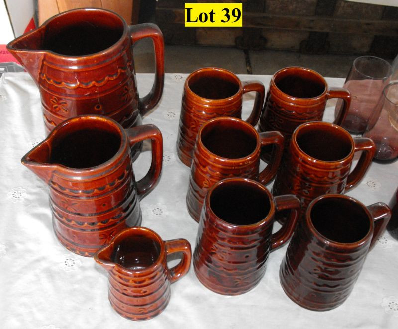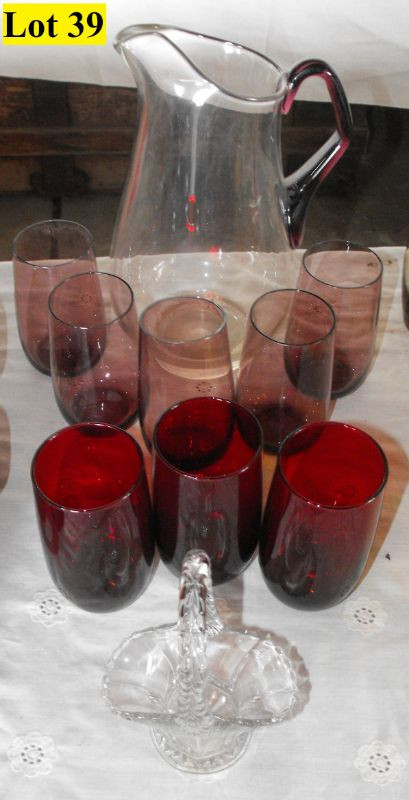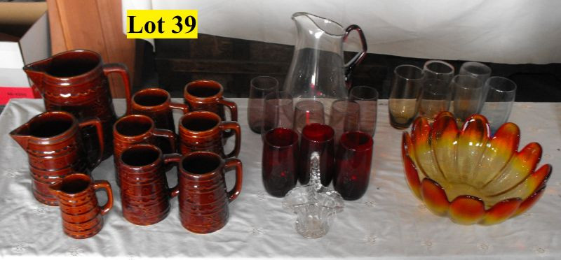 Brown Mar-Crest Stone Ware USA 3Pitchers and 6 Mugs in Very Good Condition. 5 Purple Drinking Glasses with Glass Pitcher that has a matching purple handle. 9 Colored Glass Drinking Glasses, Glass Basket, Glass Serving Bowl with Scallop Edge