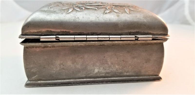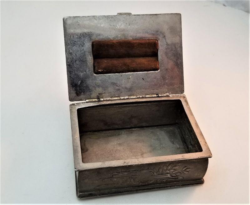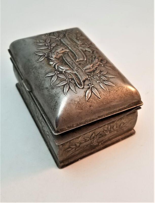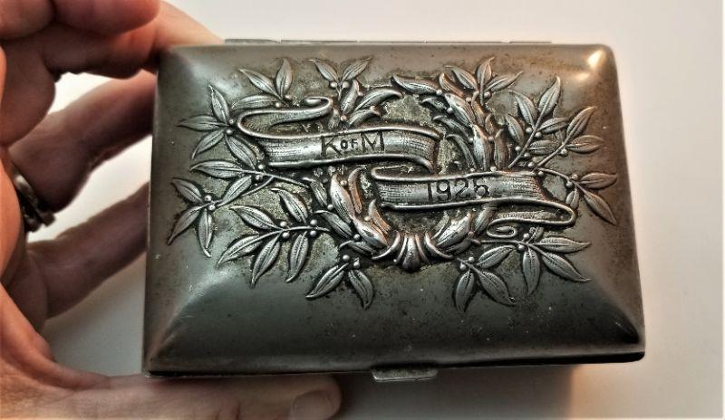 This one has a few age-related issues, but when will you see another one? K of M (Momus), dated 1926 - pot metal cigarette box. 4" across - 2" tall - 2.5" deep. It's "smiling, meaning the hinges are sprung a bit so it doesn't completely close. Note the little "humidor" touch on the inside. Please check out all photos. Very scarce in any condition.
