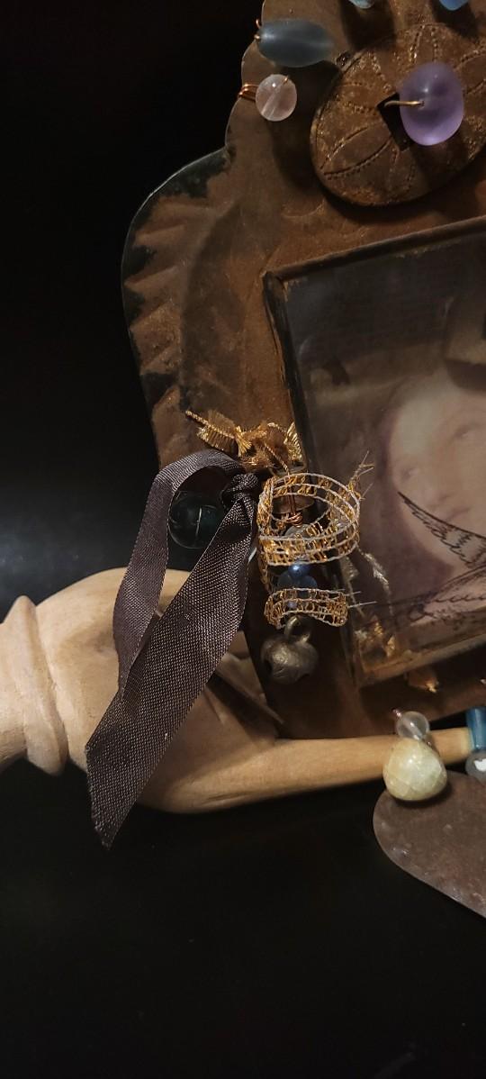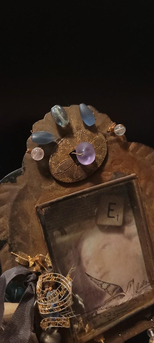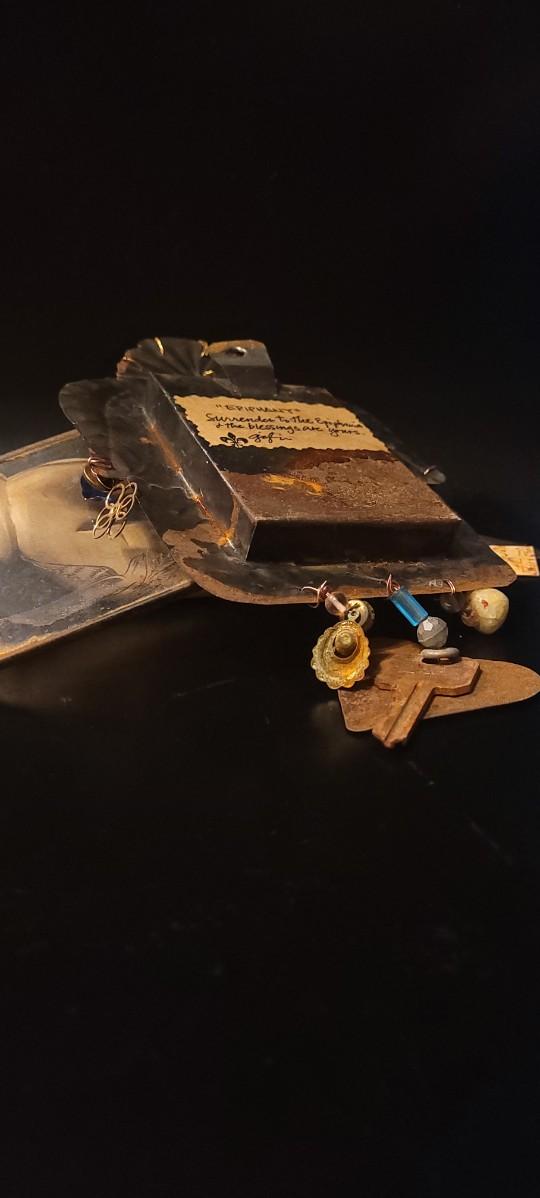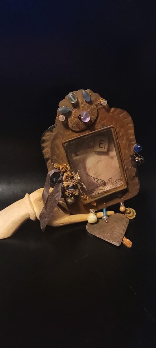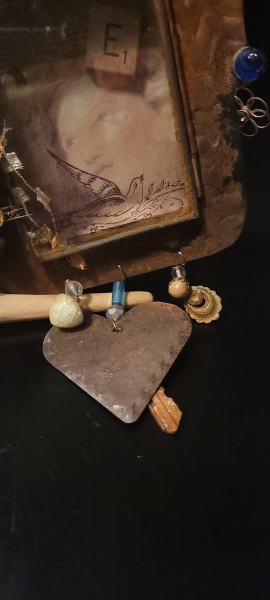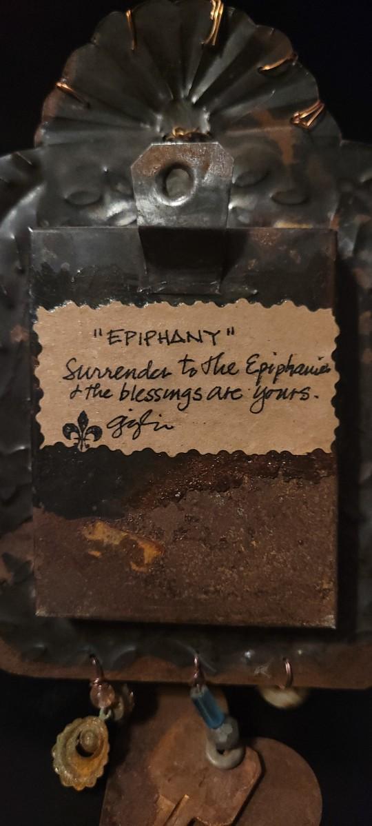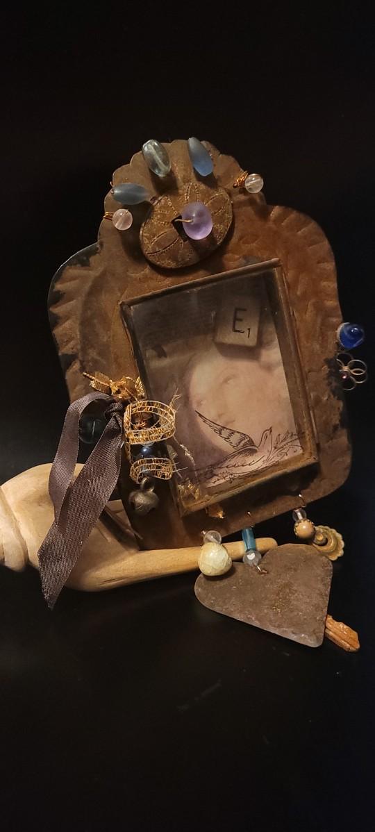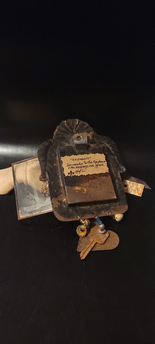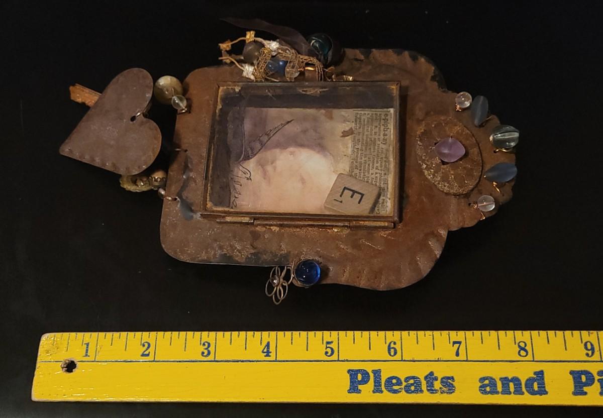 Nice Folk Art style Hanging Metal Altar Box with swinging glass window.