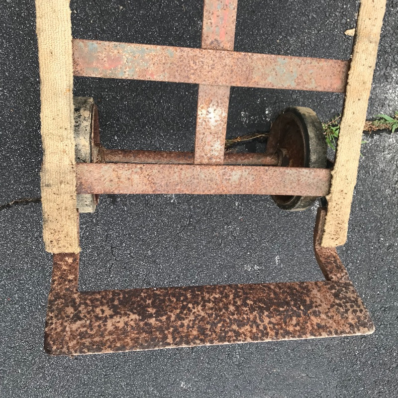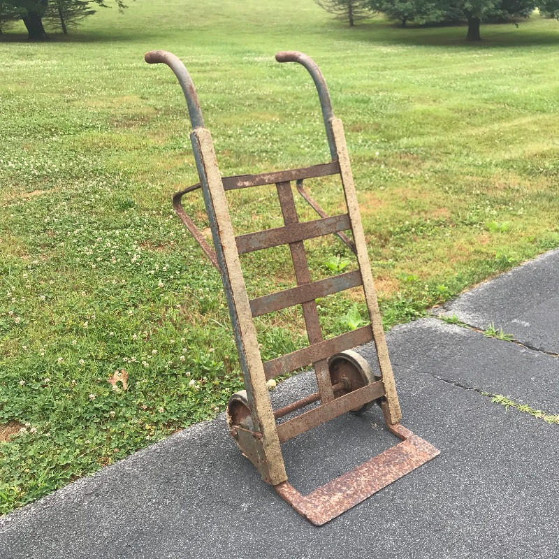 This heavy duty vintage hand truck still has plenty of life left in it for the toughest of jobs. Save your back and have this truck do the work for you and when you are not using it, it will look great as outside decor! It does have rust throughout, but this substantial hand truck appears just as sturdy as a new one. Comes with hard plastic wheels so you can throw that pump away. The handles stand 45” high when upright.