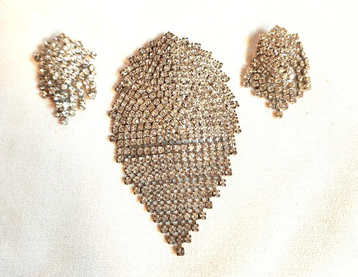 Super Blingy Vintage Rhinestone Brooch and matching clip Earring set - a statement piece - Unmarked. Brooch is 4.5" long. Good condition . We will be posting a photo of Mrs. Fountain wearing this set to the White House during the Reagan Administration.