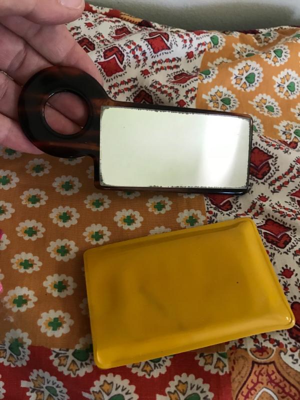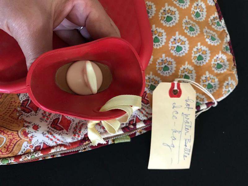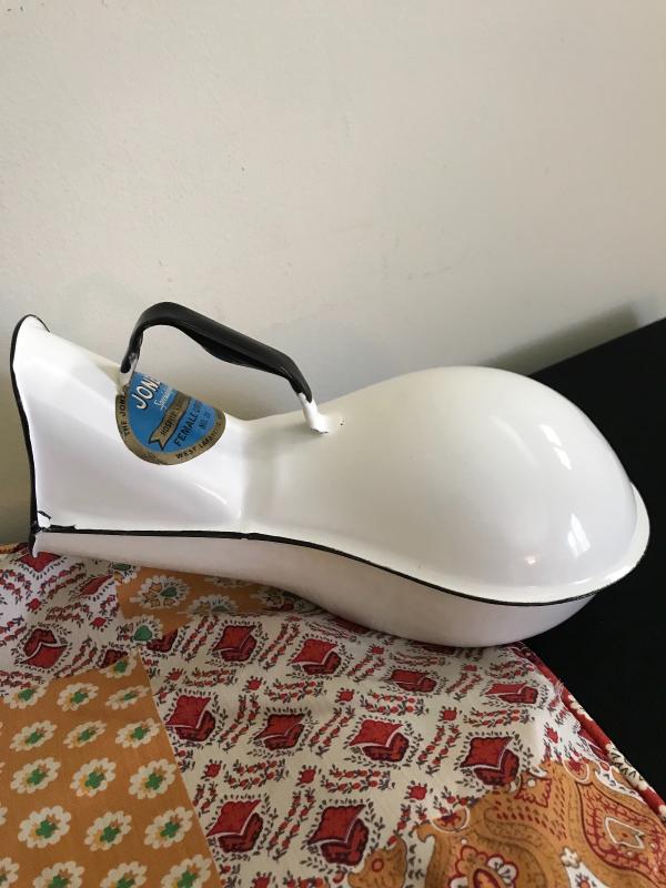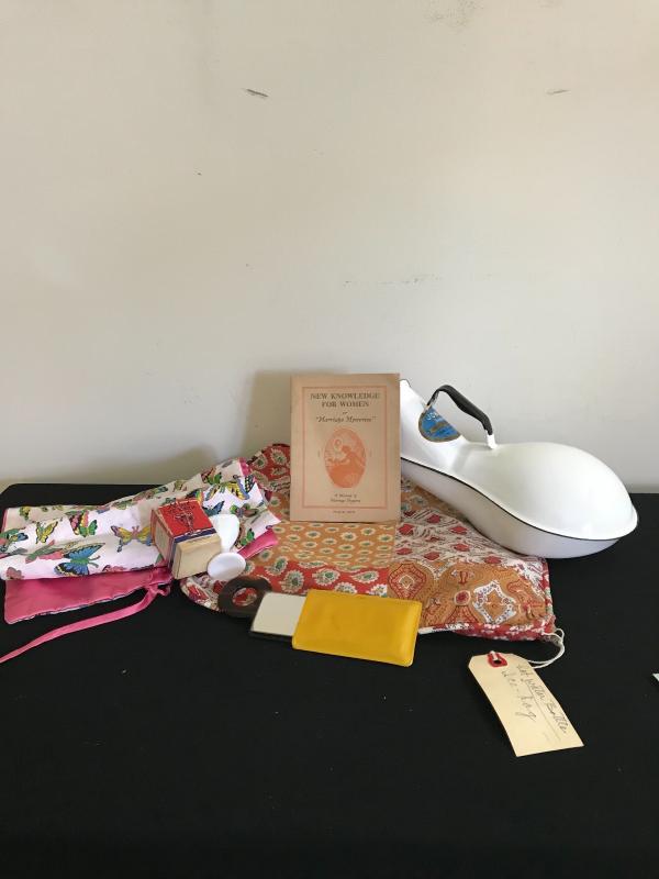 This amusing lot contains a “Manual for Marriage Hygiene” for women from 1933, a female hospital grade urinal, a quilt-covered hot water bottle that appears to be unused, a Lord & Taylor purse mirror, an eye wash chalice with box and a butterfly sack for personal items. Shipping available.