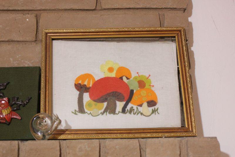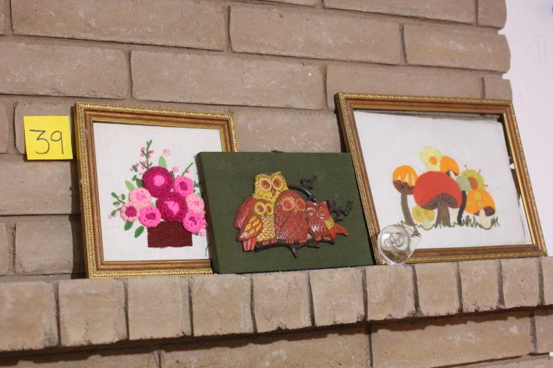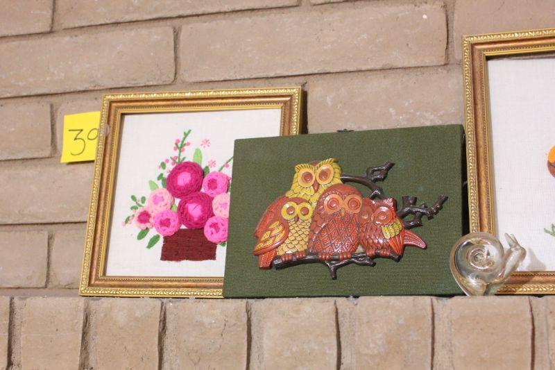 Lot 39 Vintage Yarn Framed Art, Glass Snail & Wood Owl Art